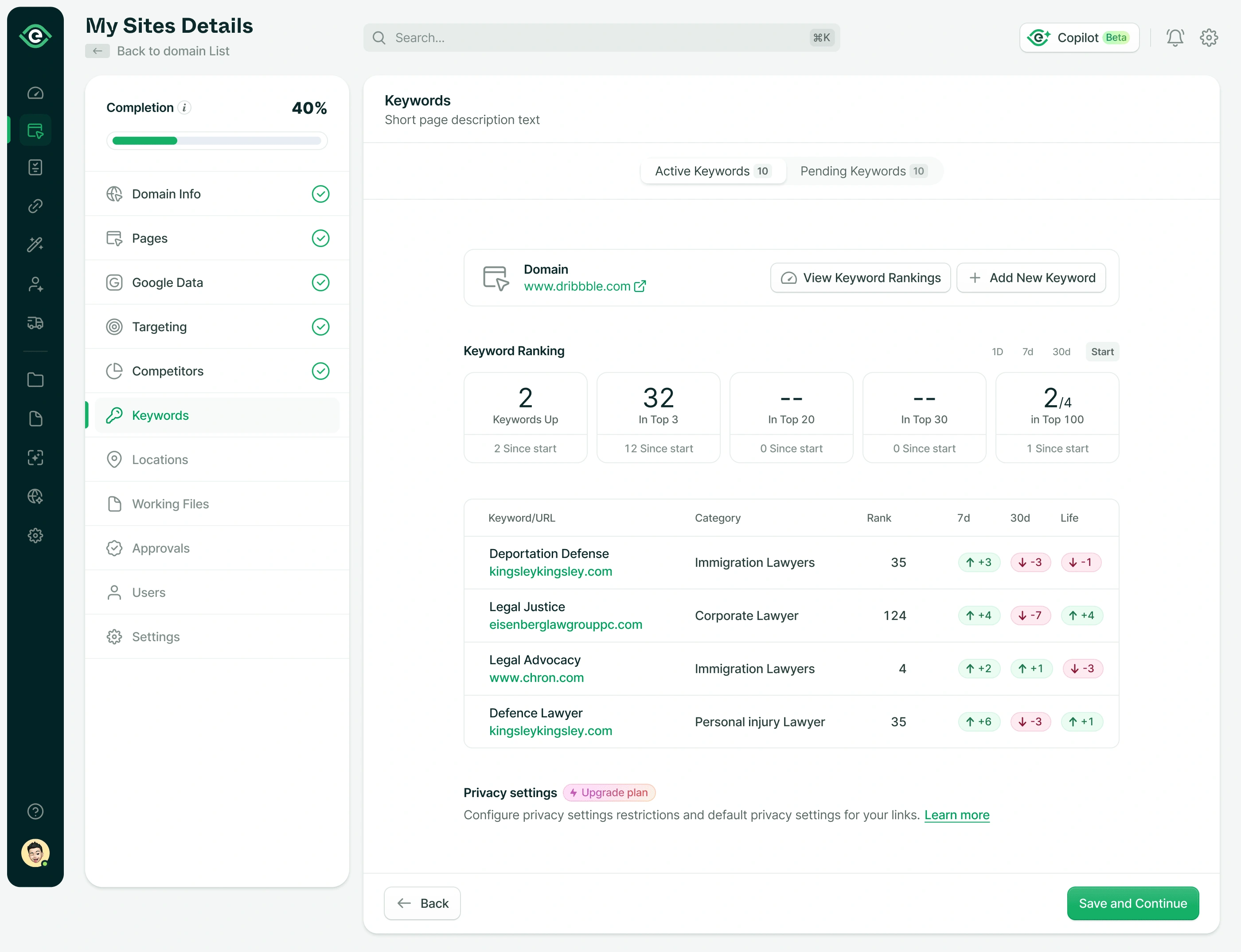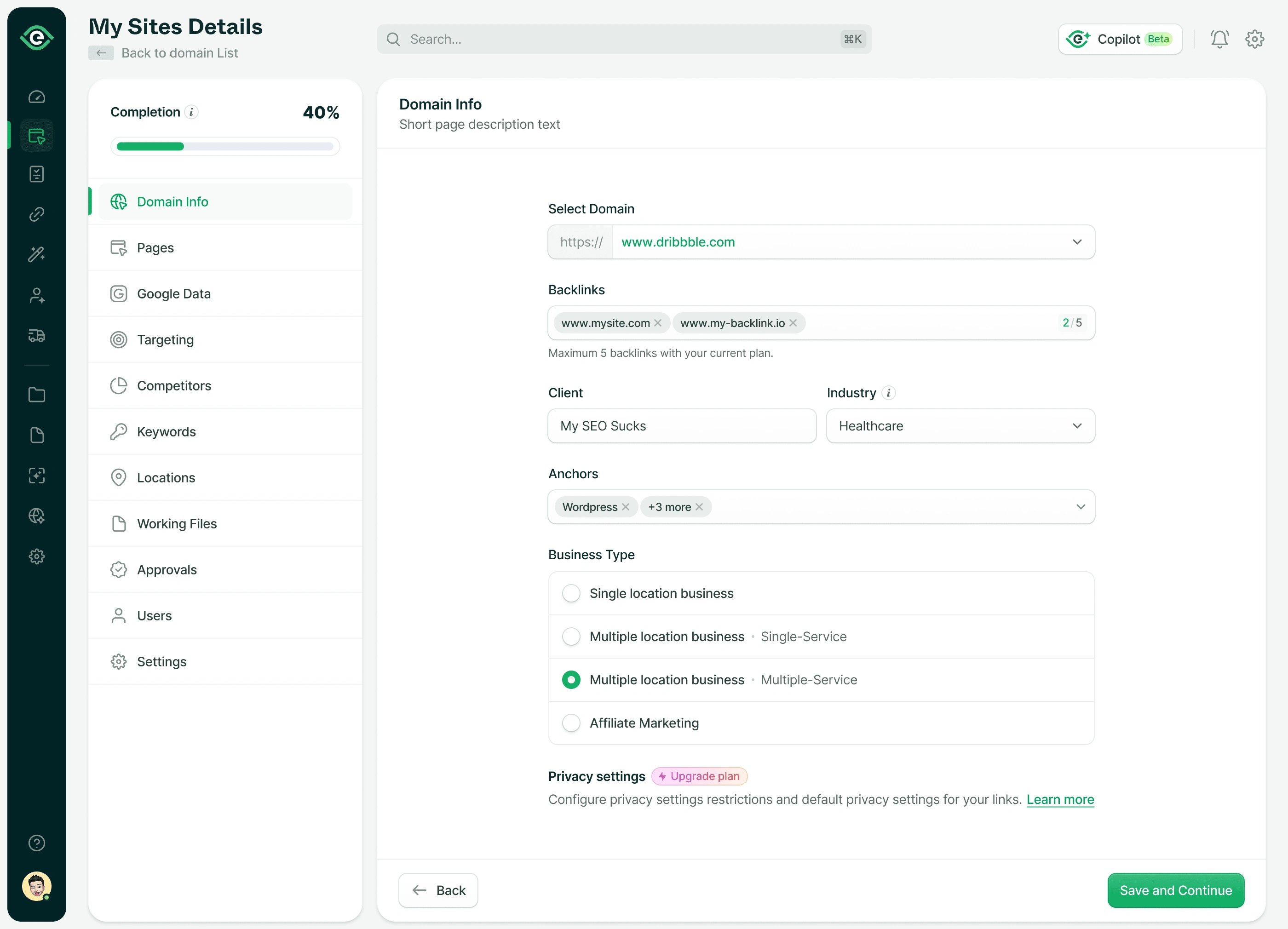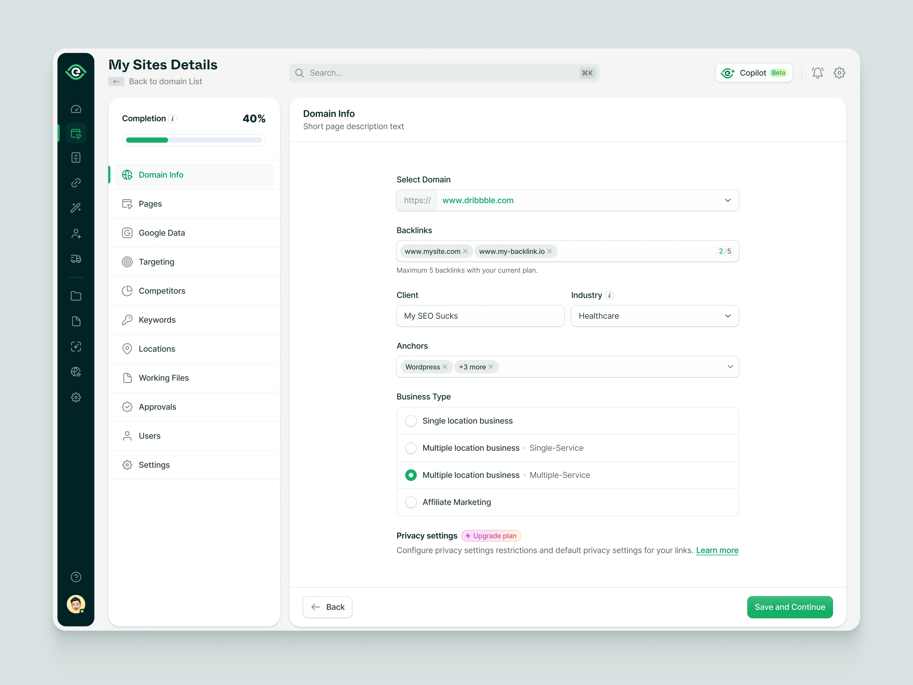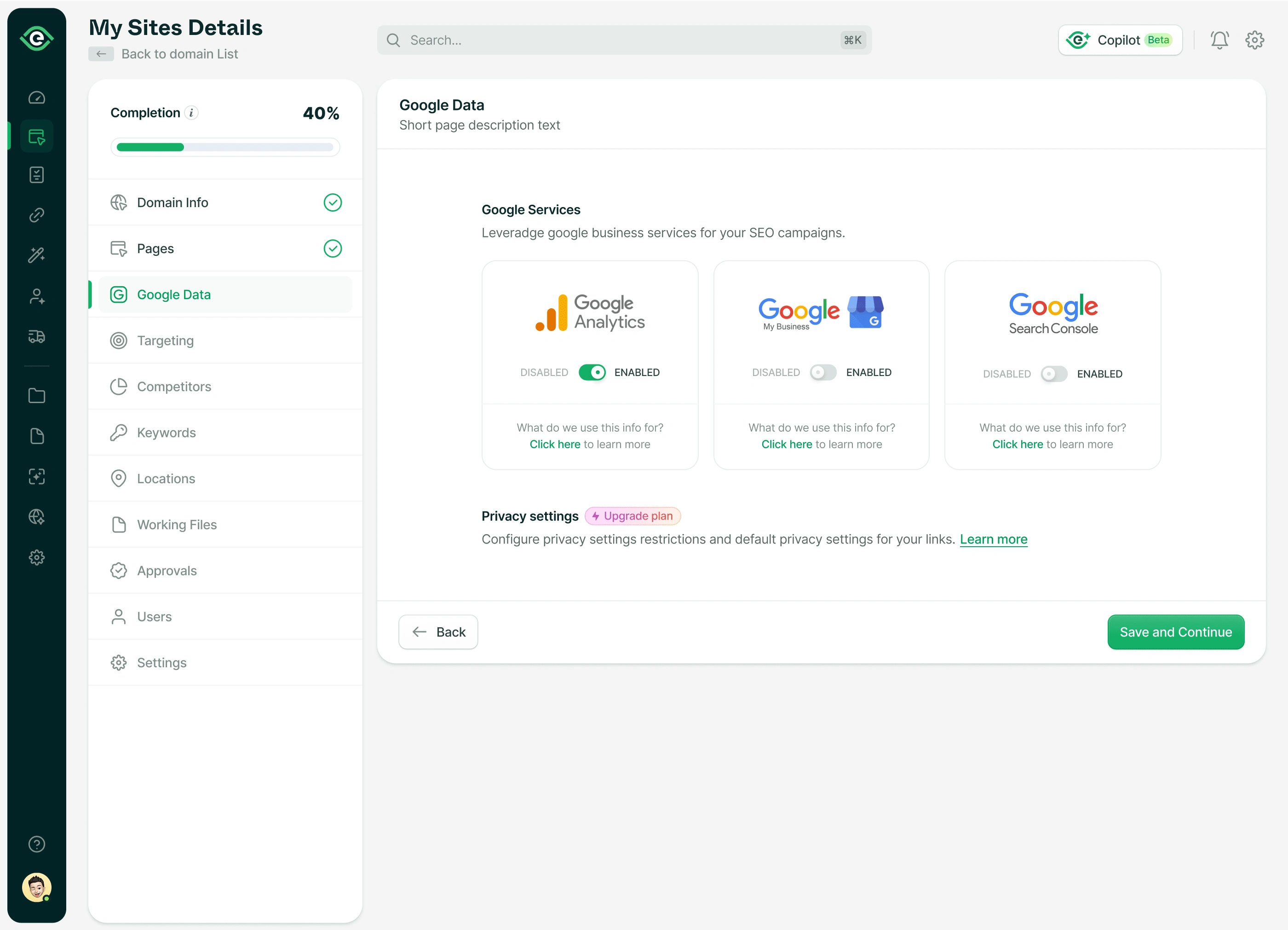 Excited to share with you a small part of a multi-step onboarding flow. Here, you can onboard your site on the SEO platform and all your links to it, like your Google Analytics services/Google Search Console, and then set your SEO goal and the competitors you want to smash in your SEO campaign.