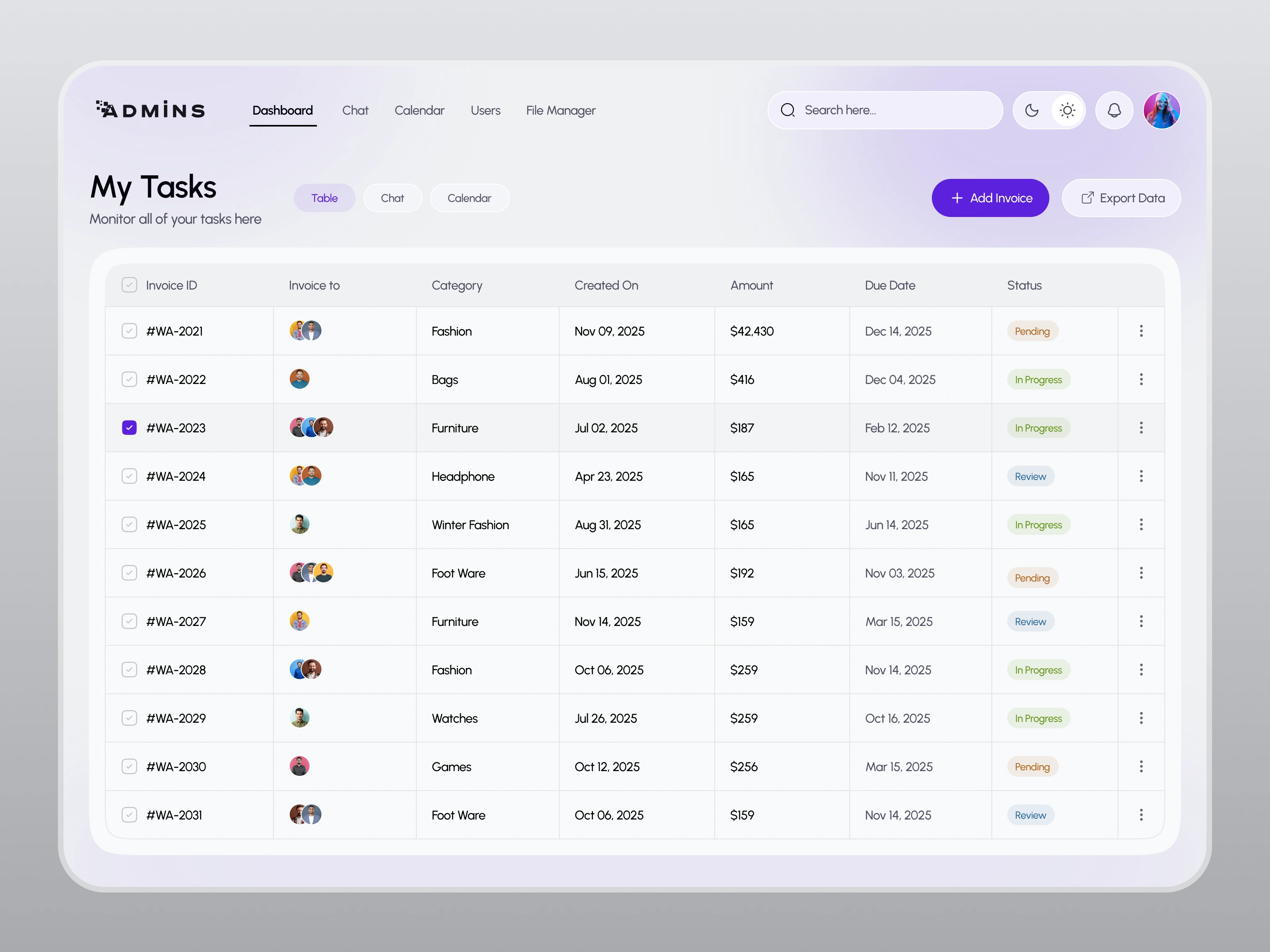 A clean and intuitive dashboard that simplifies task tracking and invoicing, helping businesses work faster, smarter, and with confidence.
