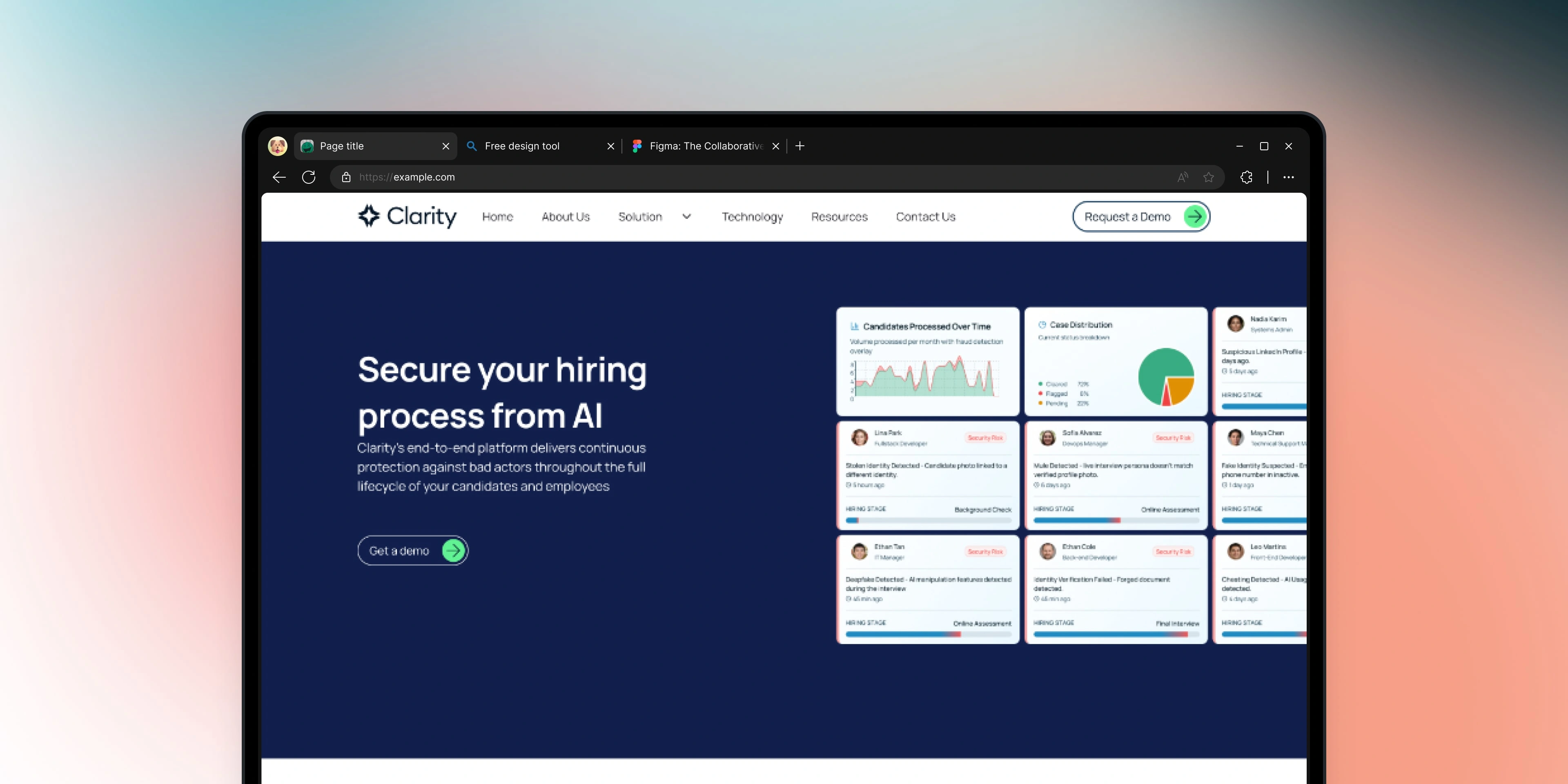 getclarity.ai) is a cybersecurity and identity-verification platform designed to protect organisations against hiring fraud, deepfakes, and synthetic identities. I worked on this project to structure, design, and develop the Clarity website in