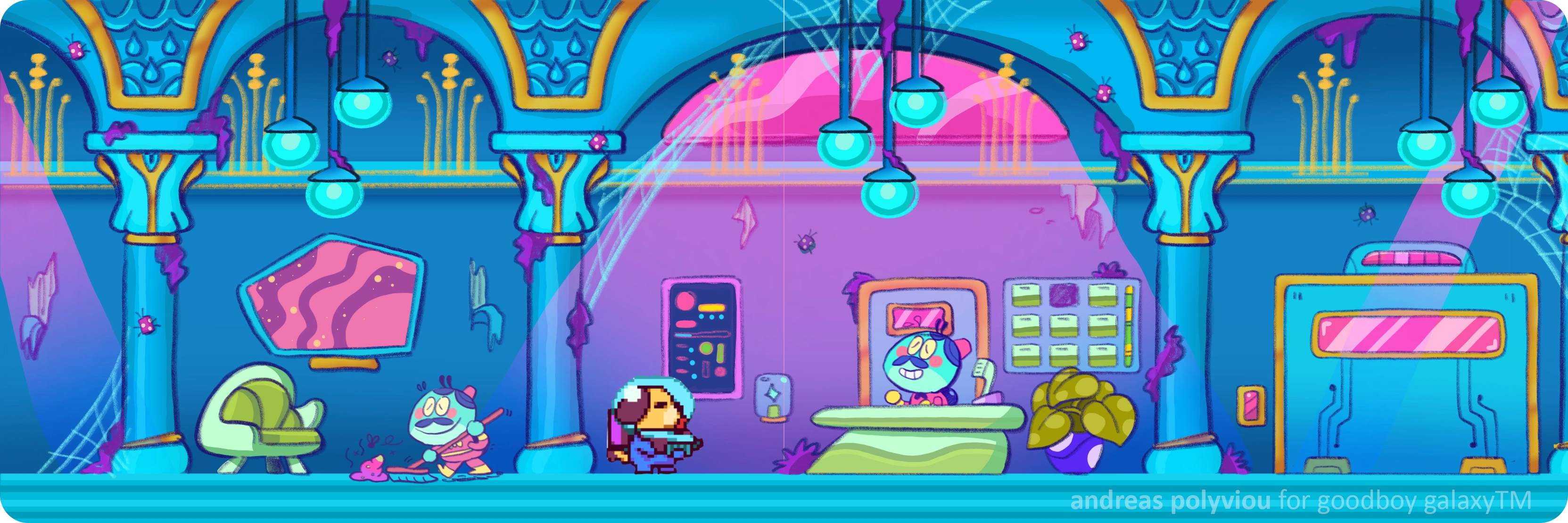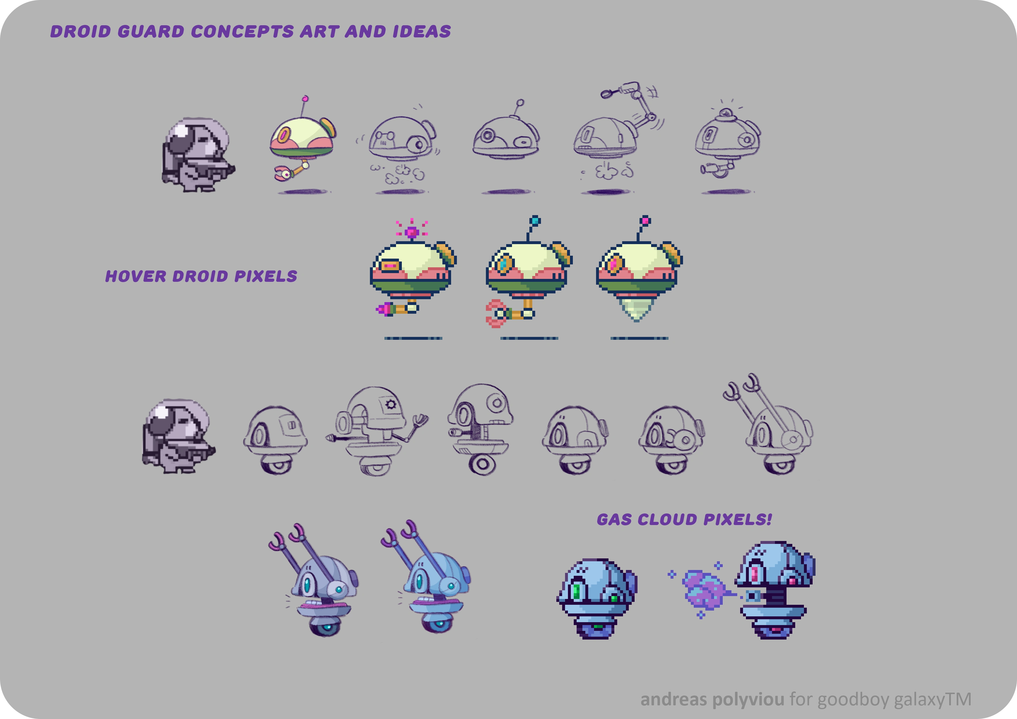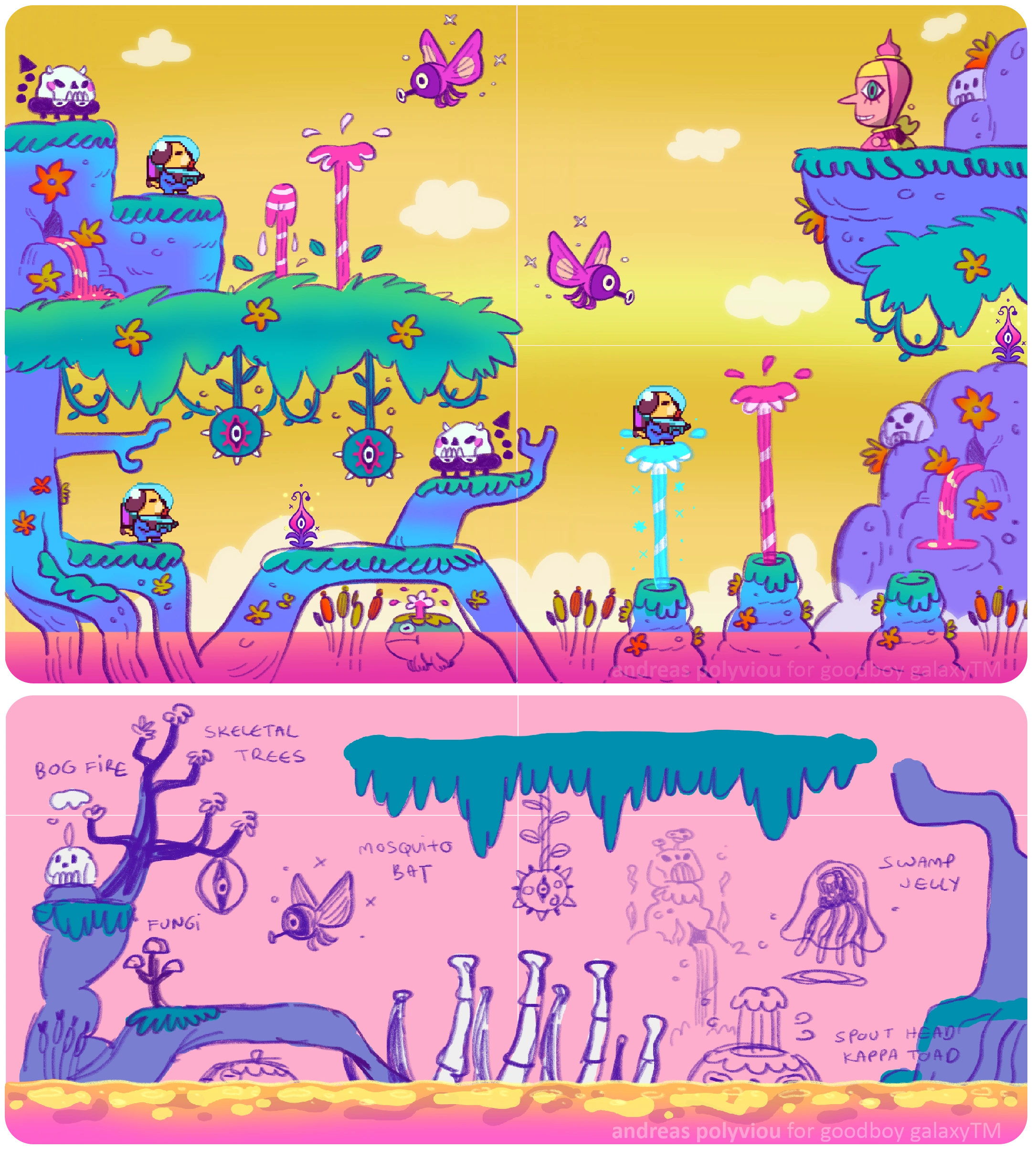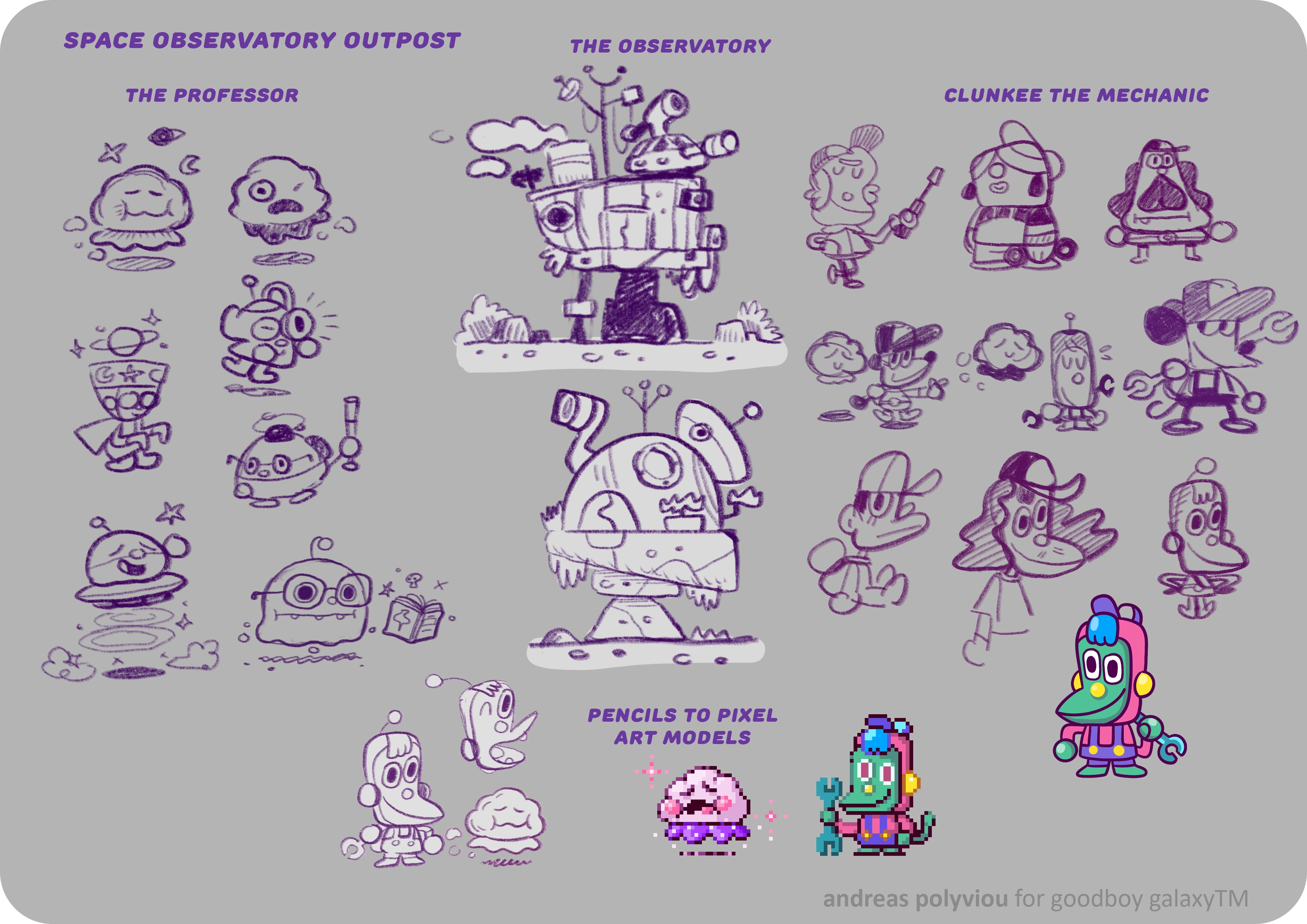 Goodboy Galaxy is an action adventure game designed for the Nintendo GBA, full of fun characters and strange new worlds to explore. I had the great pleasure of working on this game, creating characters, visualising worlds and helping out with story ideas. I made paintings and sketches, pixel art and animations and had an amazing time - please enjoy some of my work!
