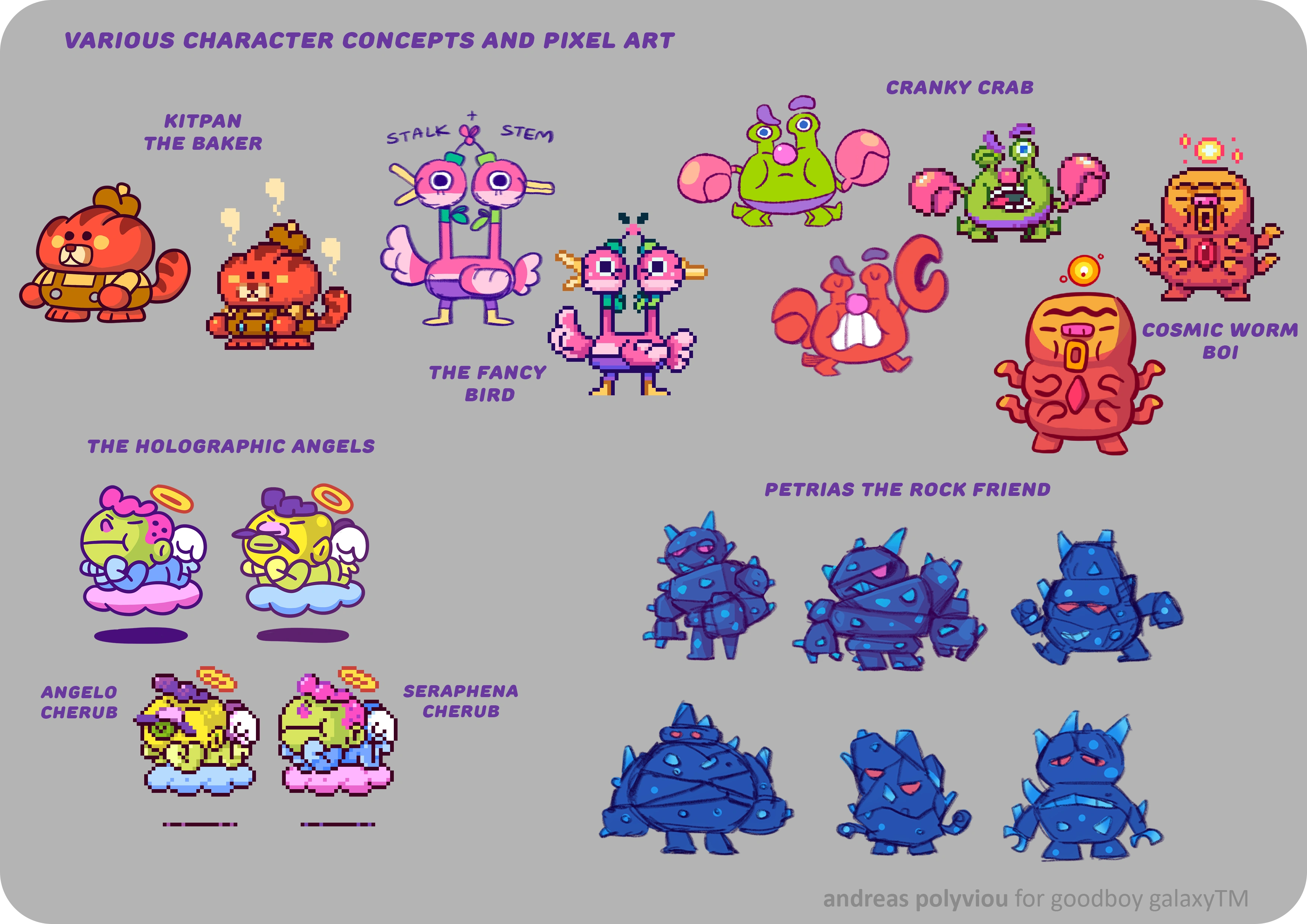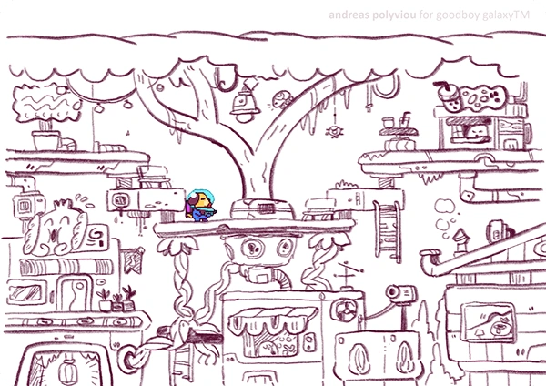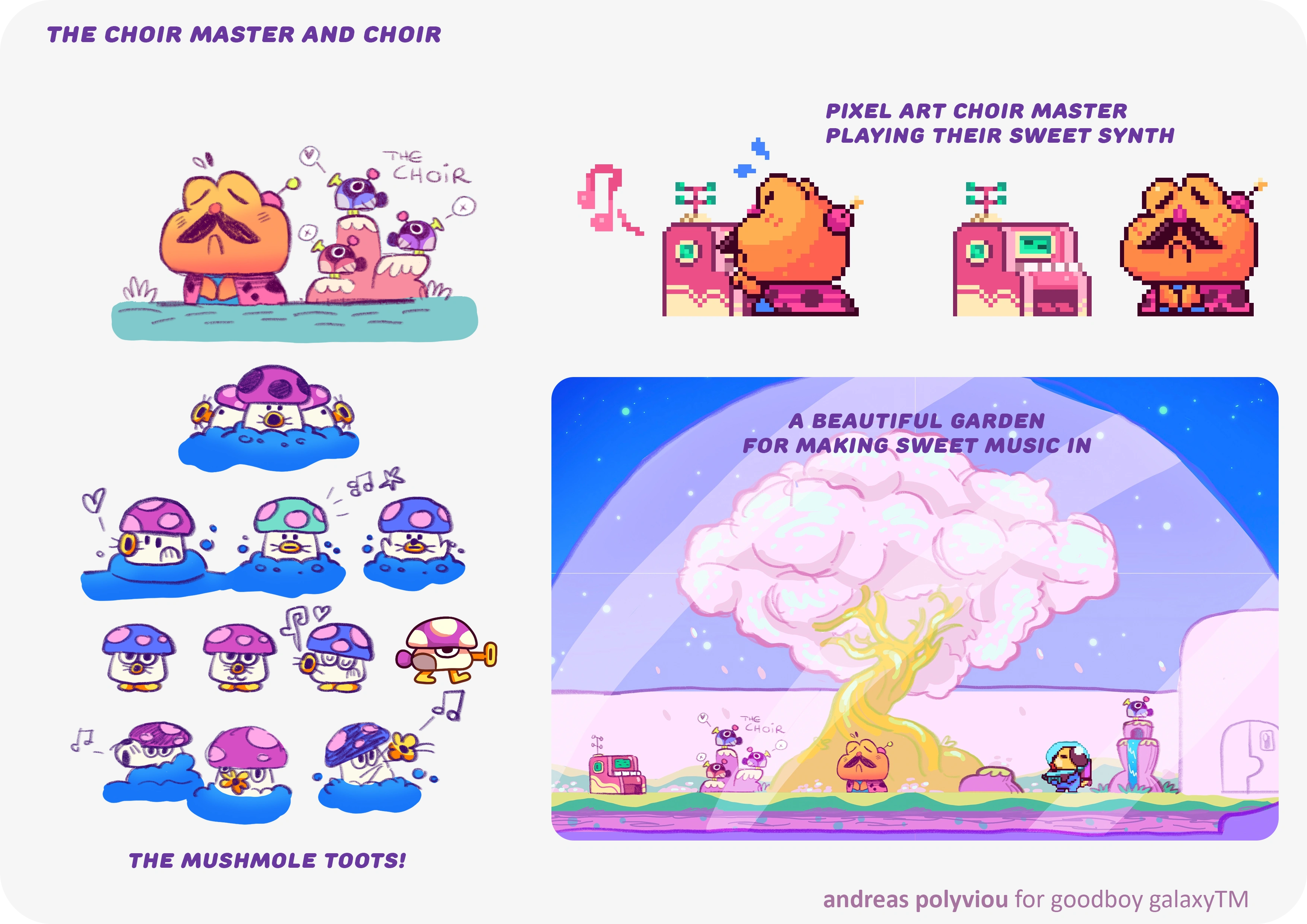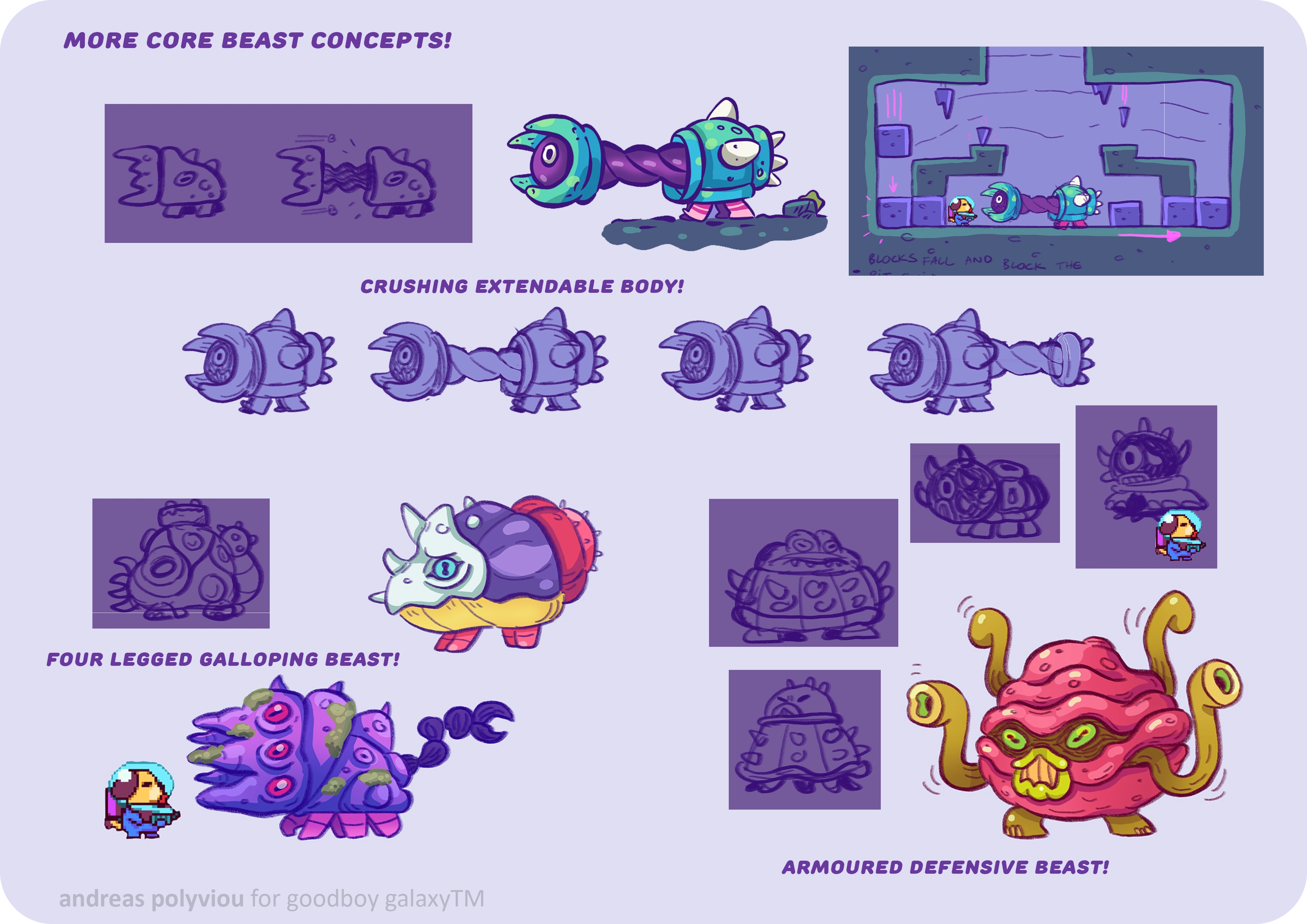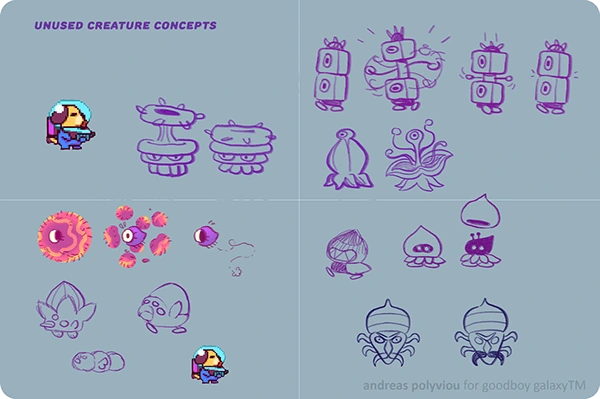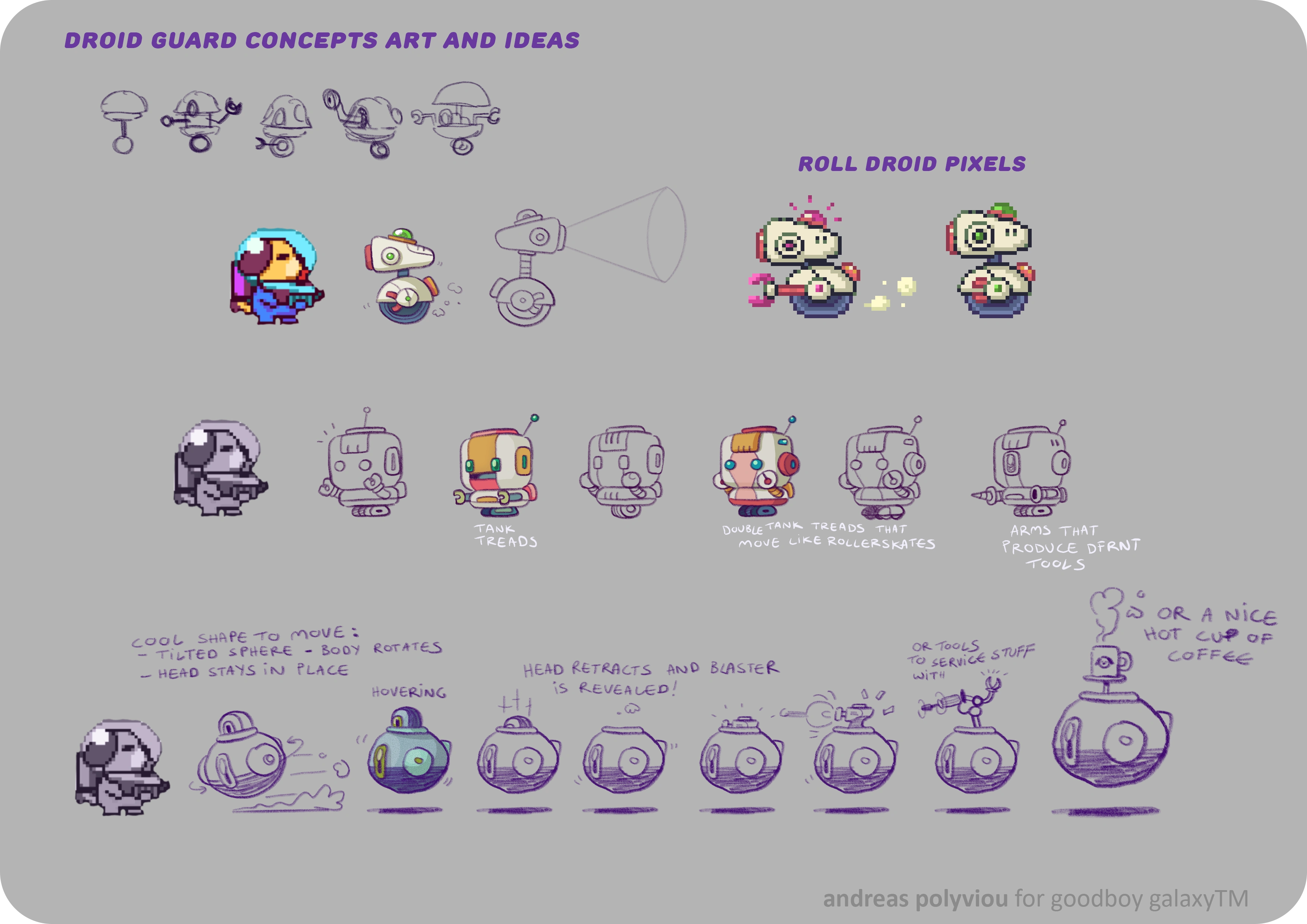 Goodboy Galaxy is an action adventure game designed for the Nintendo GBA, full of fun characters and strange new worlds to explore. I had the great pleasure of working on this game, creating characters, visualising worlds and helping out with story ideas. I made paintings and sketches, pixel art and animations and had an amazing time - please enjoy some of my work!