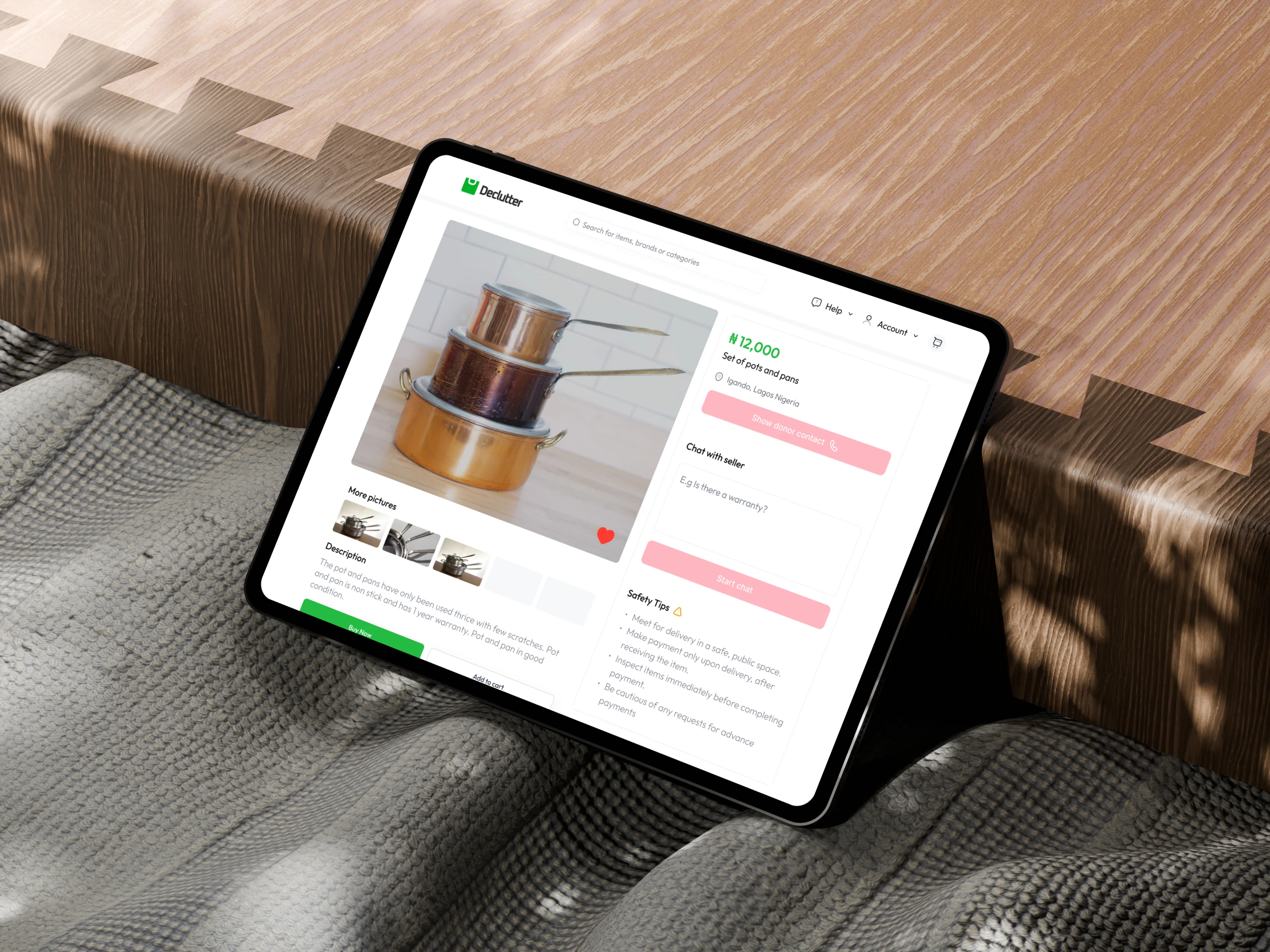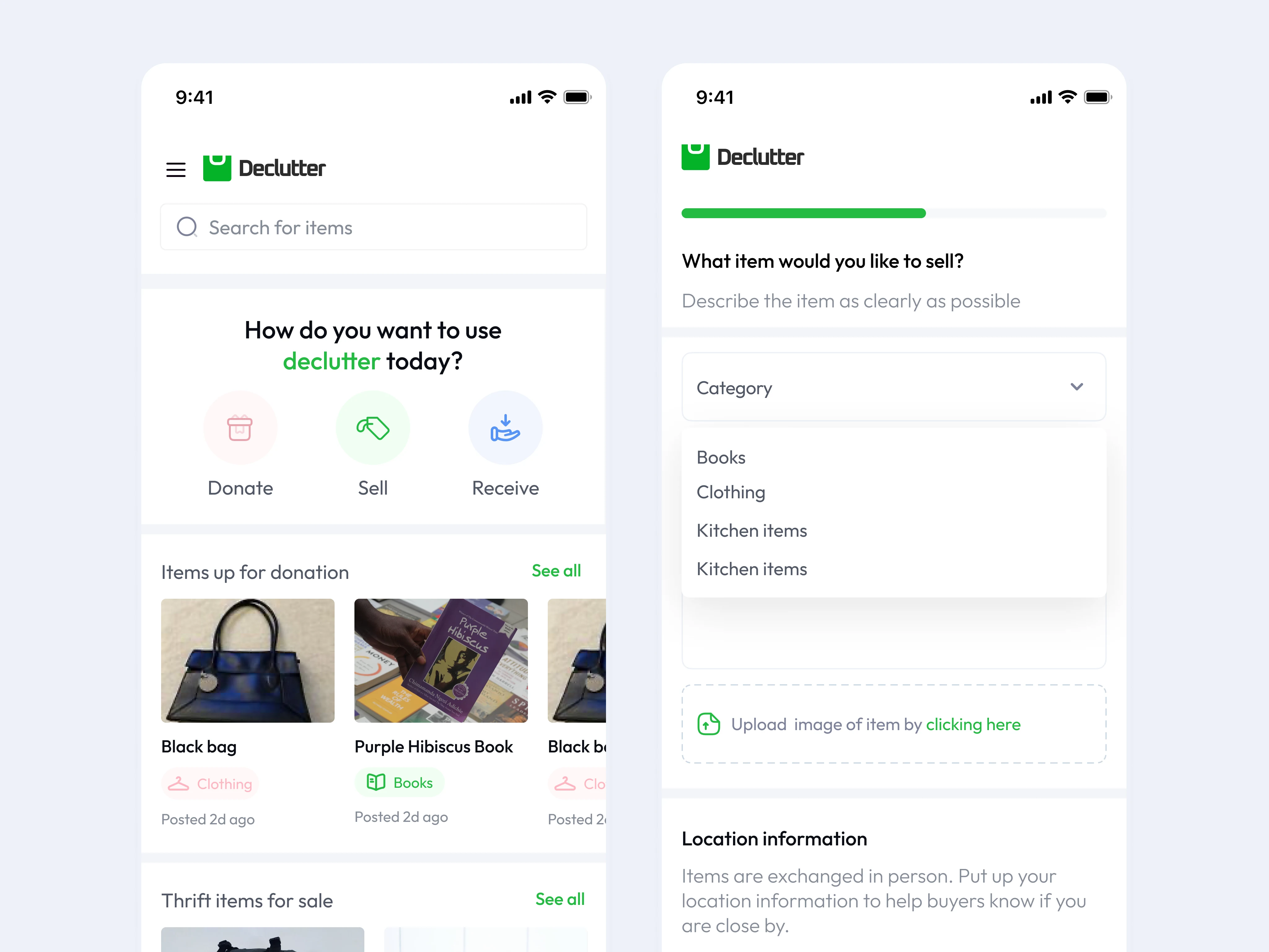 Declutter is a mobile app that helps users effortlessly sell, donate, or buy second-hand items. Whether it’s a piece of furniture you no longer need, clothes you'd like to give away, or affordable finds from others in your area — Declutter creates a safe, fast, and socially responsible way to declutter and contribute to a circular economy.