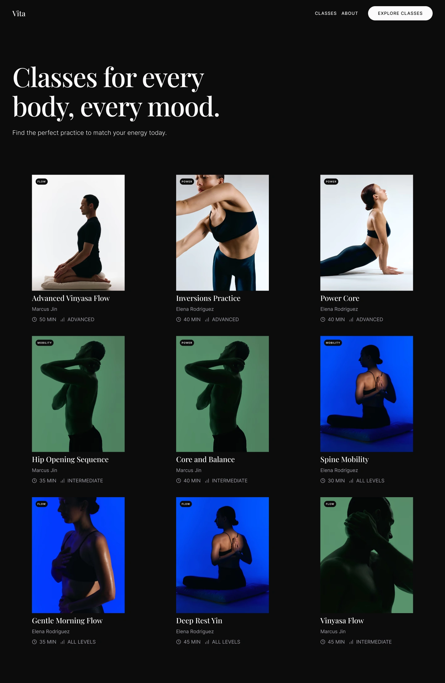 Design and develop a digital platform for an online yoga studio that breaks from traditional wellness aesthetics. Vita sought a modern, intentional, and accessible space that reflects the transformative nature of yoga without relying on clichés or overly ornate design.