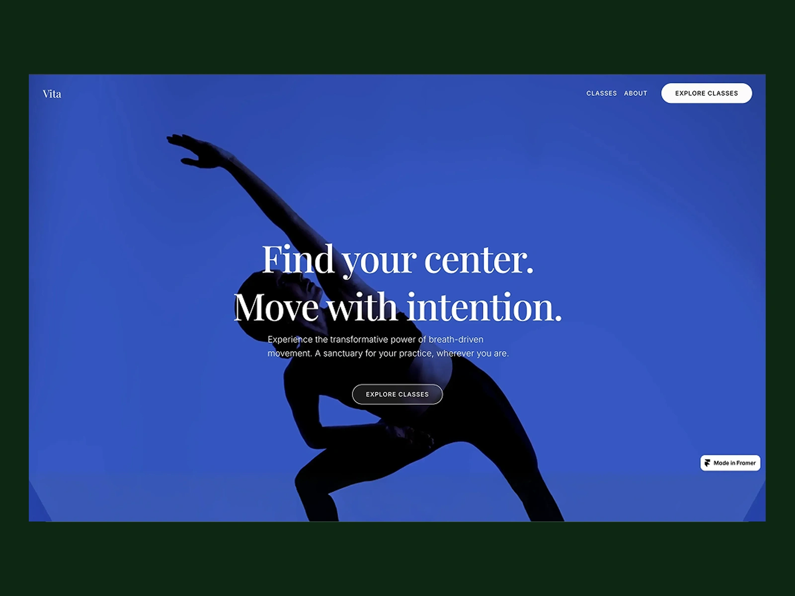 Hero Section – "Find your center. Move with intention." A dynamic silhouette against vibrant blue creates impact while maintaining accessibility.