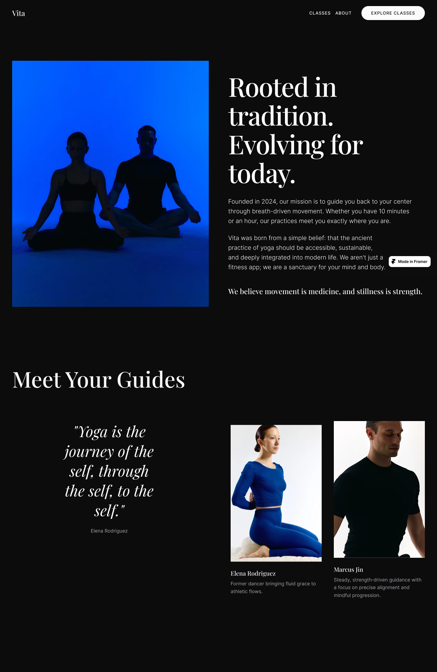 Meet Your Guides – Instructor profiles framed as partners in practice, with clean portraits and quote-driven philosophy.