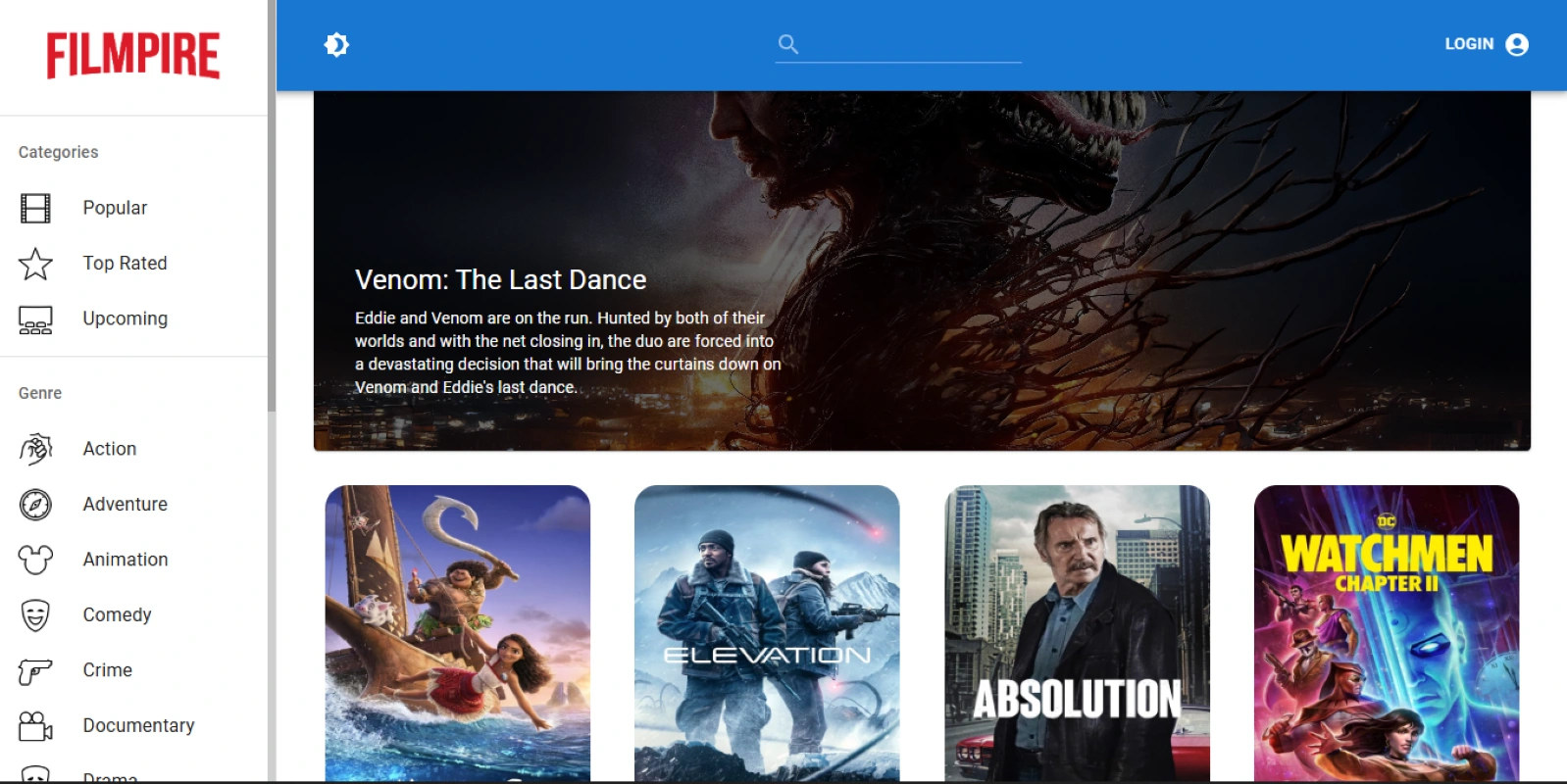 Filmpire is a sleek movie web app built with React and MUI, offering a modern, responsive design for smooth browsing and exploration of films.