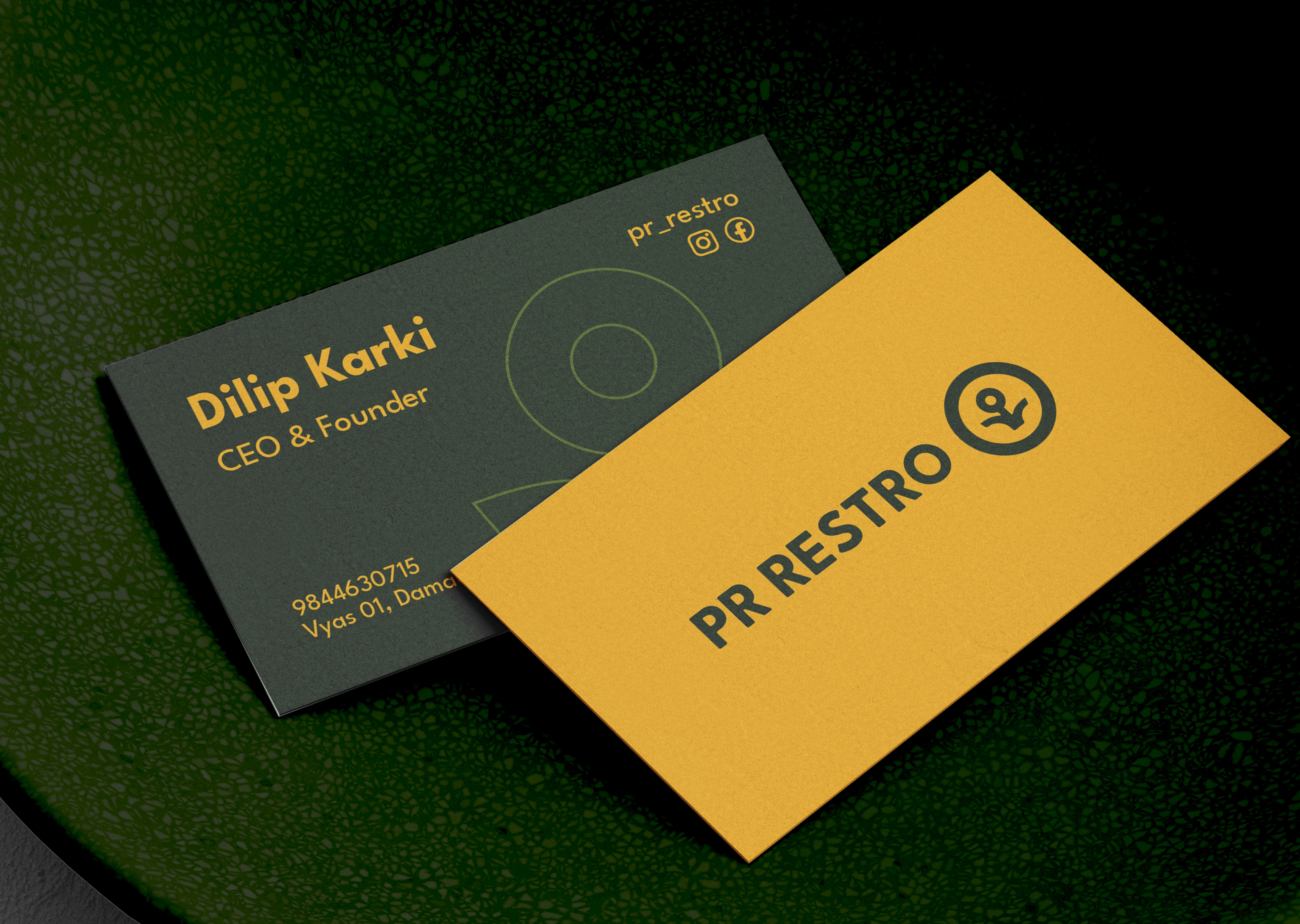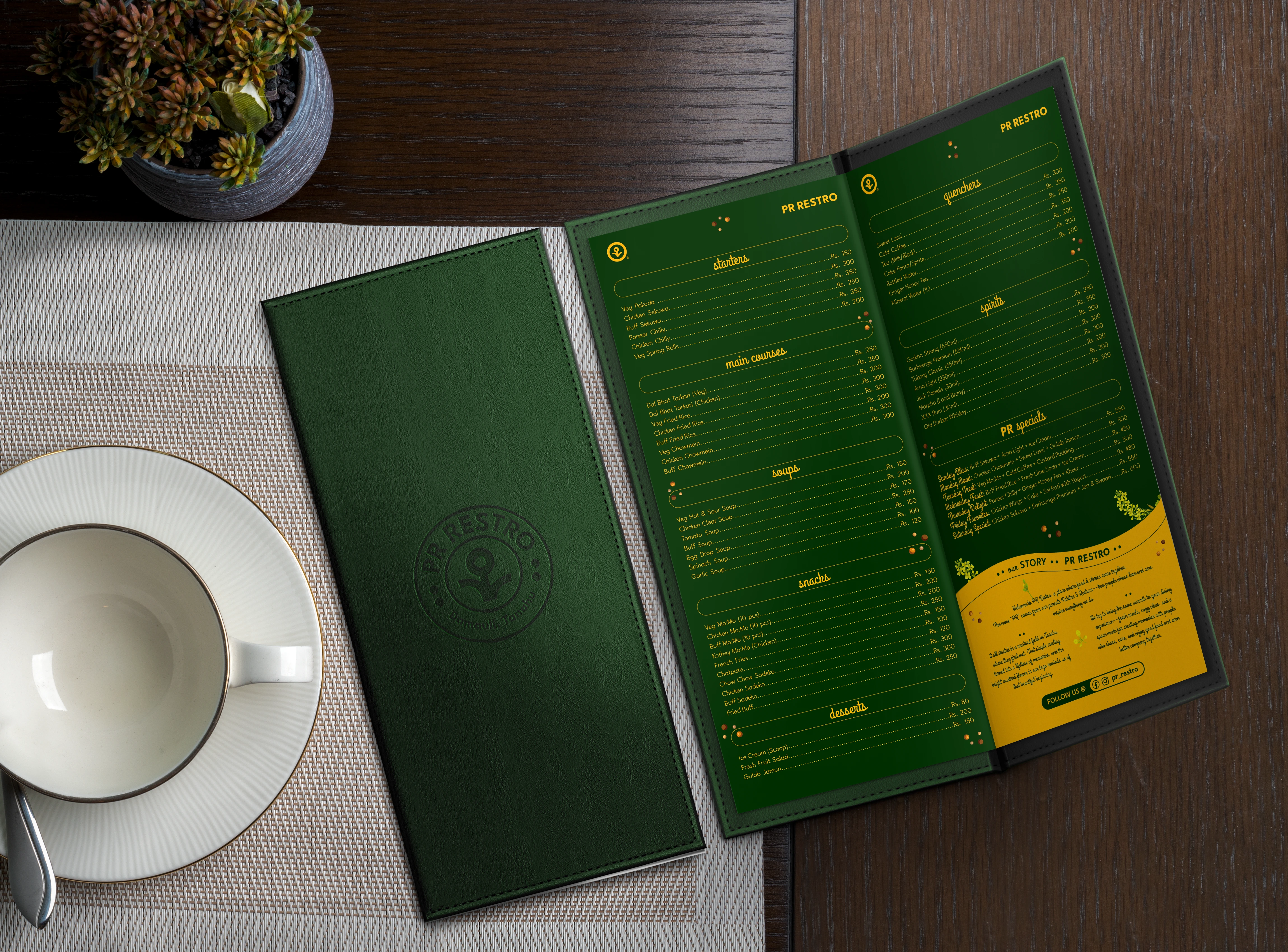 A rich, rooted brand identity for PR Restro—crafted to honor culture and community. Full system delivered, though only partially used by the client.