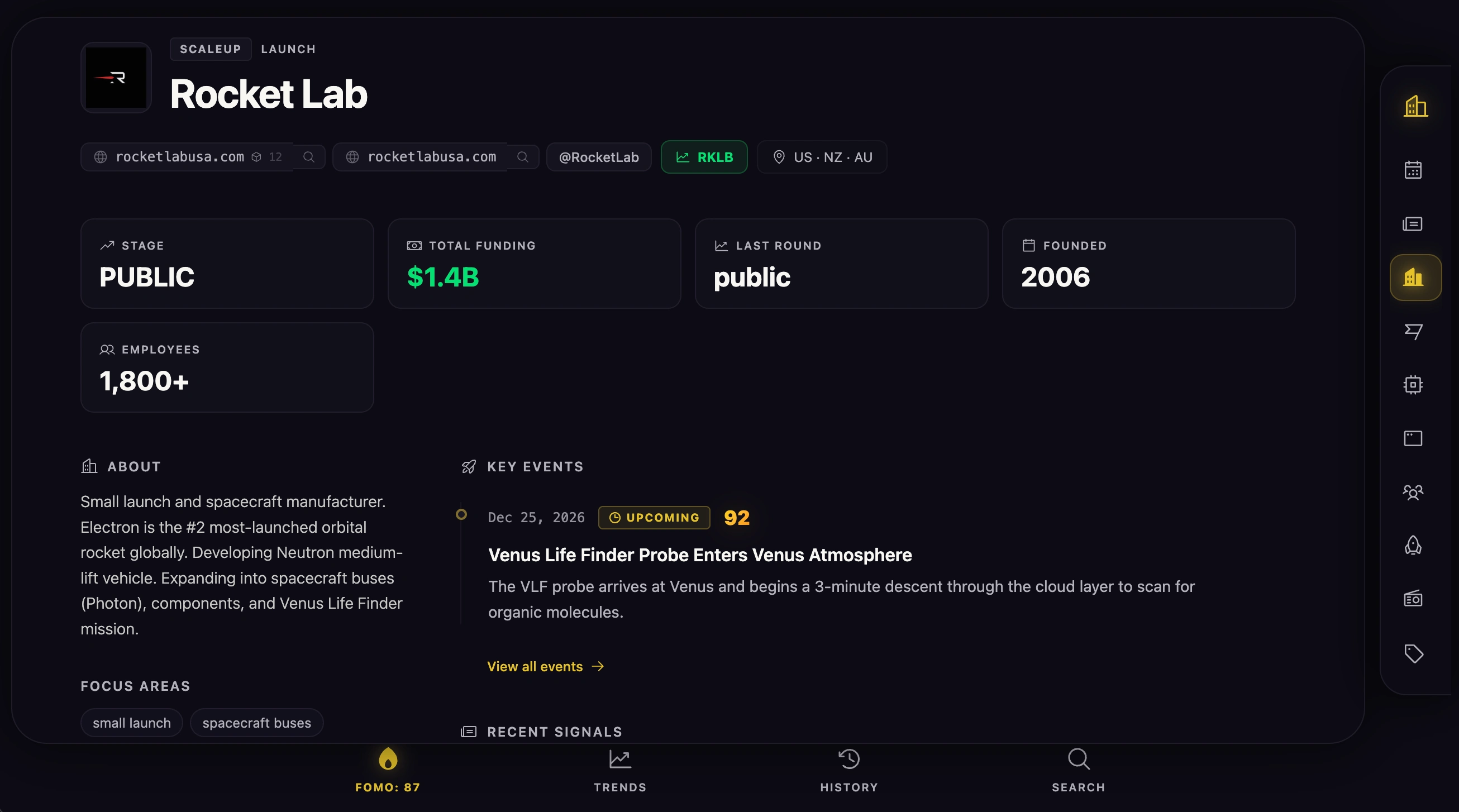 Conceived as a Crunchbase alternative for space, this SvelteKit SPA tracks launch providers, satellite manufacturers, propulsion startups, defense primes - and their key people, and events - each with funding stage, technology stack, mission history.