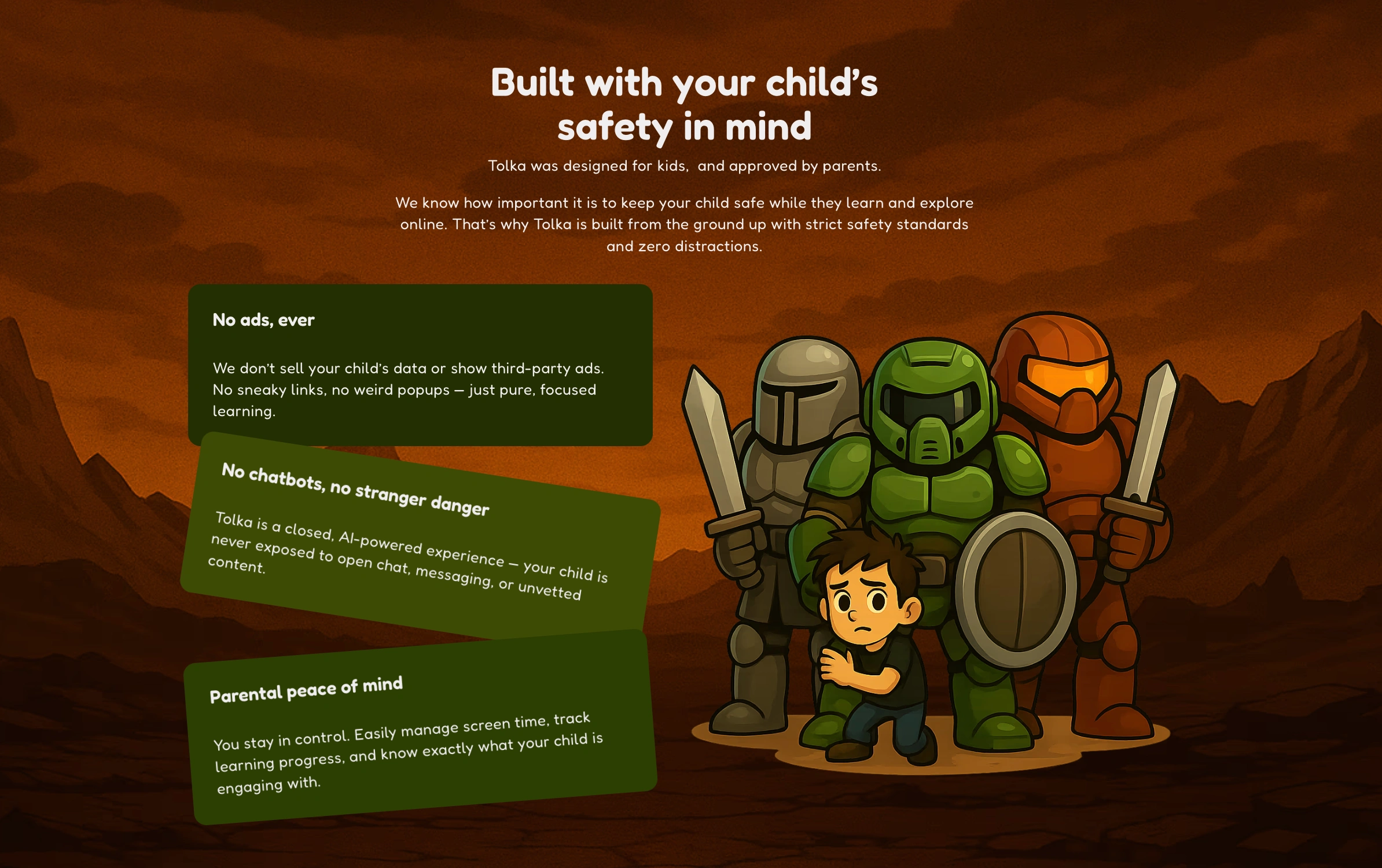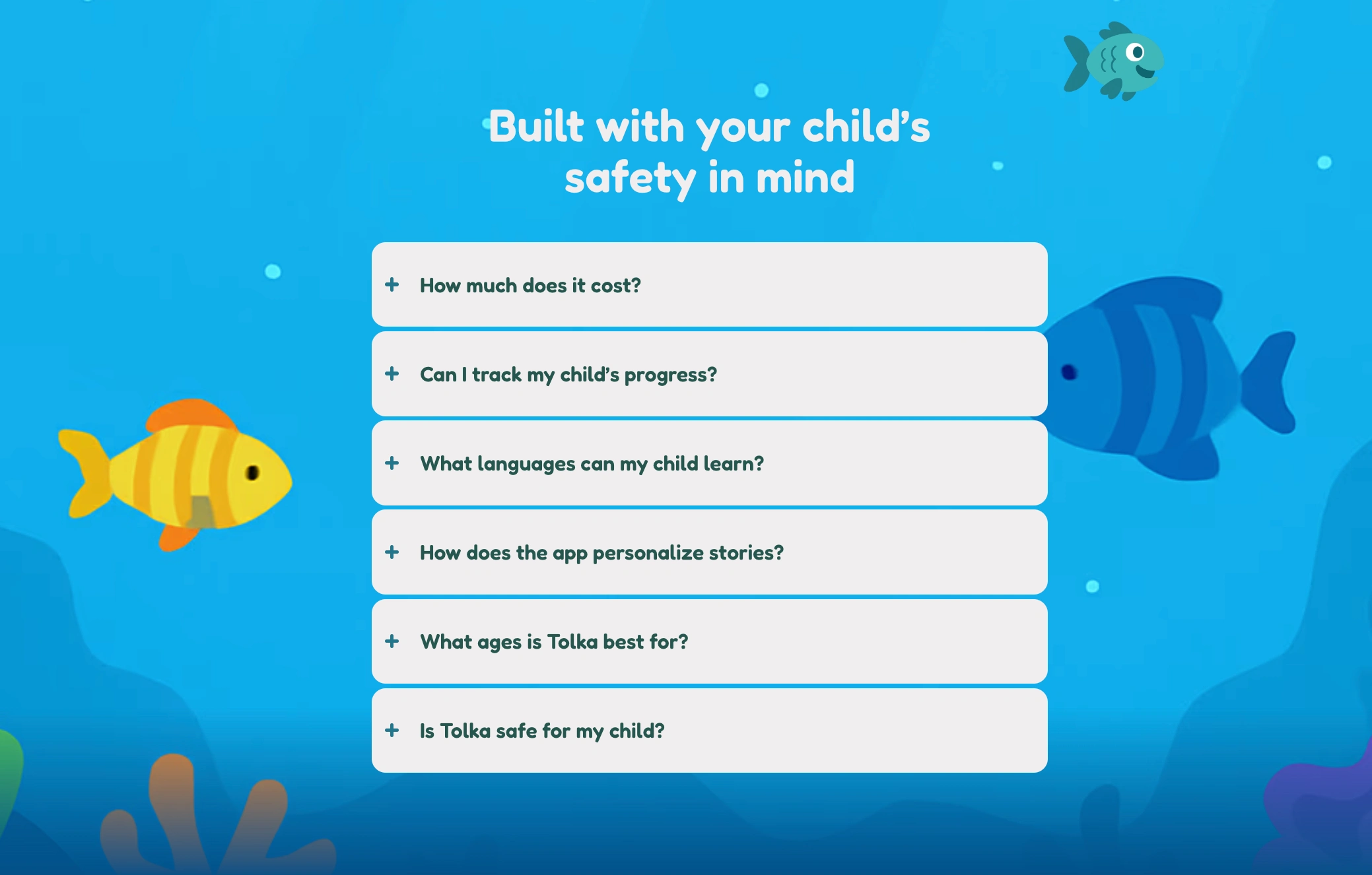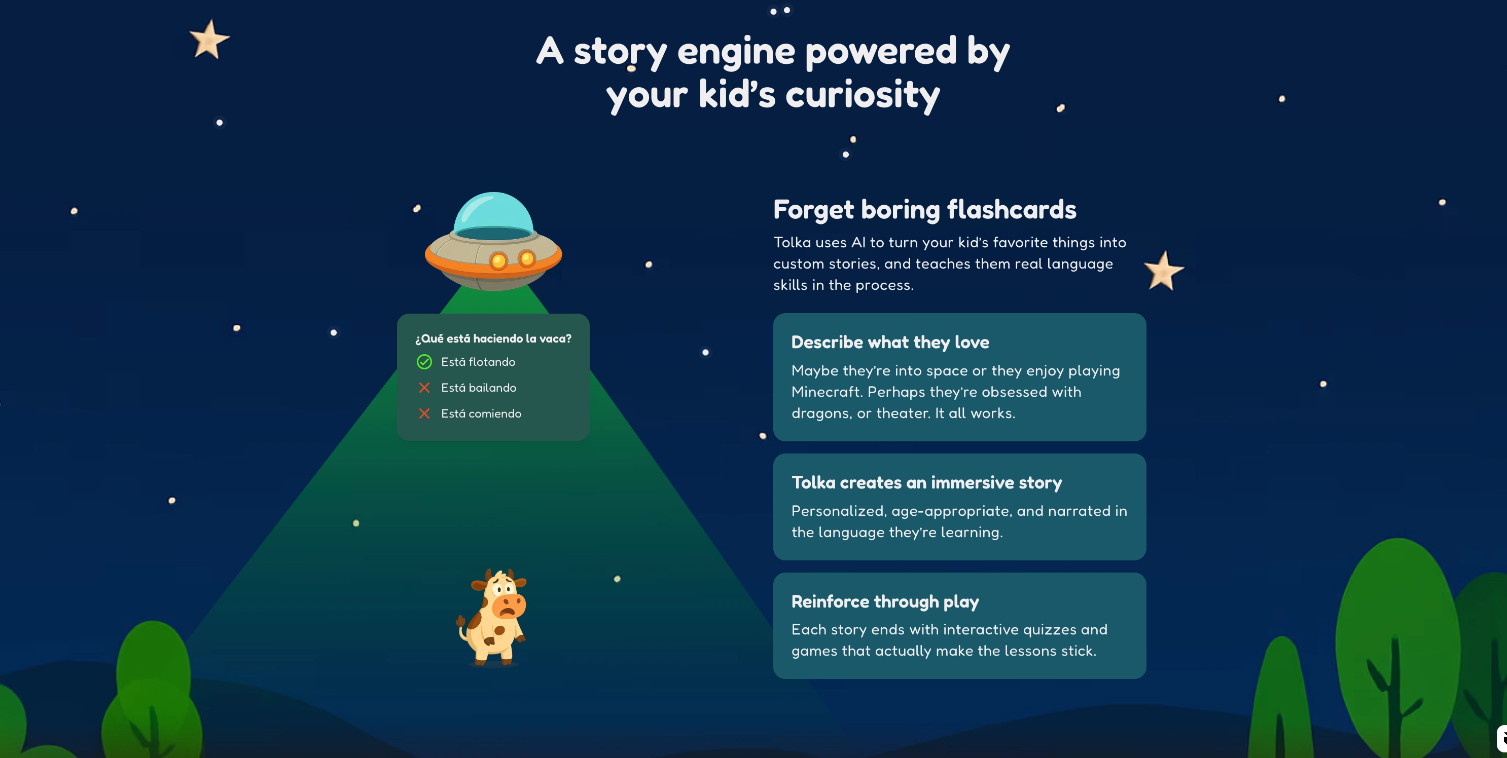 Tolka's brief is a brand and landing page for a language learning app using AI to create stories that relate directly to your kid's personal interests.