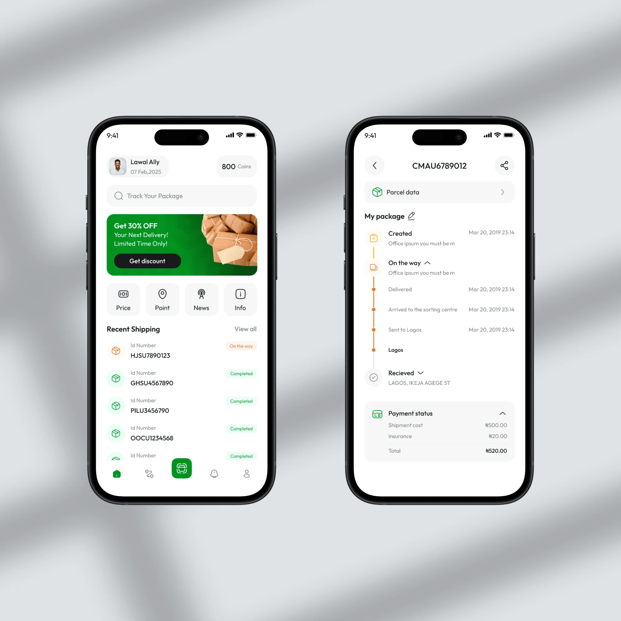 Designed a mobile UI for a parcel delivery app with real-time tracking, shipping history, and promotions, focusing on user experience through a simple layout .