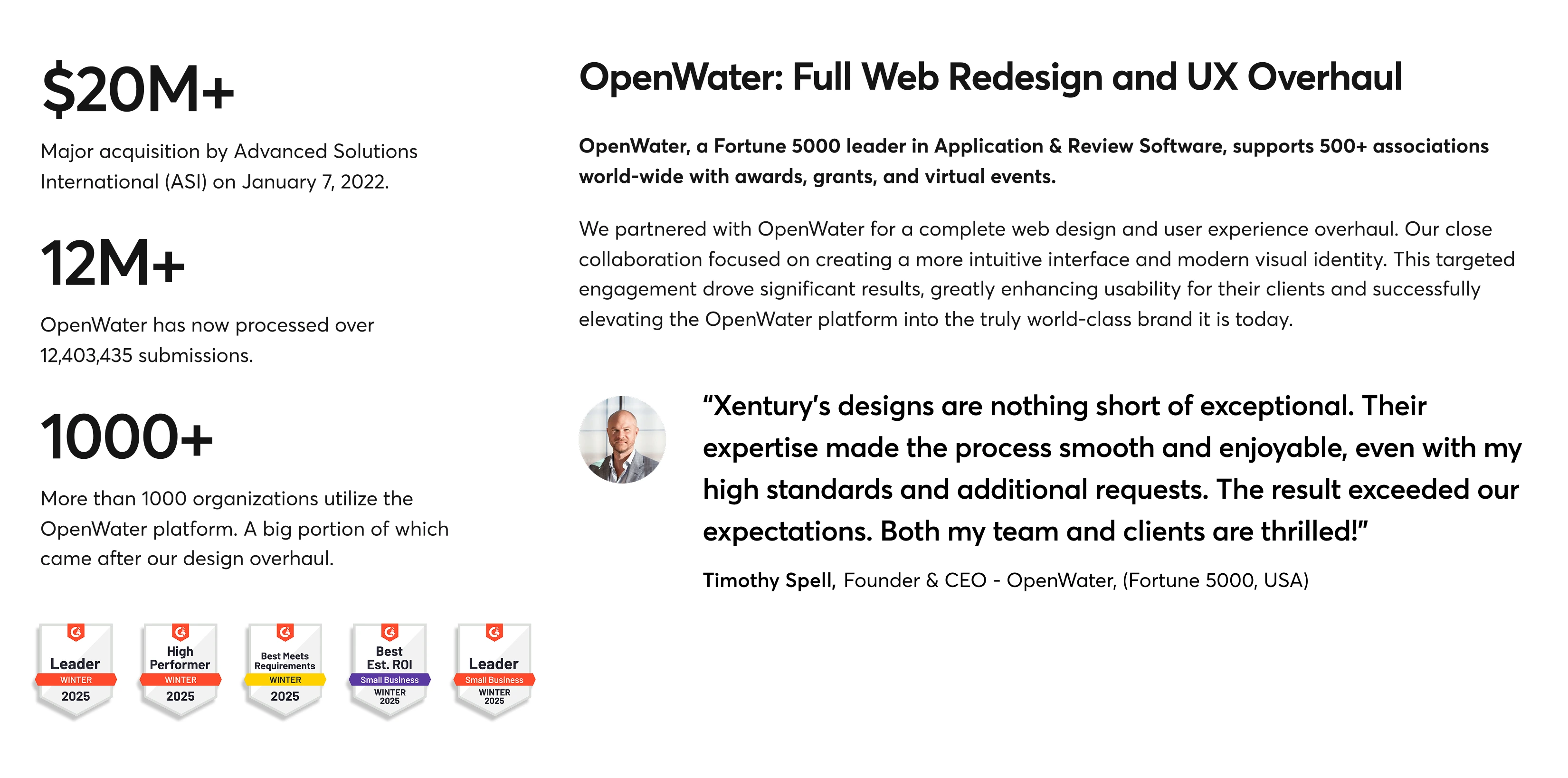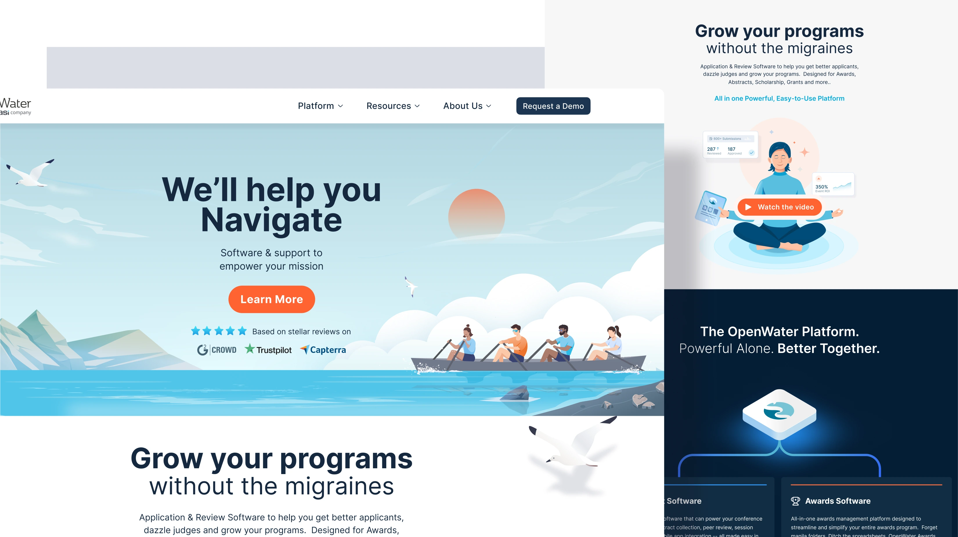 We partnered with OpenWater for a complete web design and user experience overhaul. Our close collaboration focused on creating a more intuitive interface and modern visual identity. This targeted engagement drove significant results, greatly enhancing usability for their clients and successfully elevating the OpenWater platform into the truly world-class brand it is today.