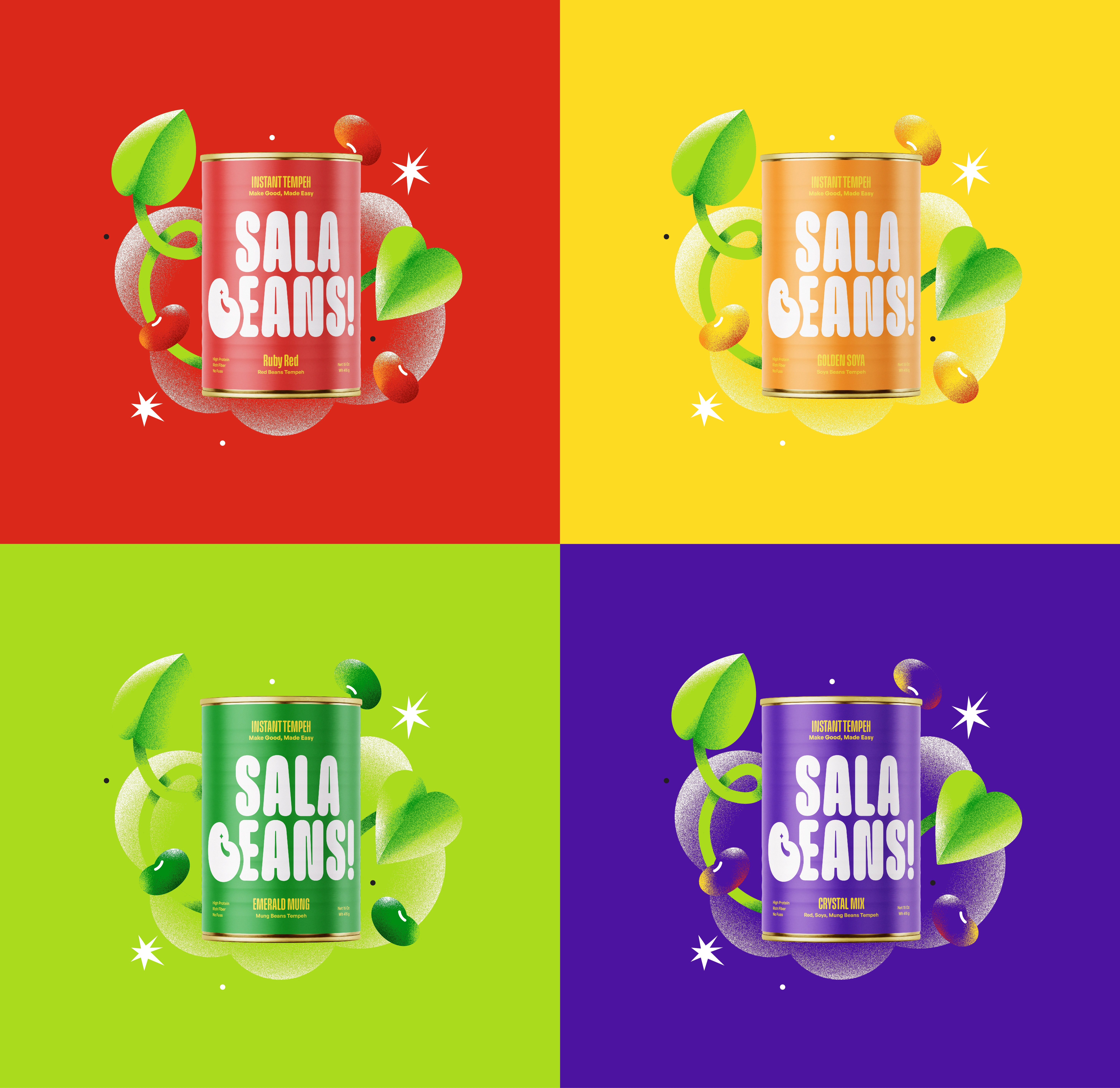 A Whimsical World of Beans and Magic—Salabeans reimagines the humble bean with a world bursting with color and magic. A vibrant mix of magical purple, sustainable green, and bean-inspired hues reflects its natural roots, while bold, playful typography brings out its lively personality and commitment to sustainability.