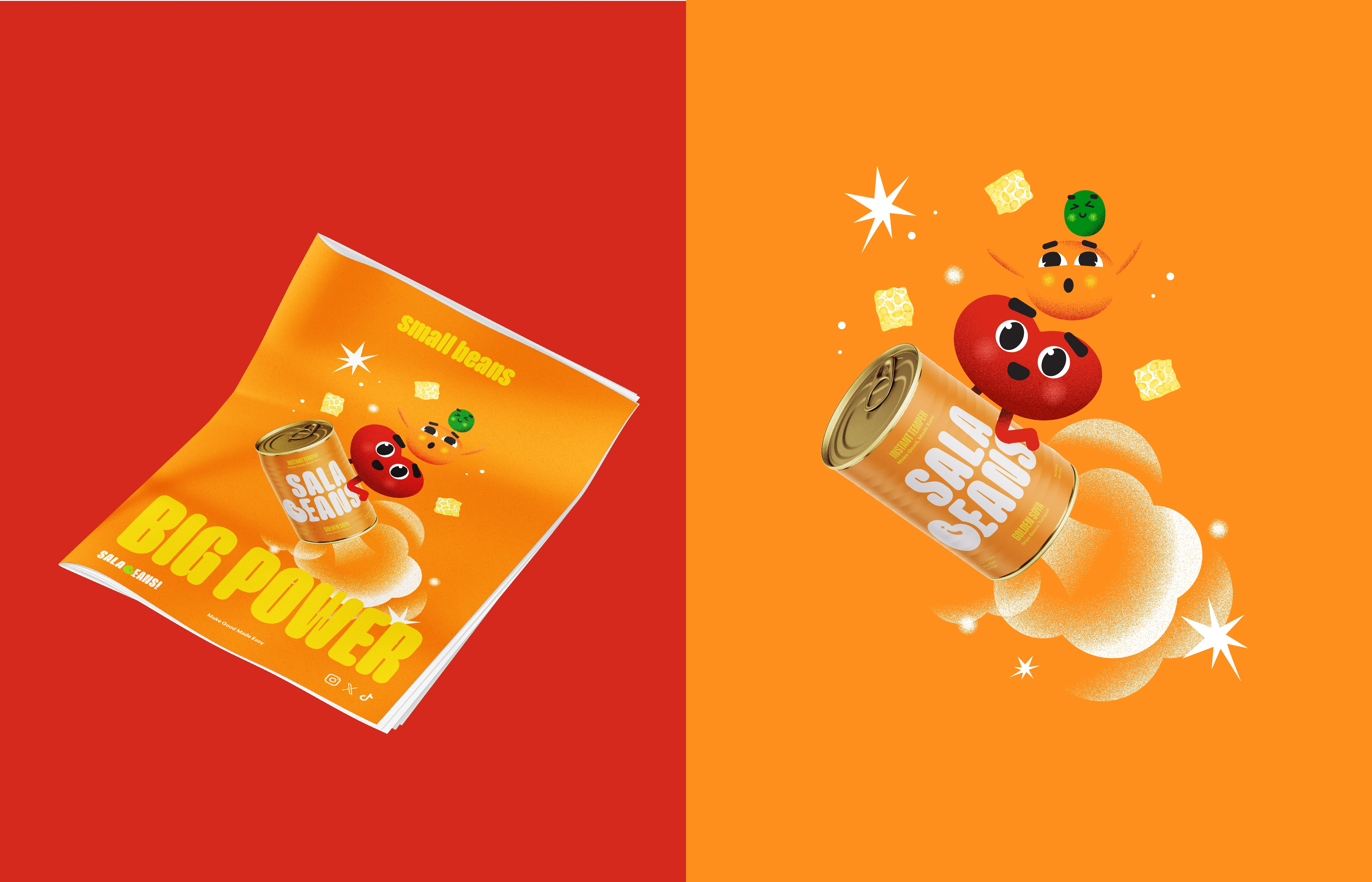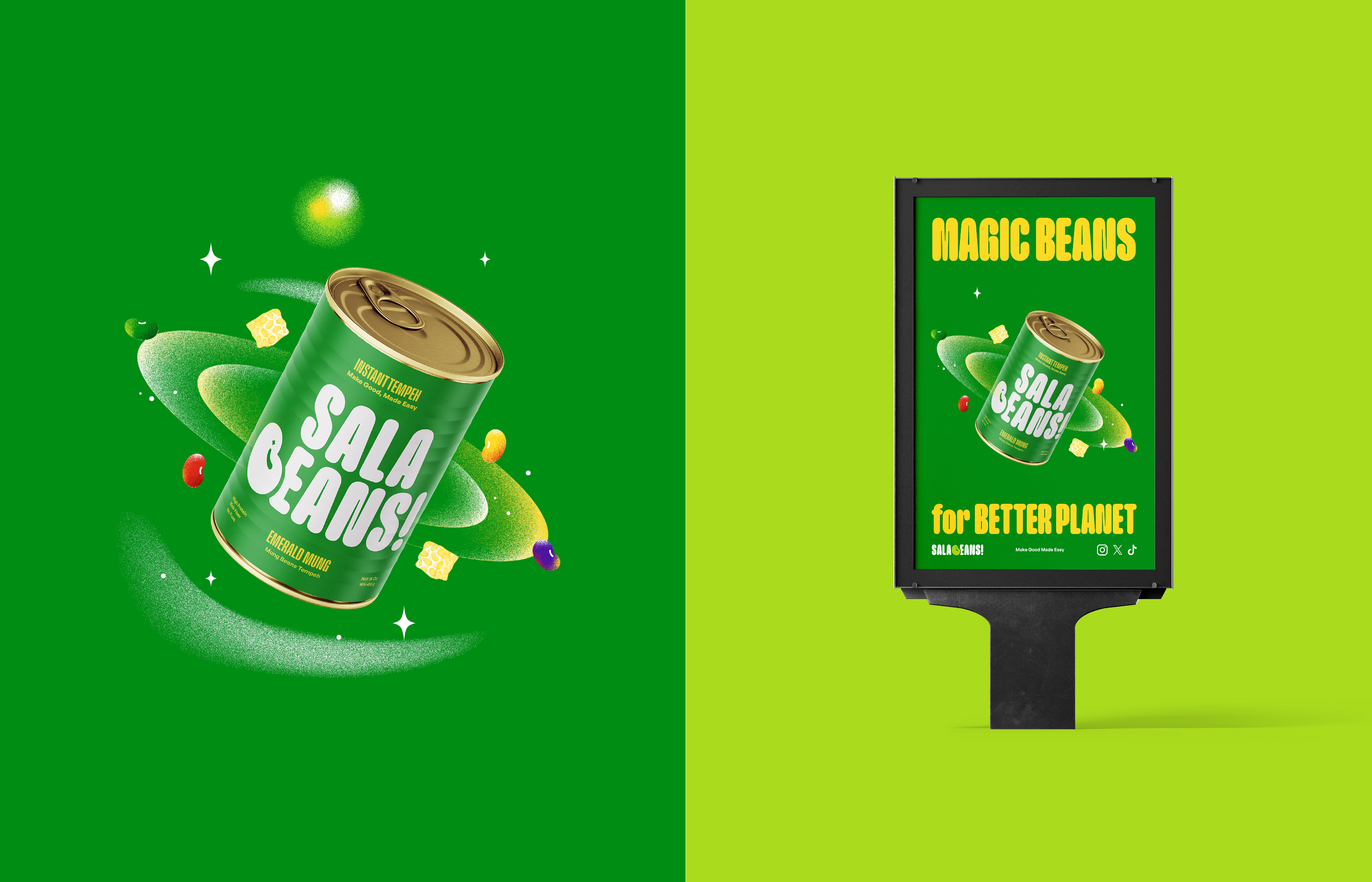 Grunge-textured illustrations add warmth and depth, creating a natural yet modern feel that makes plant-based eating effortless. The clean and striking packaging ensures Salabeans stands out, making sustainability bold, simple, and irresistibly delicious.