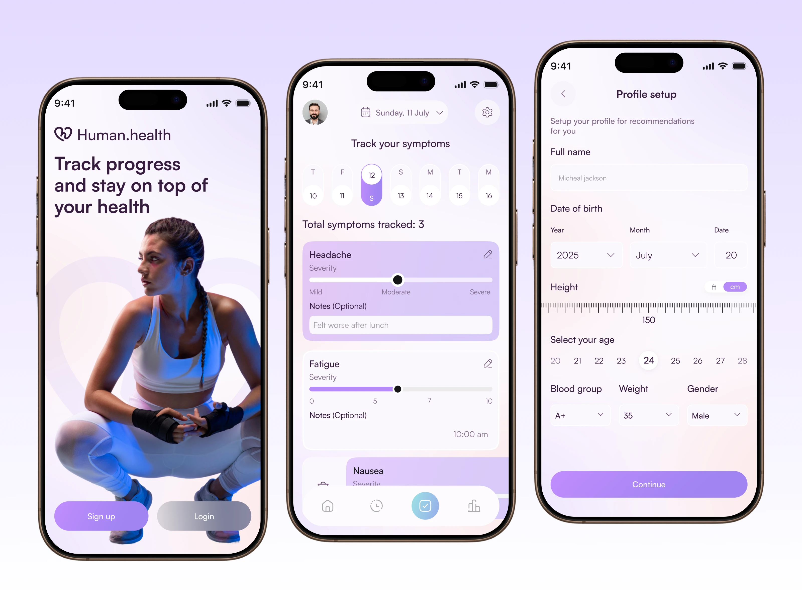 "Explore our Human Health Tracker Mobile App UI/UX design crafted for seamless health monitoring. It offers features like activity tracking, calorie count, and wellness insights with a modern, user-friendly interface, ensuring a smooth experience for users aiming to improve their health journey."