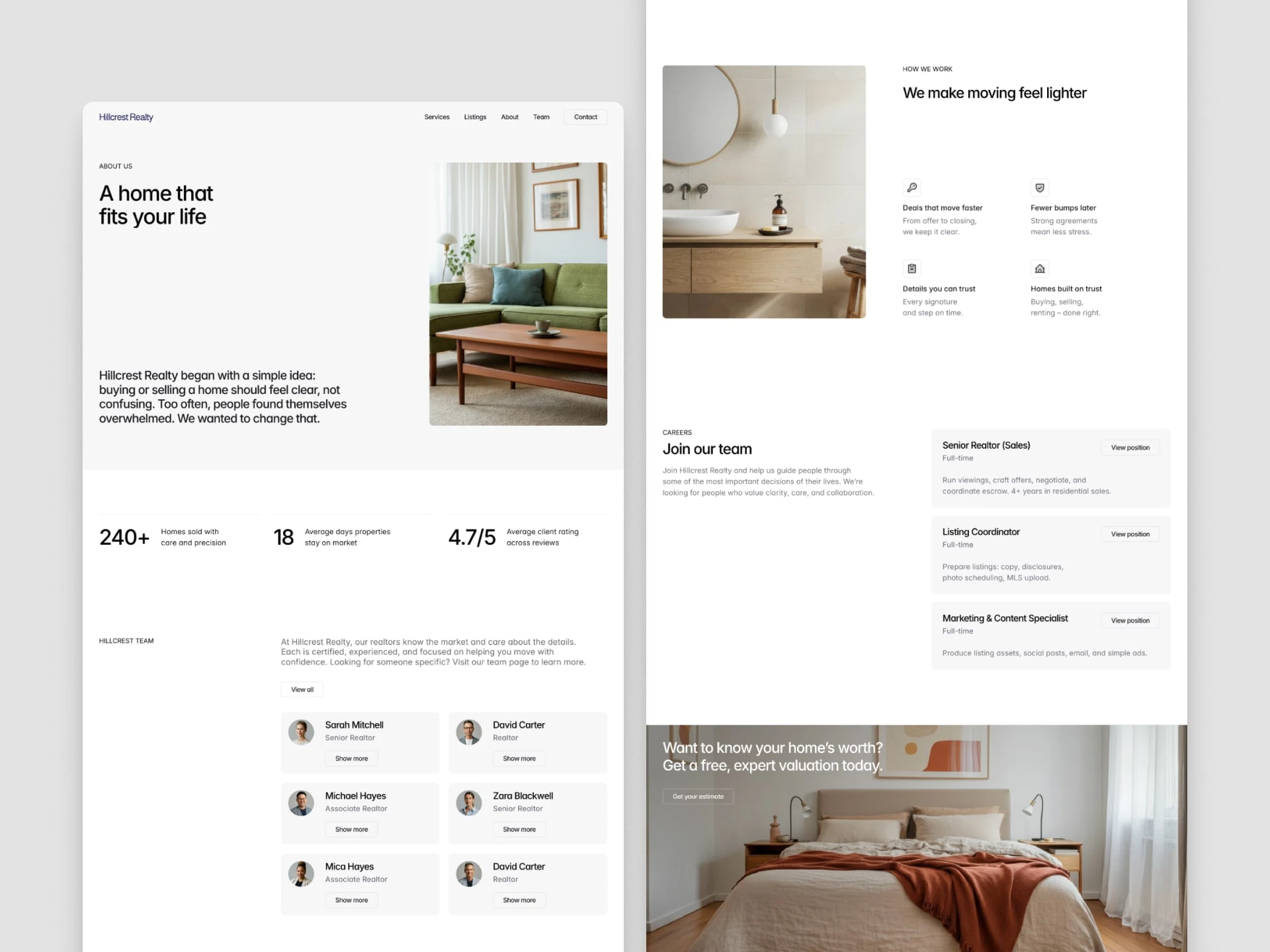 The visual system uses neutral colors, simple typography, and approachable imagery to make real estate communication feel transparent and human.