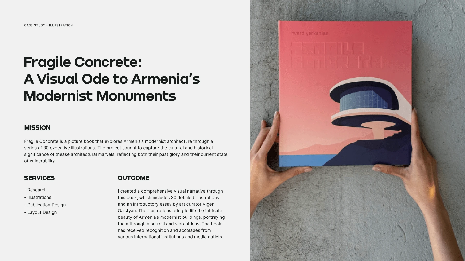 'Fragile Concrete' is a picture book of an illustration series dedicated to the modernist architecture in Armenia created by graphic artist Nvard Yerkanian.