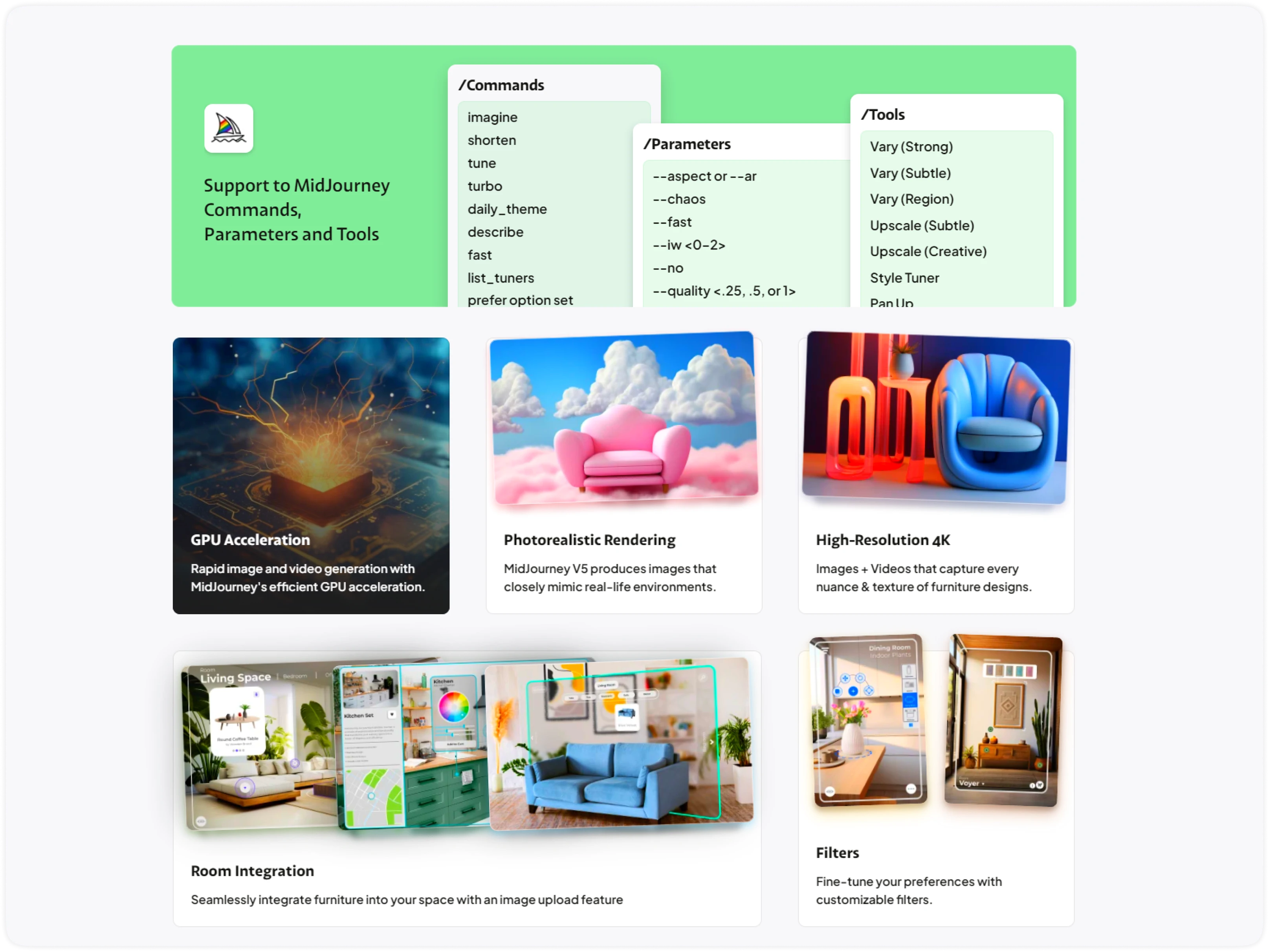 All types of Midjourney commands, parameters, and tools are compatible, making it easy to generate unique, high-quality furniture images with a visionary edge.