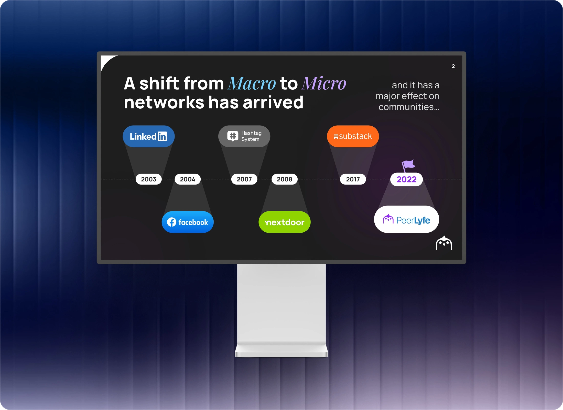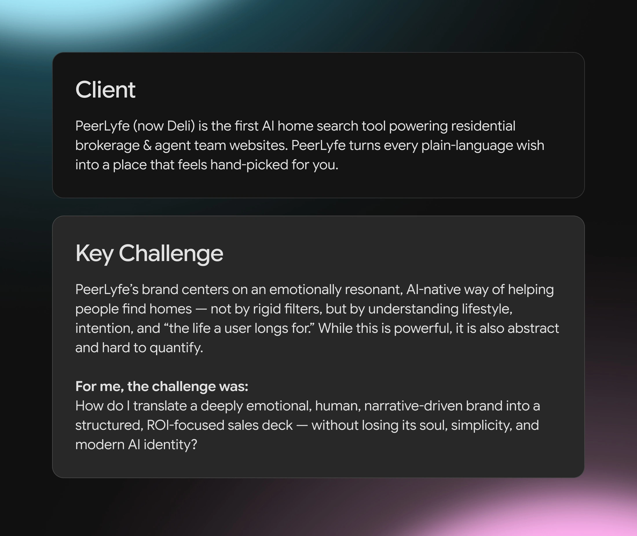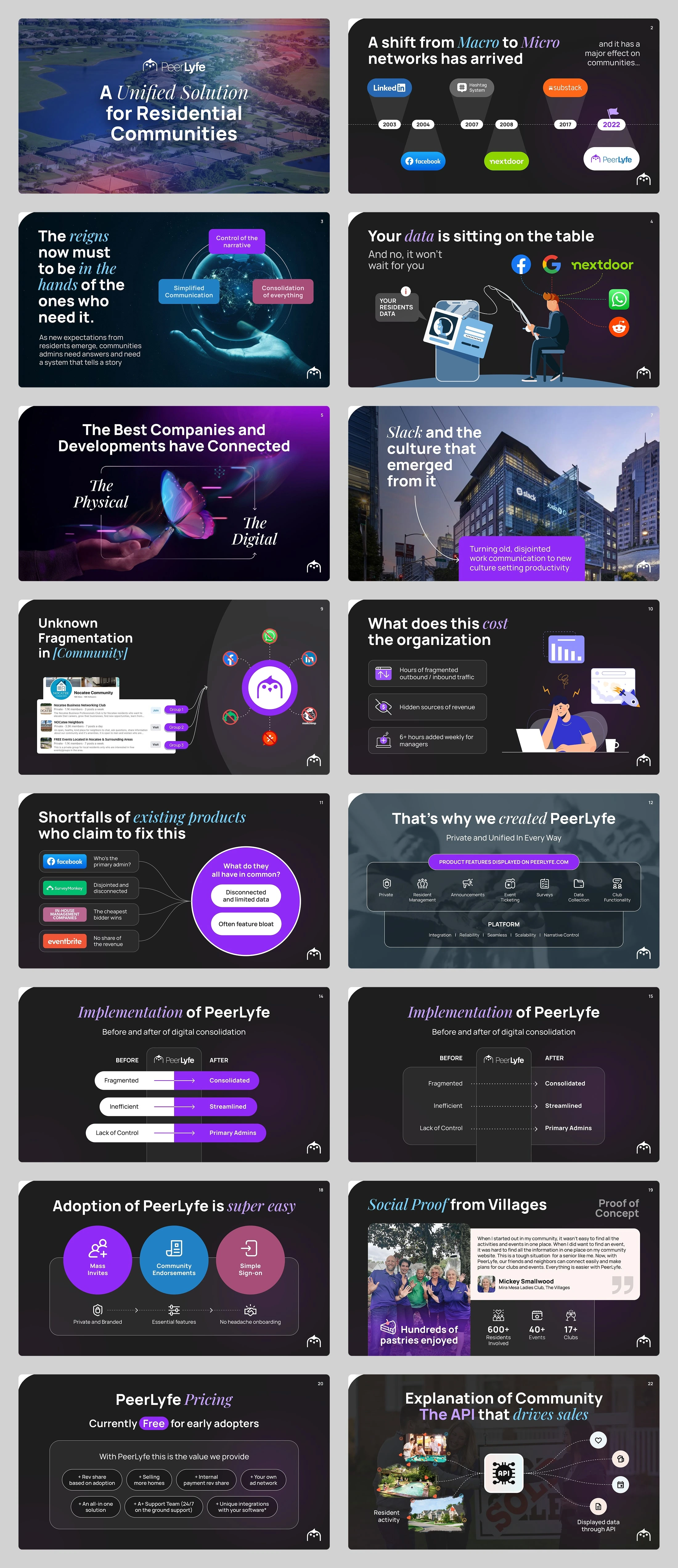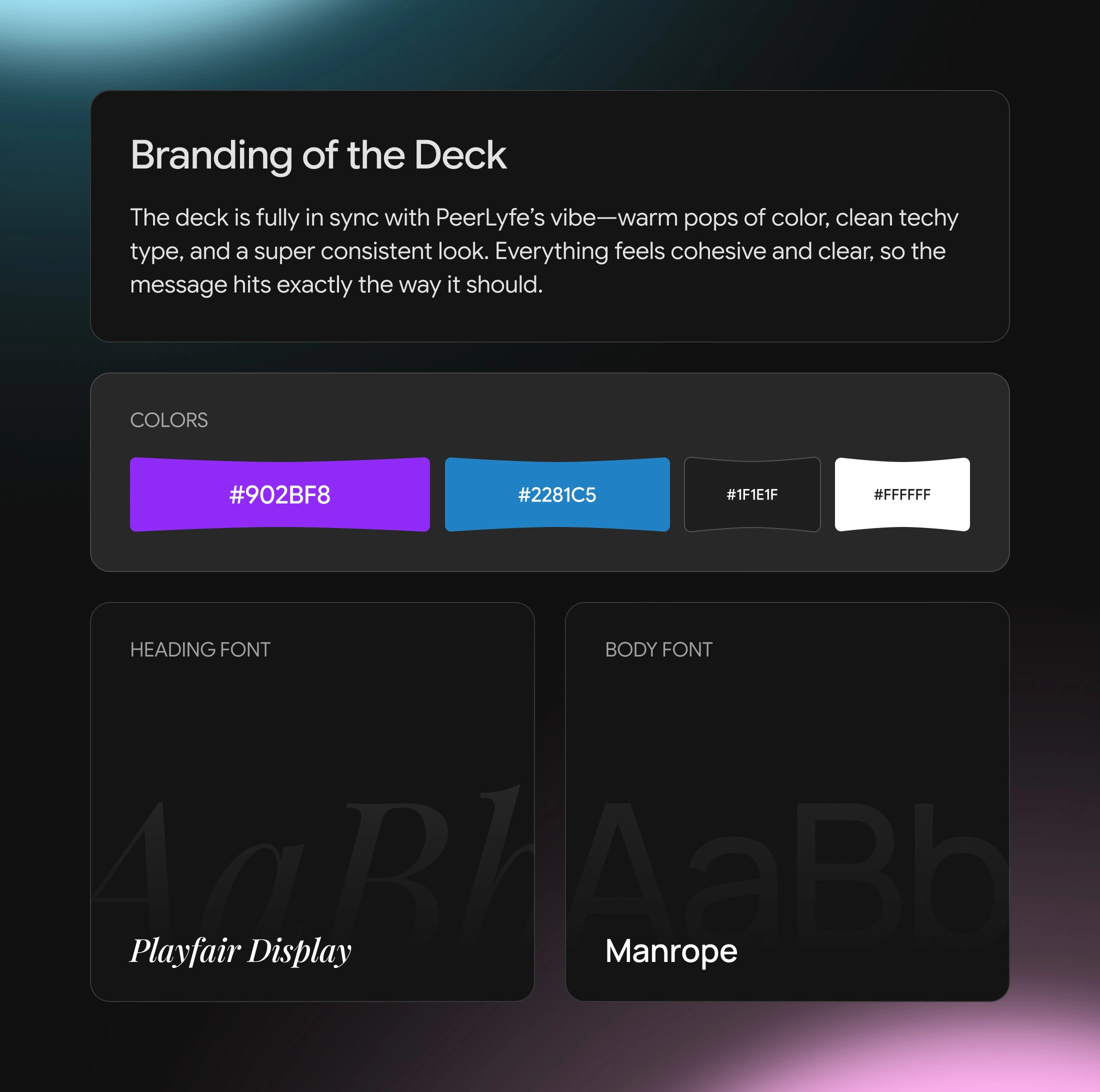 Built a sales deck for PeerLyfe. The deck is fully in sync with PeerLyfe’s vibe—warm pops of color, clean techy type, and a super consistent look.