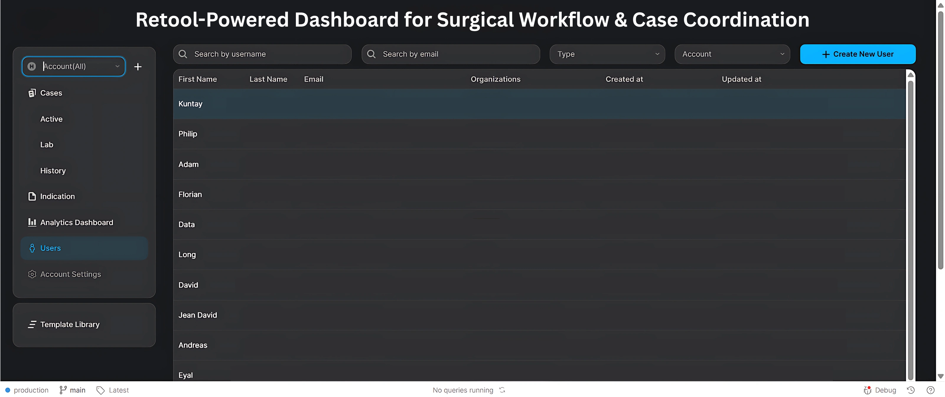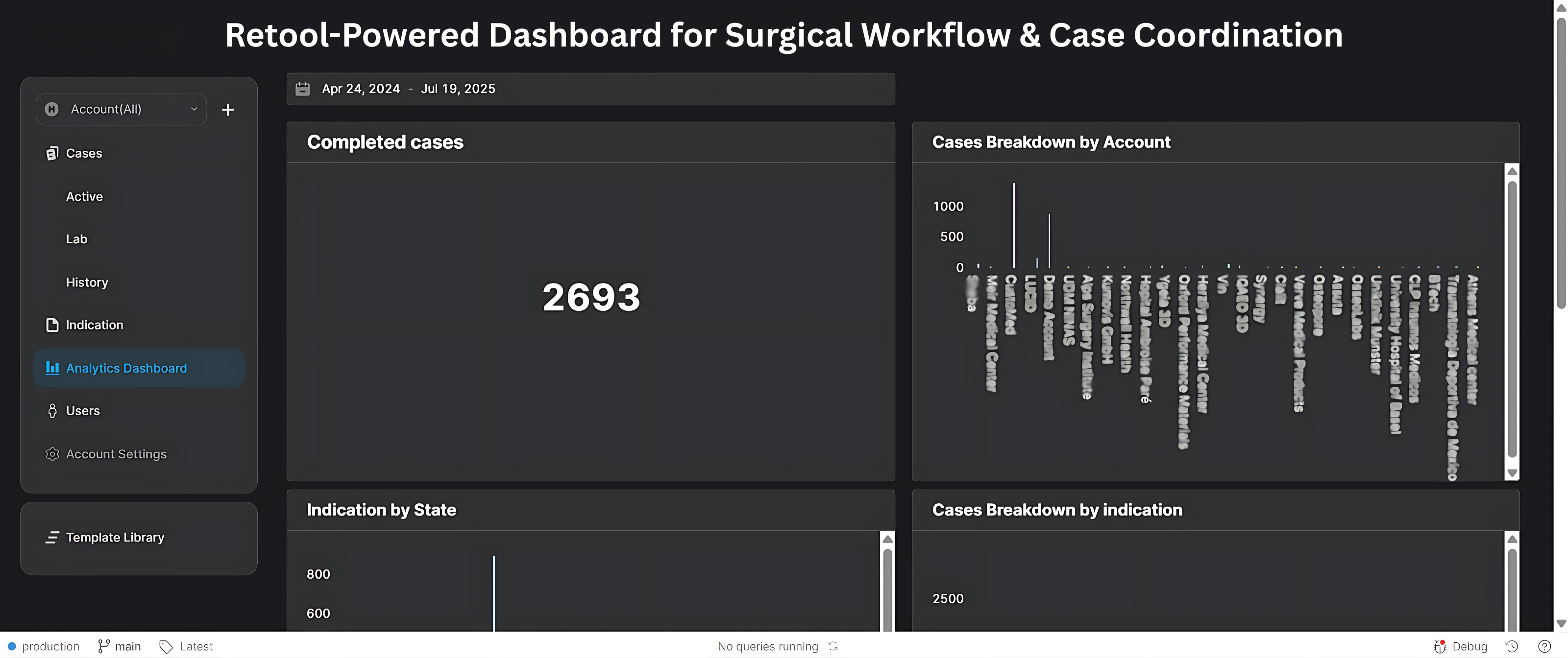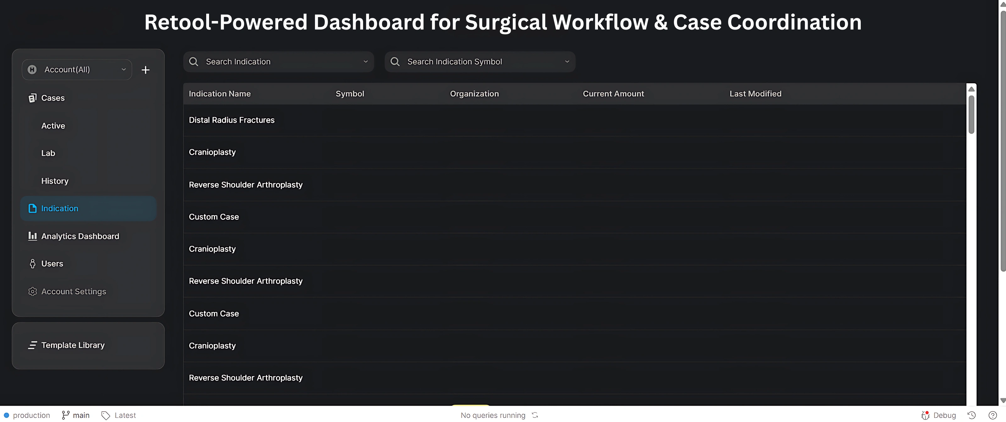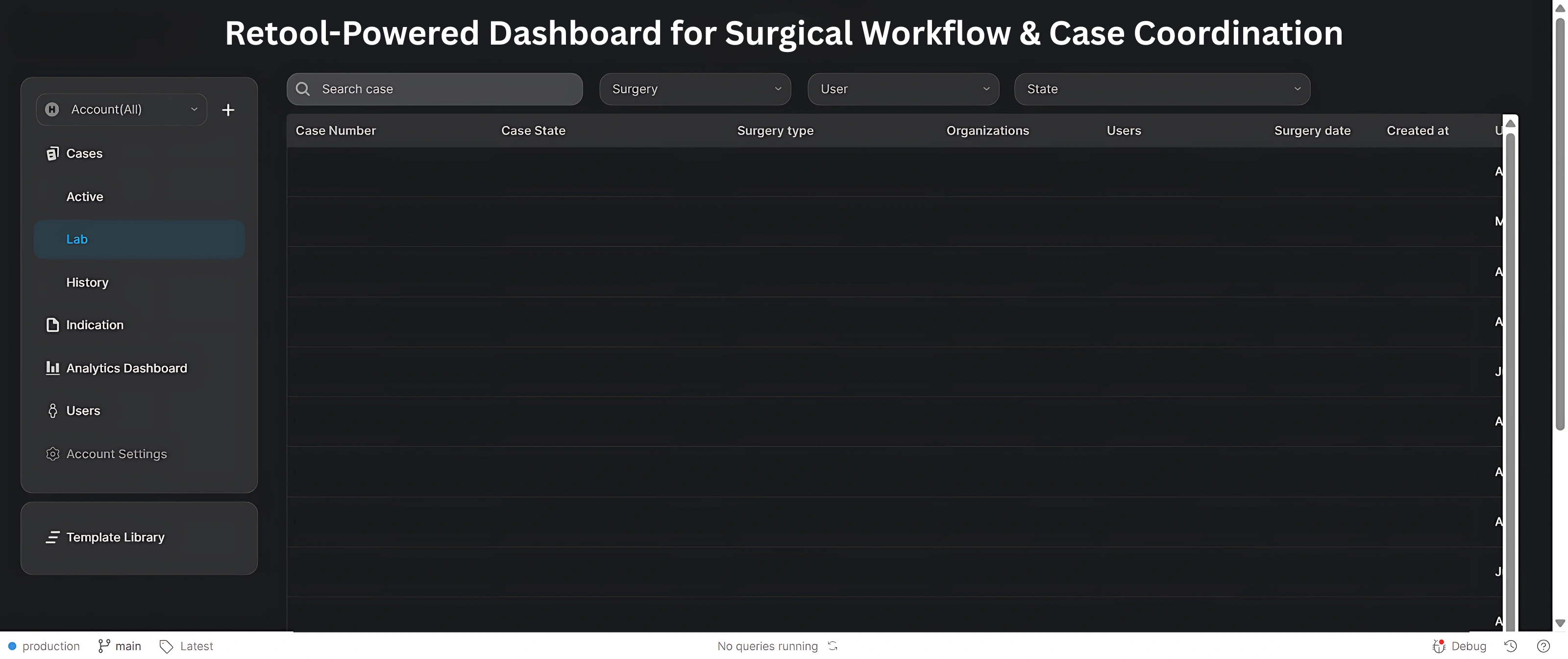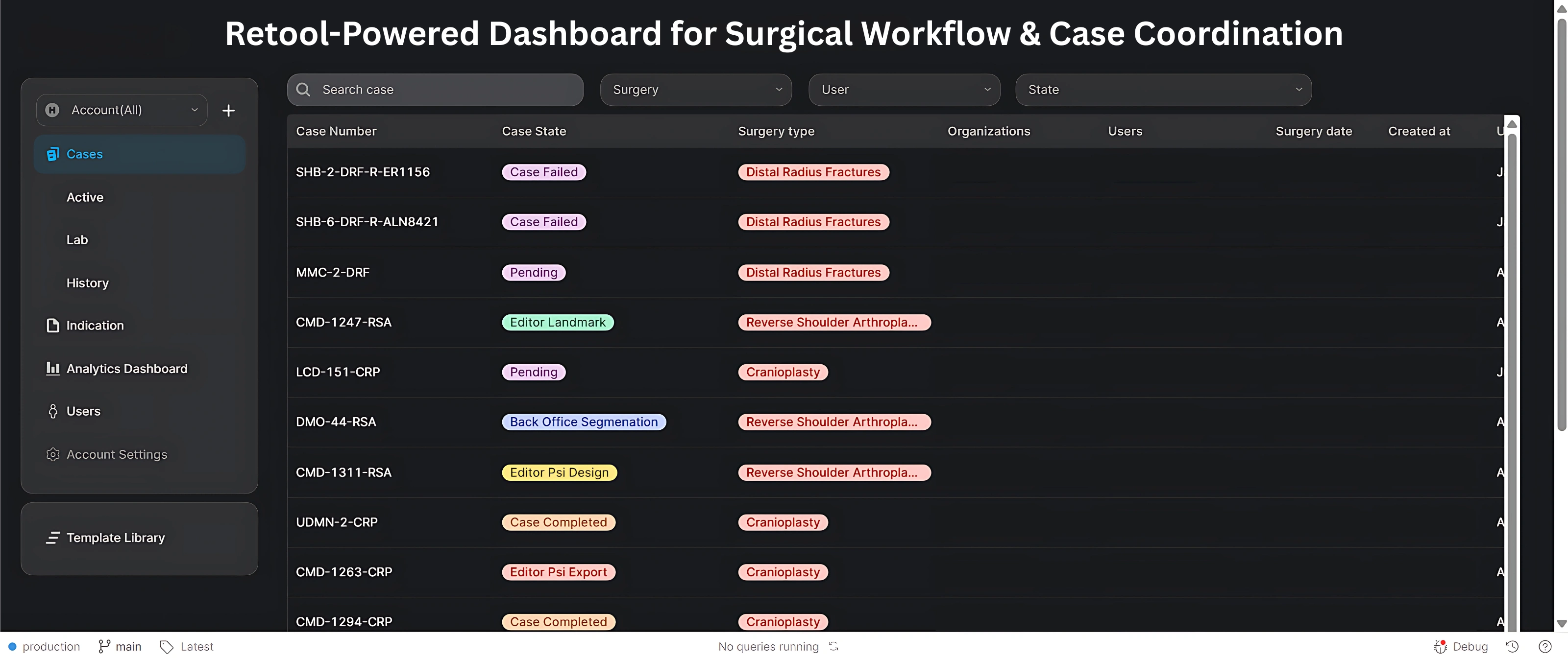 This project involved building a centralized, secure case management dashboard tailored for a healthcare organization specializing in surgical operations. Designed in Retool and connected to AWS infrastructure, the solution streamlines surgical case tracking, status management, team coordination, and analytics across multiple departments including labs, editors, and back-office staff. The result is a high-performance dashboard that improves clarity, reduces manual effort, and scales with growing case volumes.