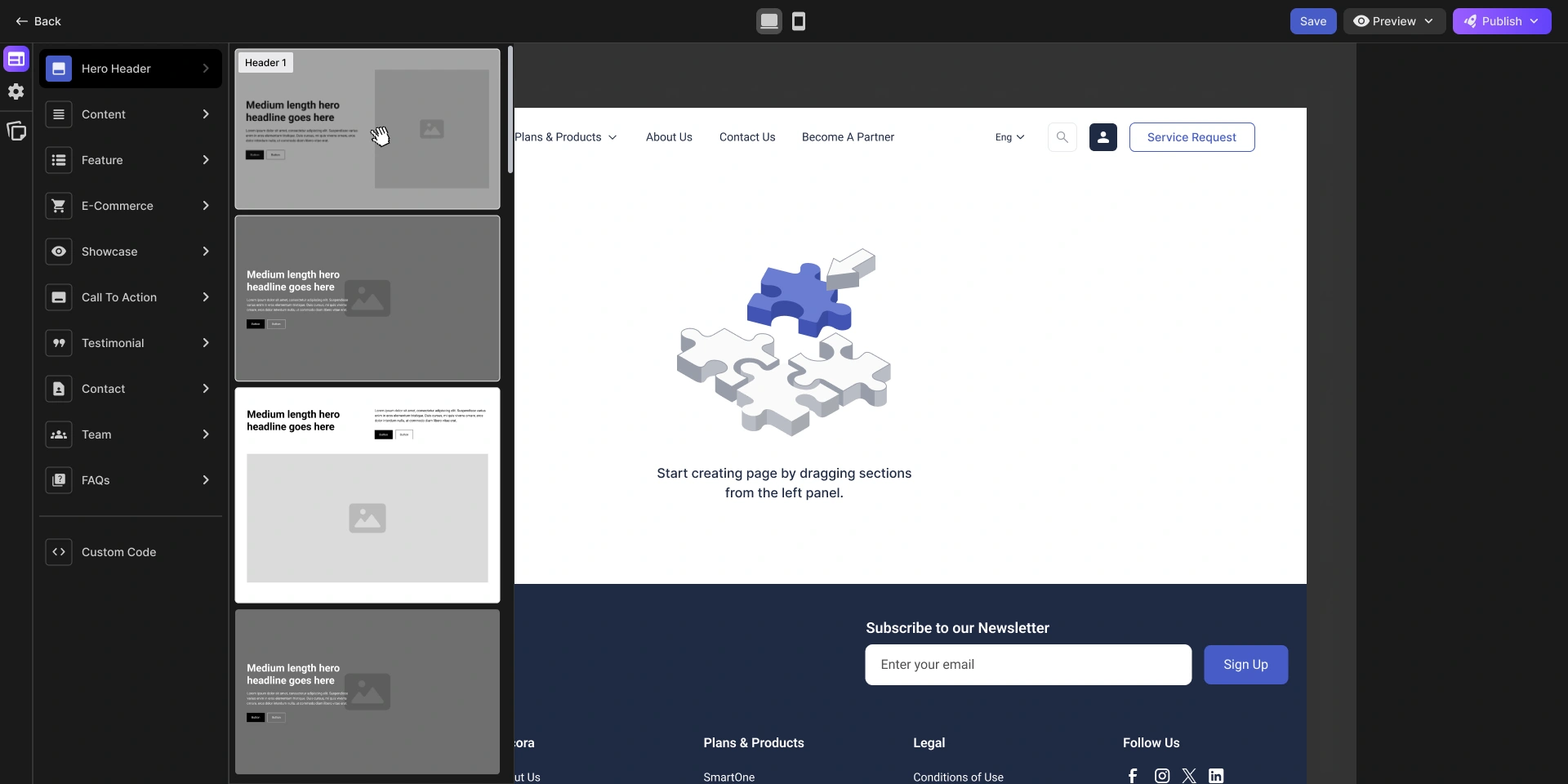 This tool enables admins to add and edit sections, create new pages, and manage content easily. The builder is designed to be user-friendly, with page settings and sections on the left and section-specific settings on the right.