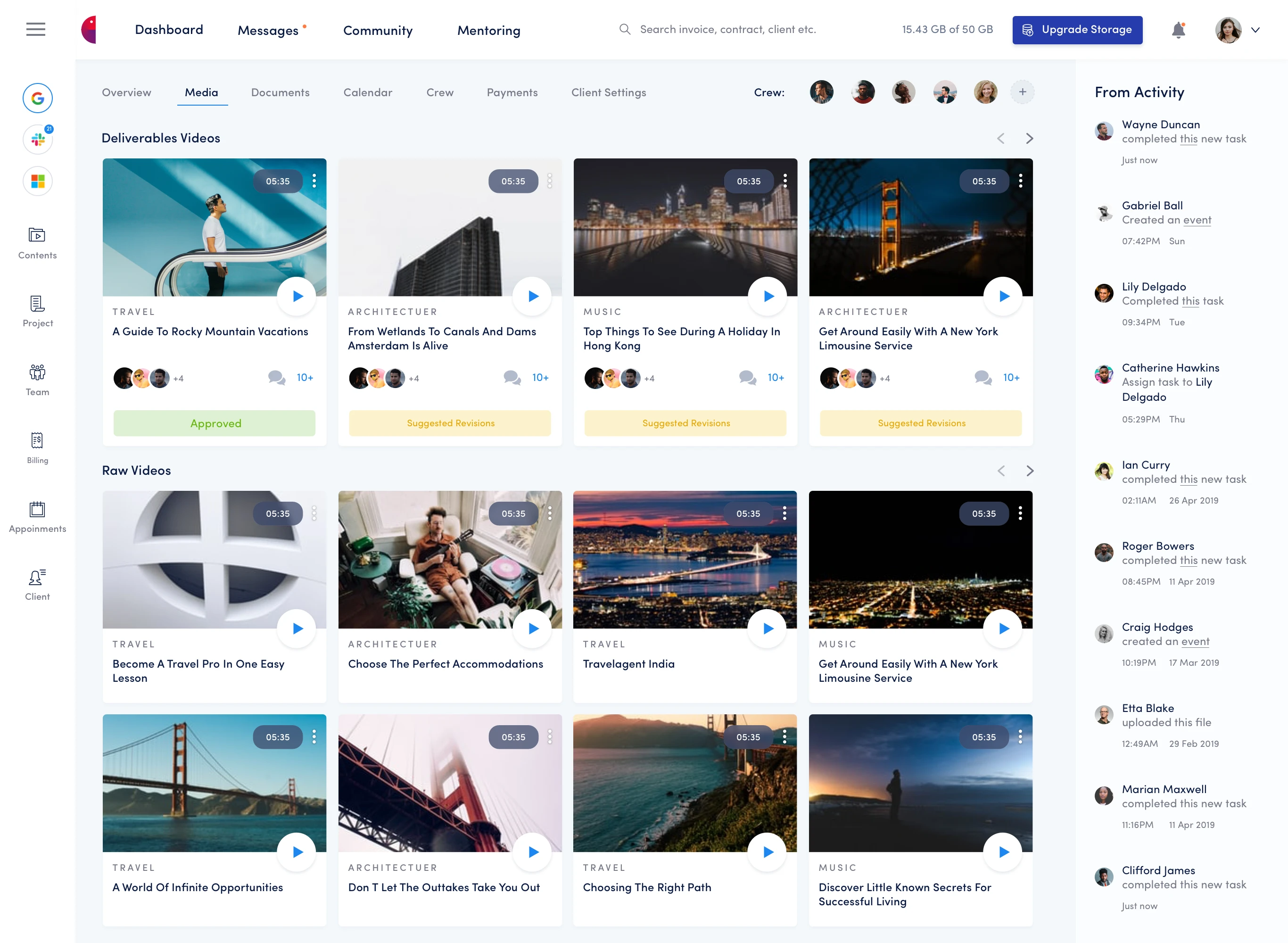 This is one of my client's projects. We designed the dashboard for crew and content management like videos and assets.