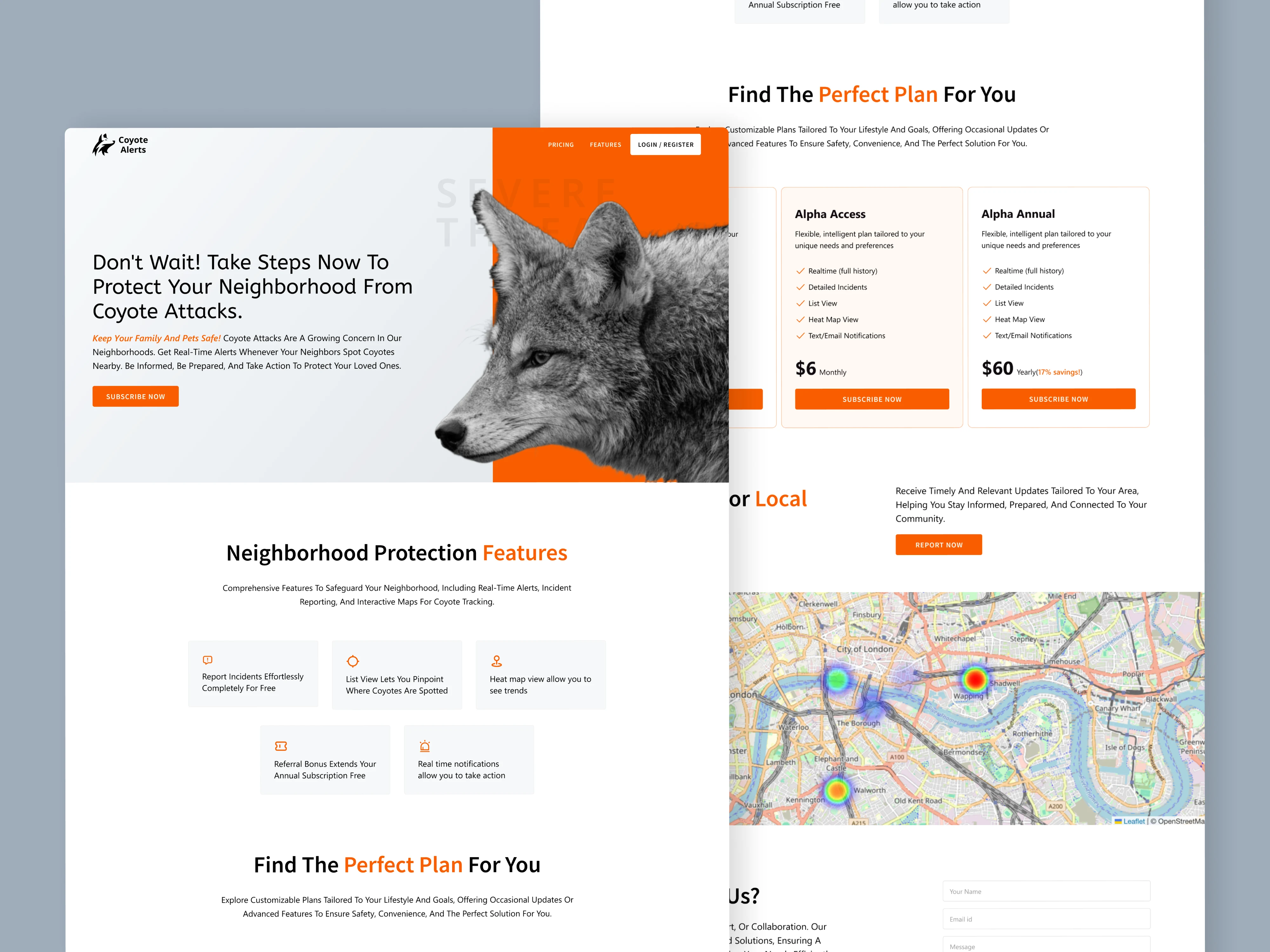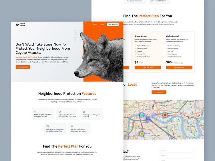 We crafted a modern, responsive UI/UX and developed a new website for Coyote Alerts, aimed at improving user engagement and neighborhood safety. The design features bold visuals, intuitive navigation, and clear call-to-actions to encourage real-time alert sign-ups. Built with a mobile-first approach, the site ensures seamless access across devices. From wireframes to full-stack development, the platform delivers a user-centric experience that raises awareness of local coyote activity while promoting proactive community involvement and faster response times.