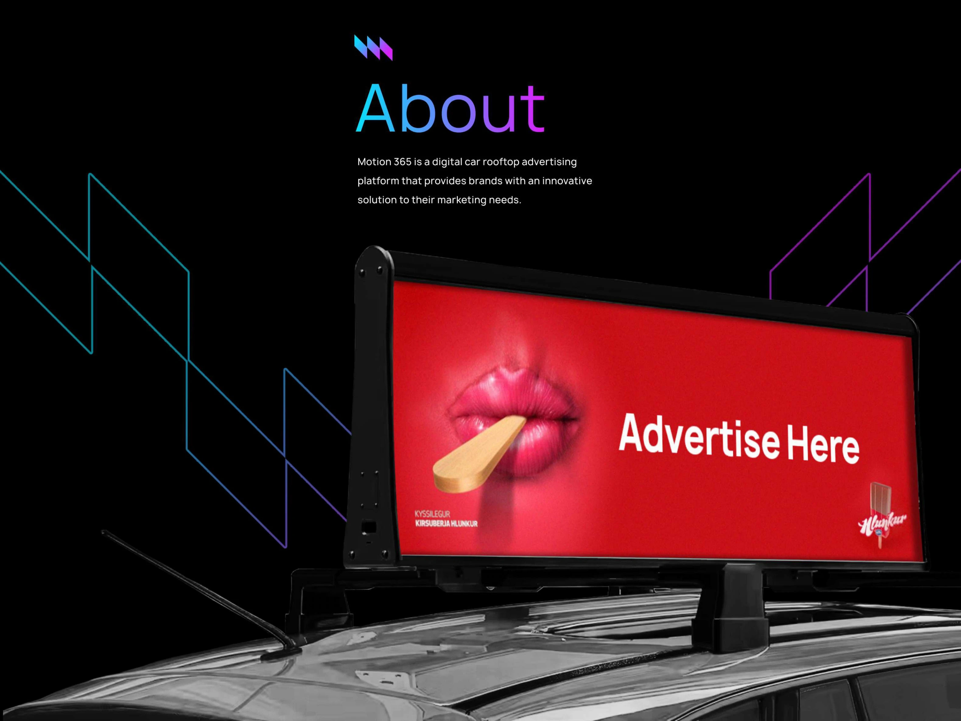 Motion 365 is a digital car rooftop advertising platform that helps brands reach their target audience through innovative, mobile, and trackable ad displays.