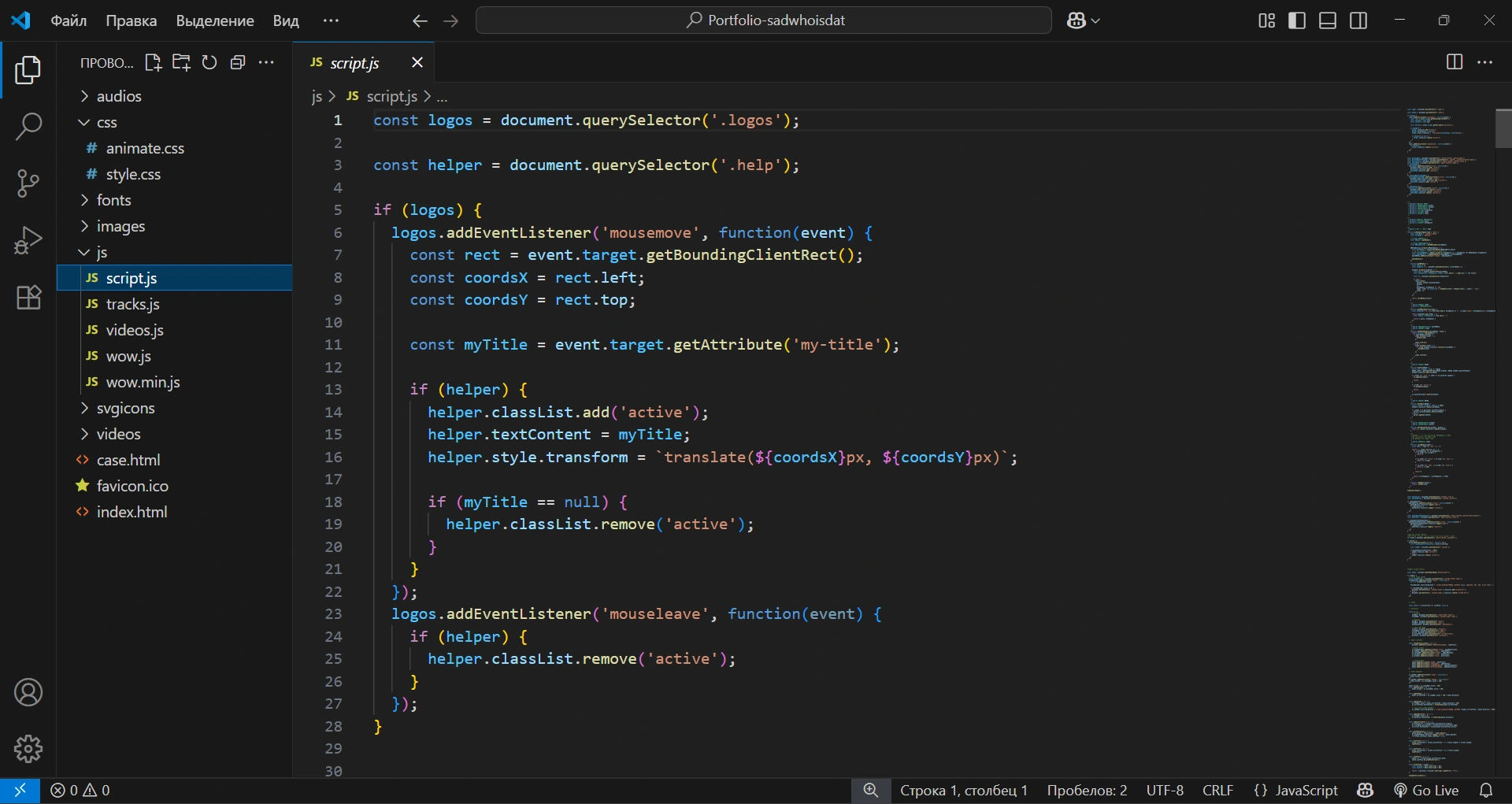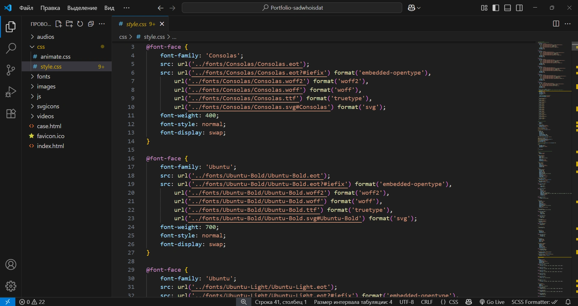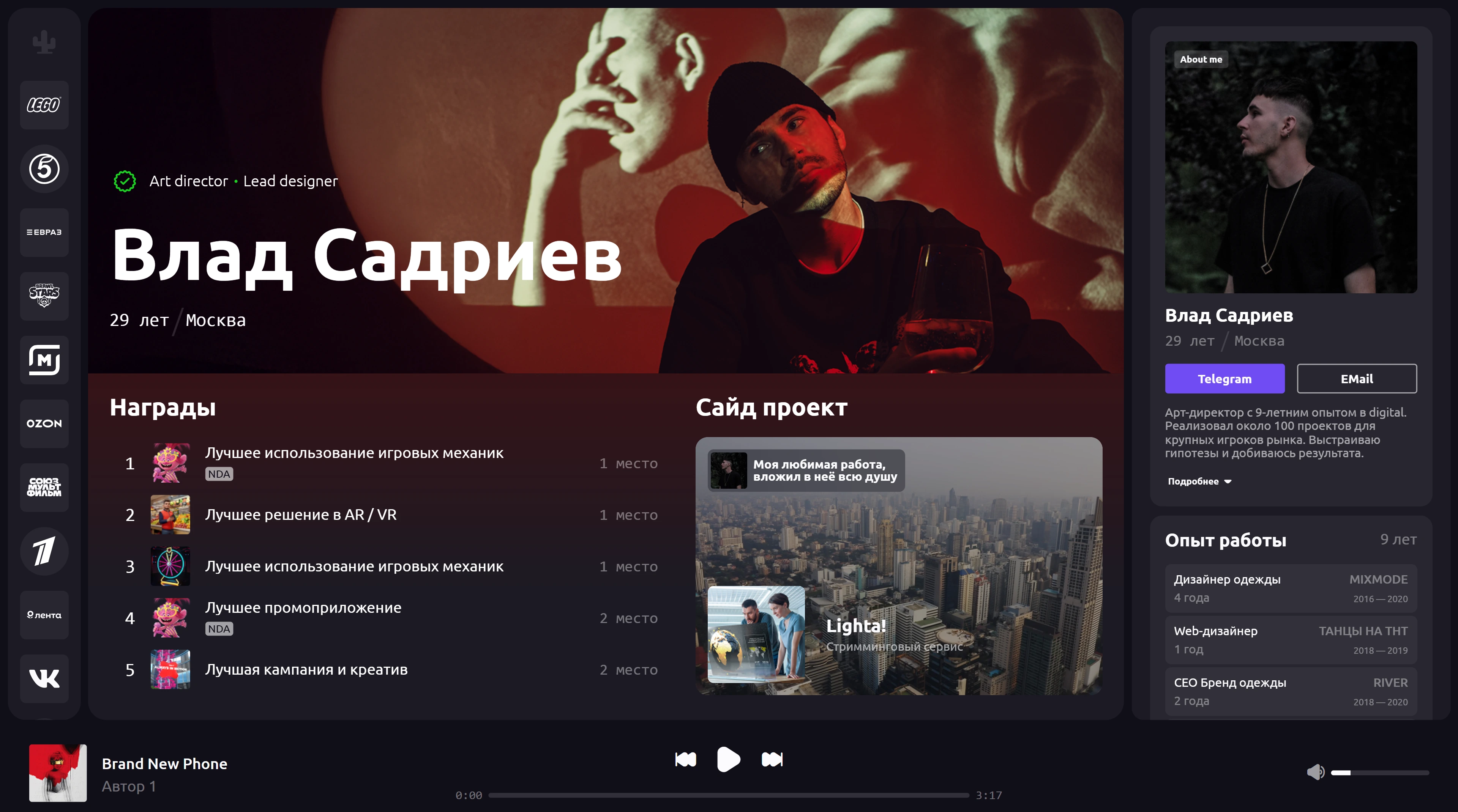 The work was done in HTML, CSS, JS, Flexbox, Grid. The markup was done using the BEM methodology. The work turned out to be Pixel Perfect for all layout breakpoints. For all icons on the site, I generated an icon font using the Icomoon service. I made a custom audio player in pure JS with switching music and content, as well as a video player in JS with switching videos and content. I also made an interesting preloader with the output of the percentage of the site load.