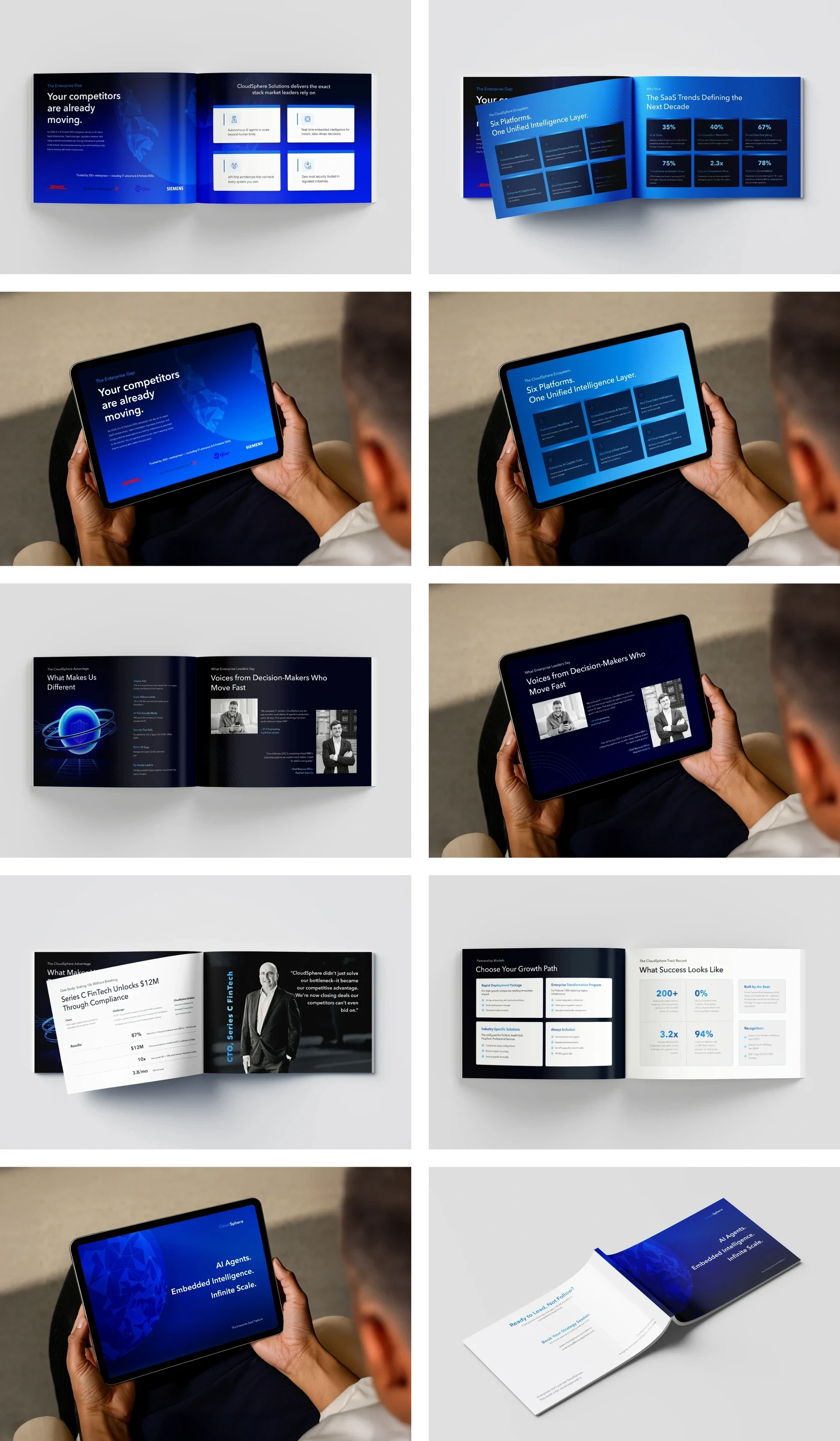 Our Solution: We designed a modular 12-page brochure structured around key stakeholder needs: ROI, integration, security, and scalability. A clean blue palette signaled trust and reliability. Comparison charts, infographics, and short case highlights replaced text-heavy sections. Each spread was built to answer one essential question, making the brochure a flexible, presentation-friendly sales asset that helped CloudSphere turn complex SaaS value into a visually structured story.