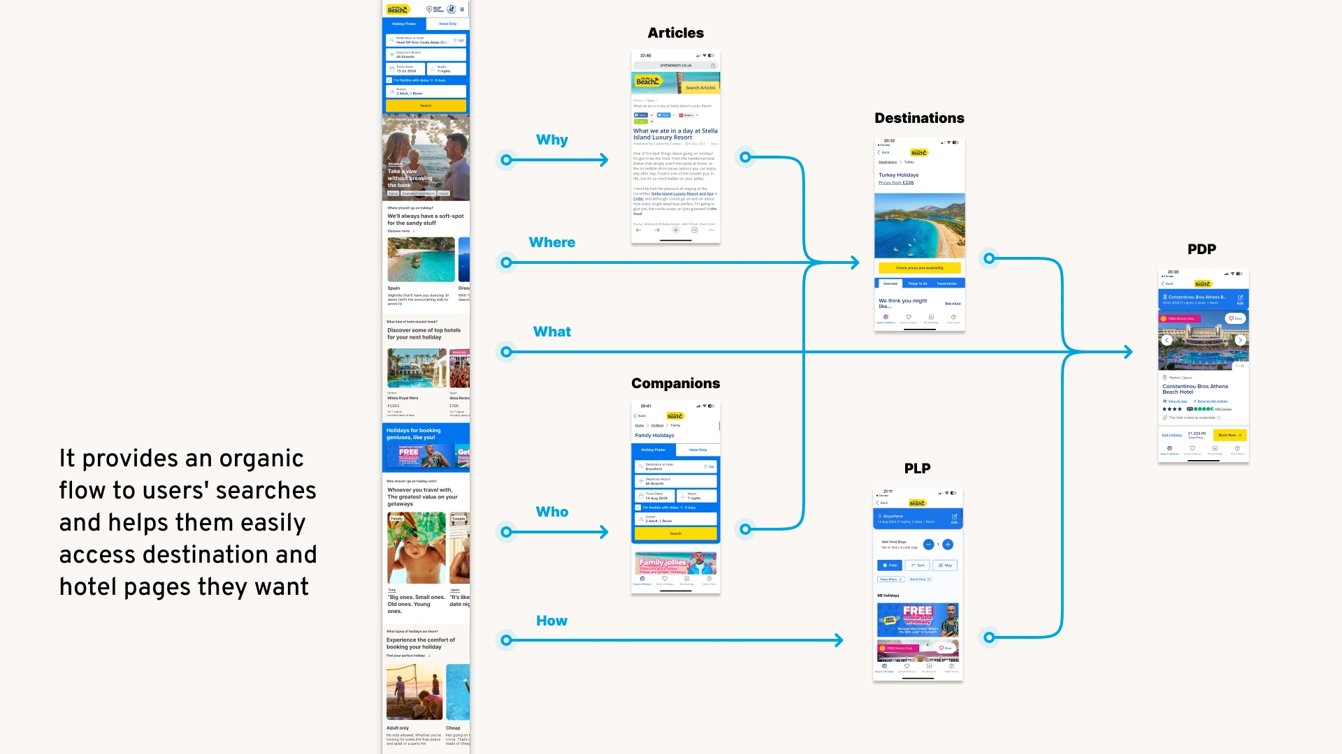 Analyzed data, defined goals (reduce booking time, boost return visits), created personas, and mapped vacation decision journeys. Structured content intuitively by "why/where/what/who/how" with seamless transitions from inspiration to booking.