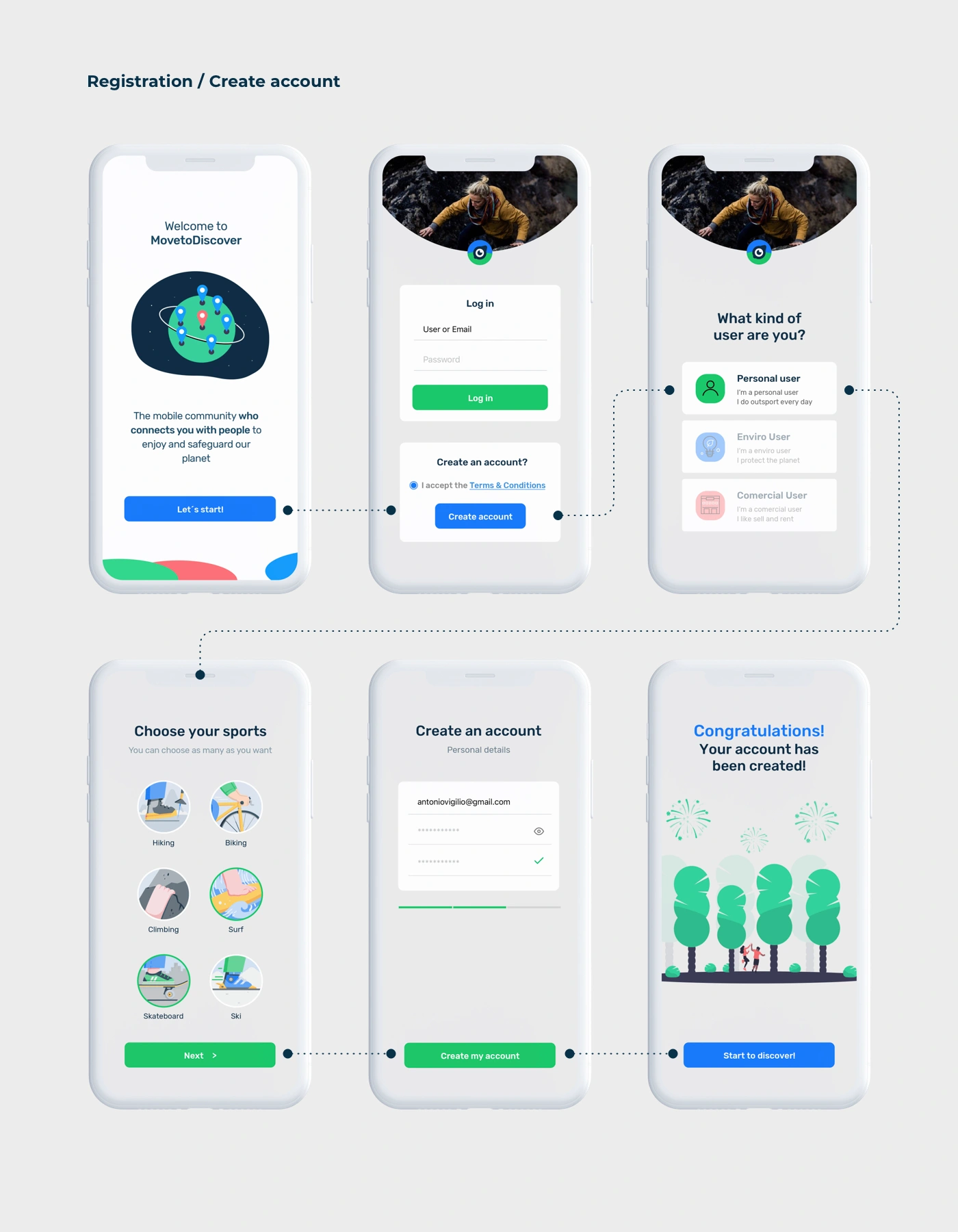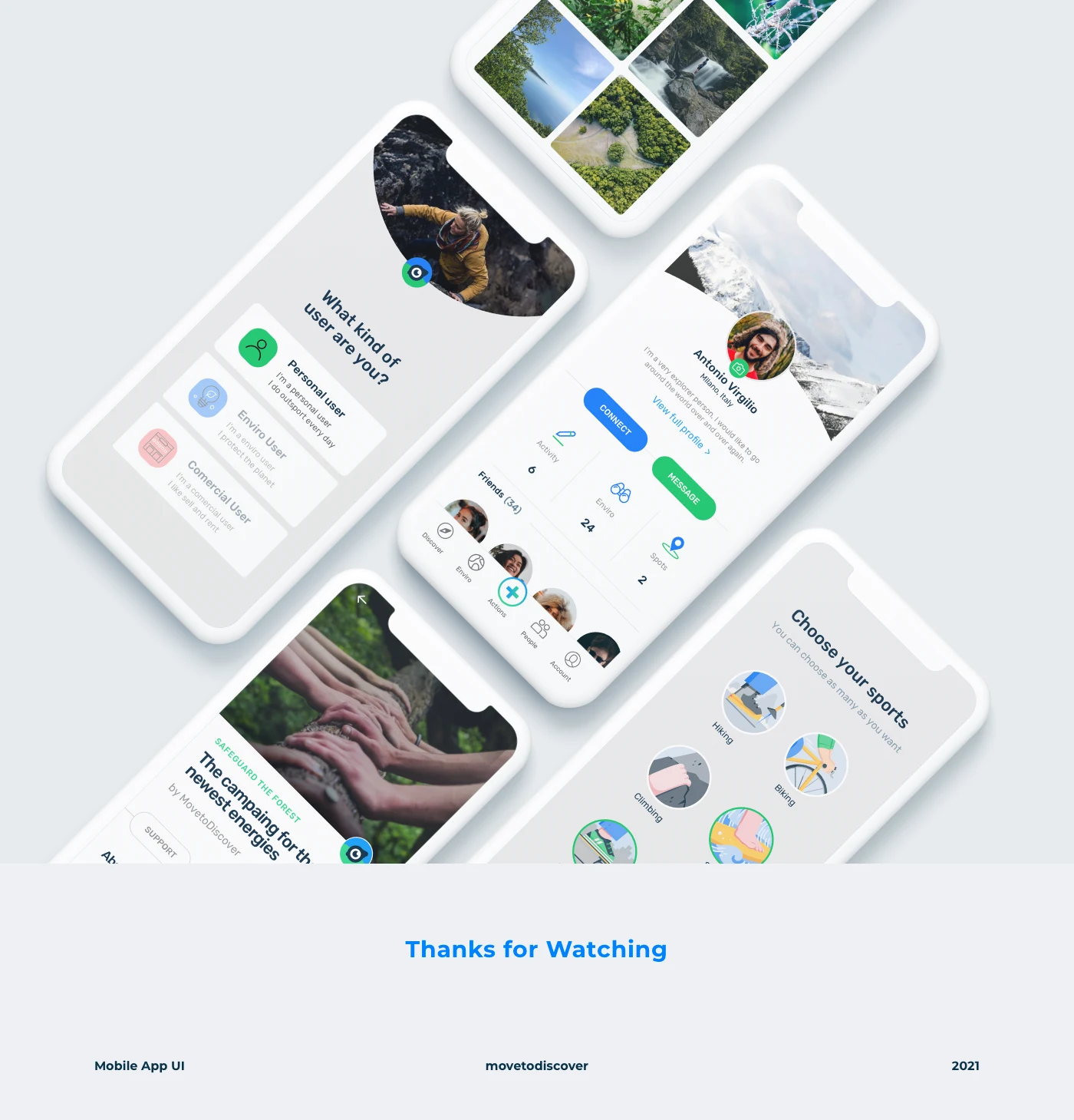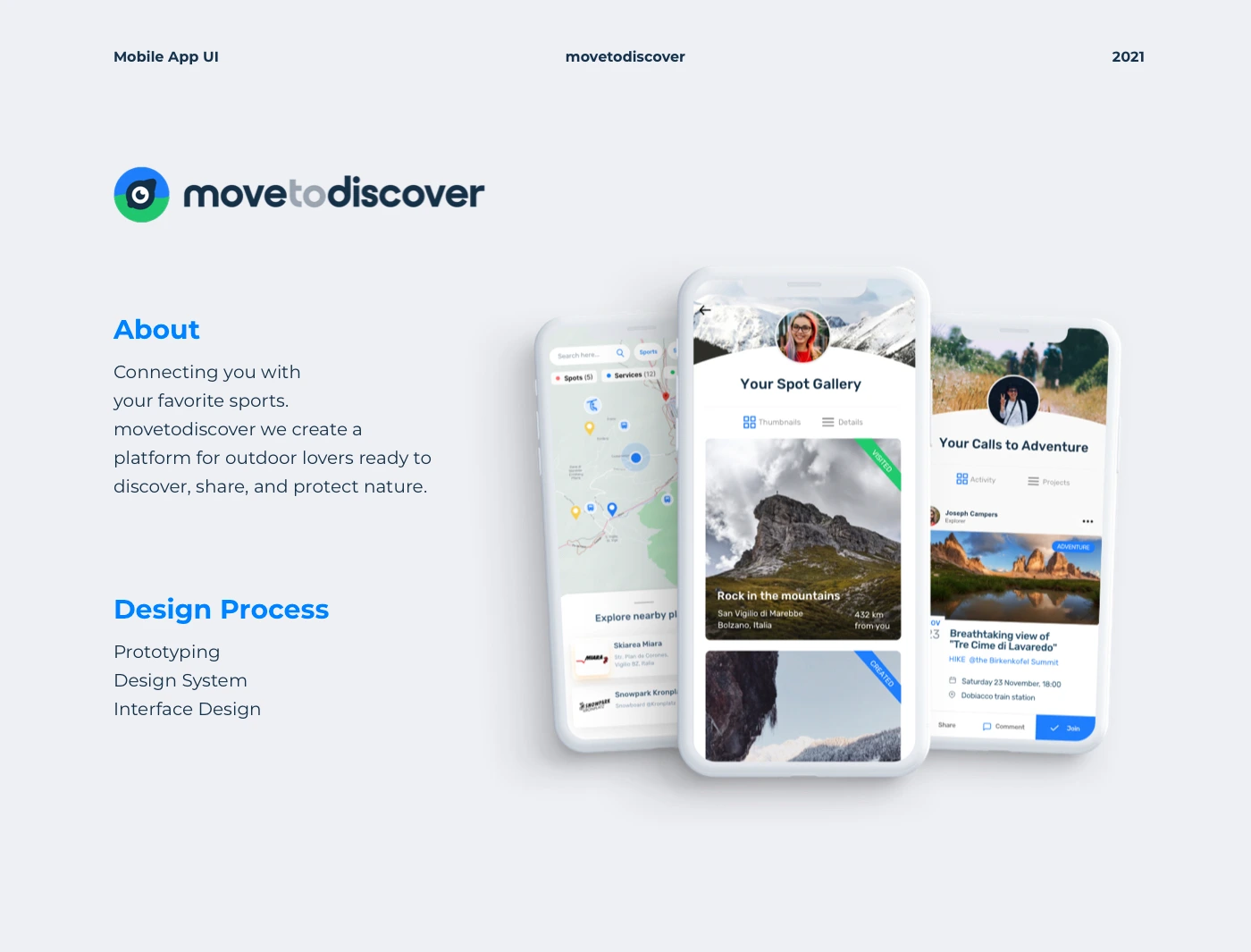 App design and design system for MoveToDiscover. The App connects outdoor enthusiasts with their favorite sports and adventures.