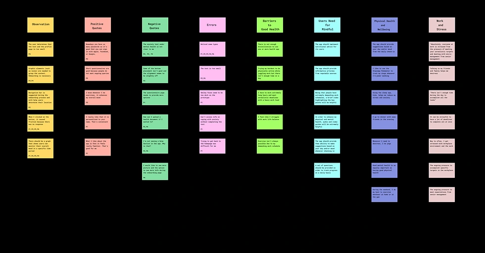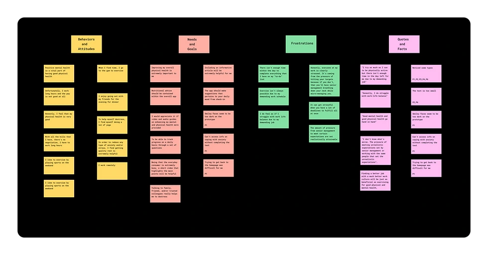 Following the empathy maps, I created affinity maps to cluster insights and surface recurring themes, helping clarify participant needs and pain points.
