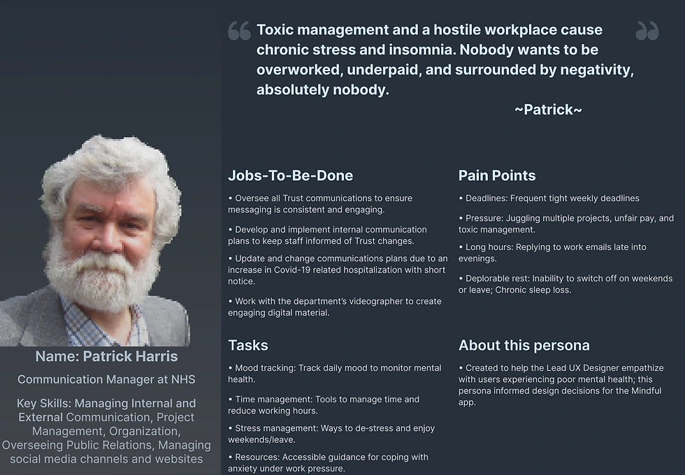 Using interview insights, I developed two user personas to represent target users and prioritize features. These personas guided user-centered design decisions for Mindful. Above is one of the personas I created.
