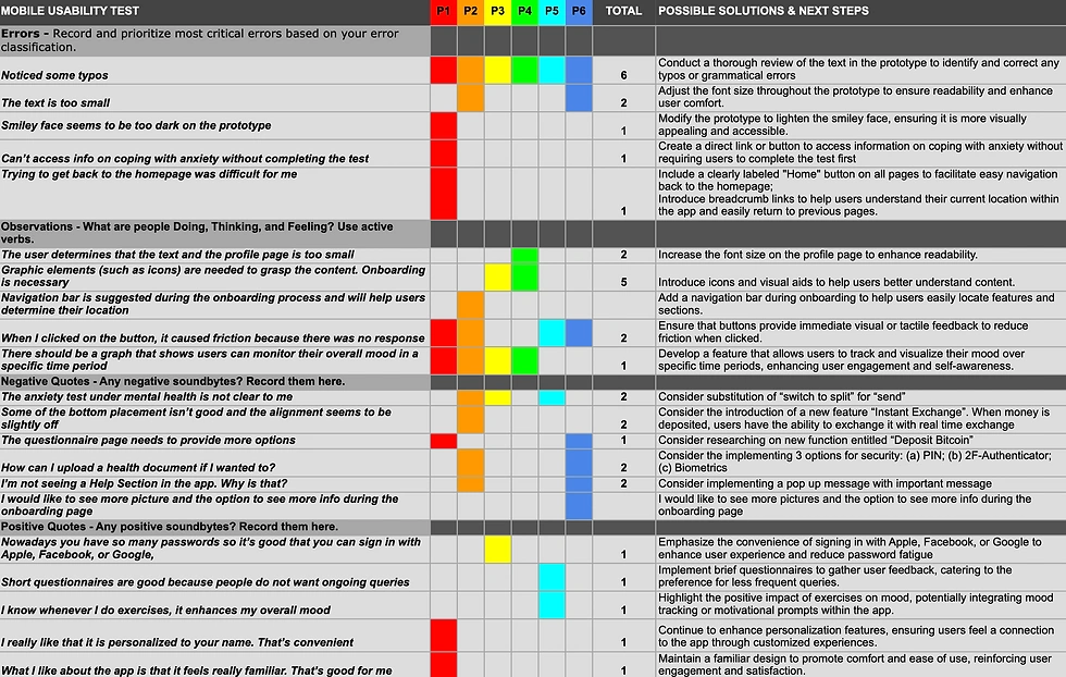 I tested a prototype built from mid-fidelity wireframes to gather evaluative feedback on designs. I collected qualitative feedback during moderated remote sessions. I created an affinity map to cluster comments and surface recurring patterns and themes, then used a rainbow spreadsheet to code and analyze the results for prioritization and iteration.