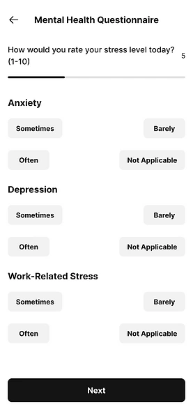 User interviews ran smoothly with high engagement, revealing workplace stress as a primary concern that shaped the product direction. Screen transition animations also performed well.