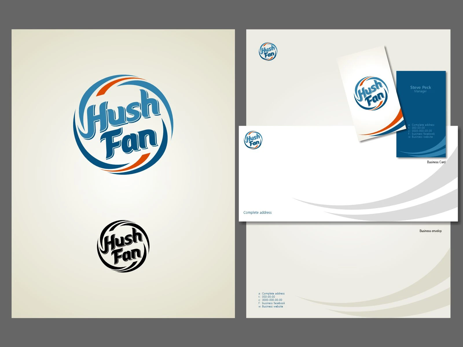 Hush Fan | Visual Identity "Hush Fan" provides cooling system installation with an emphasis on silent, stress-free performance. The logo features a fluid wind motif that frames the brand name, utilizing a calm blue palette to signify cooling. A strategic touch of red represents the effective dissipation of heat. Custom typography was developed to ensure a bold, modern aesthetic that reflects the strength and reliability of the brand.