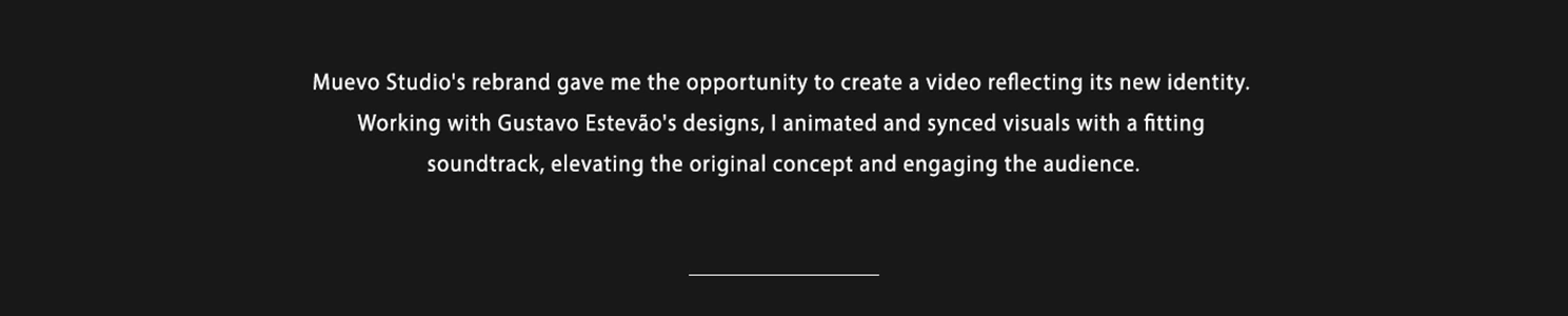 Animated Muevo Studio’s rebrand video using Gustavo Estevão’s designs, syncing visuals to music to enhance the new identity and engage the audience.