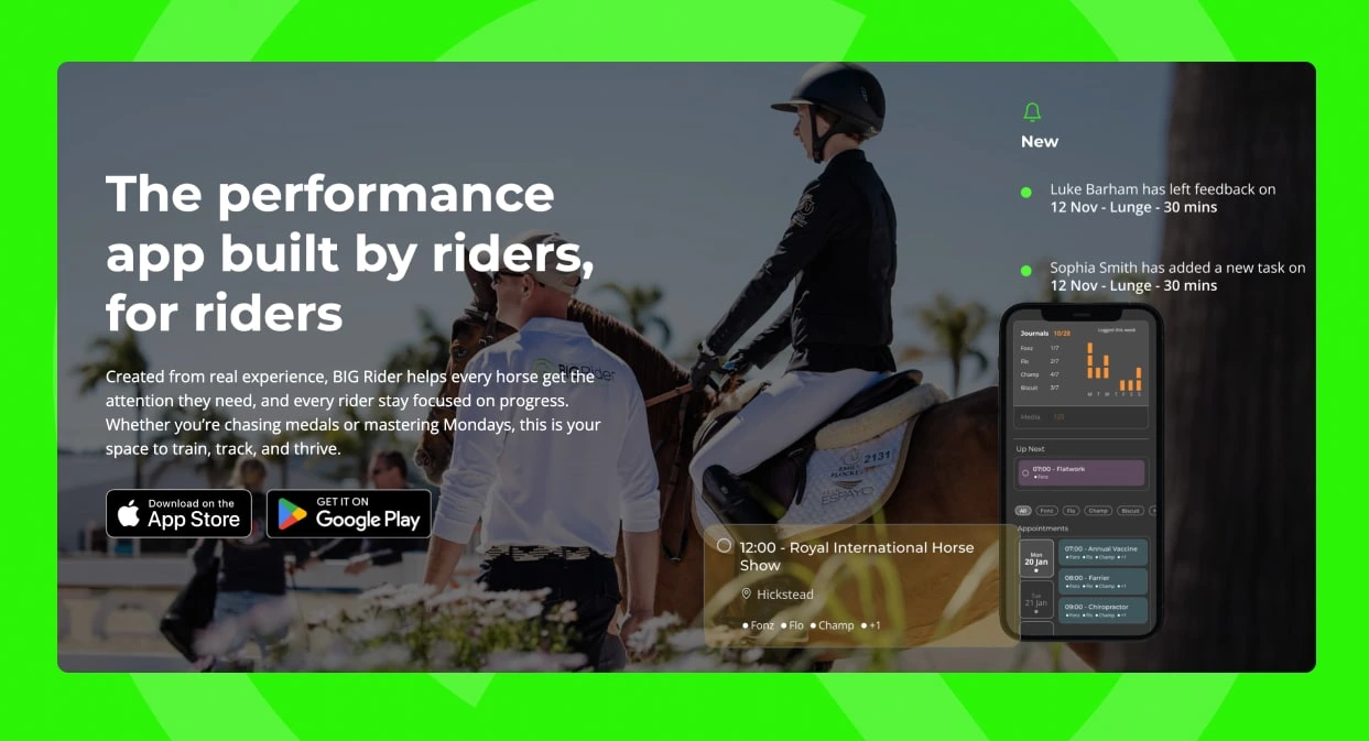 We designed and built a marketing site on Webflow for BIG Rider to complement the native app - bringing the brand and value prop to life for users and sponsors.