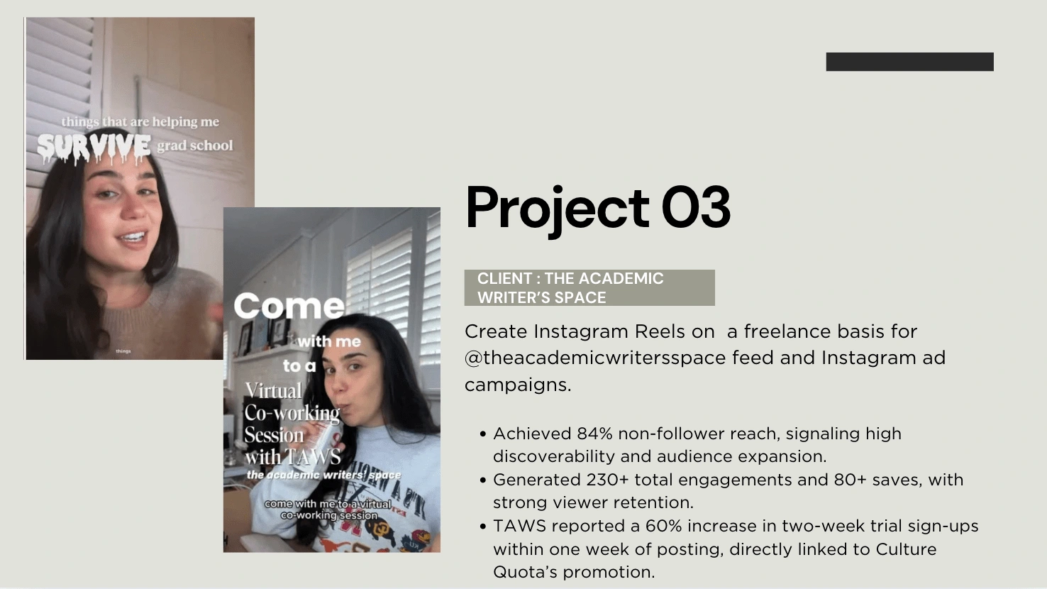 Created Reels for @theacademicwritersspace with 84% non-follower reach, 230+ engagements, 80+ saves, and strong retention—driving major discovery.