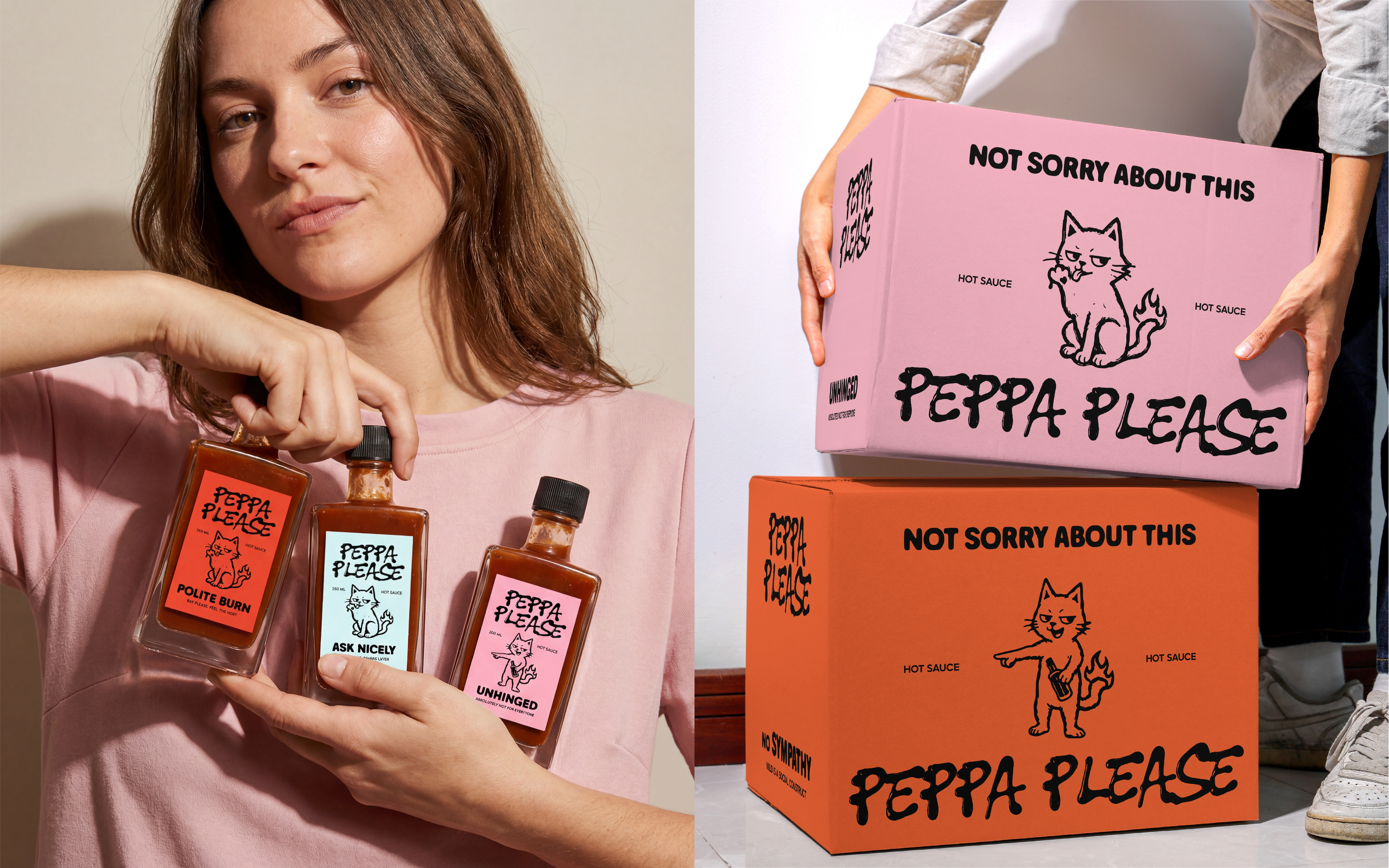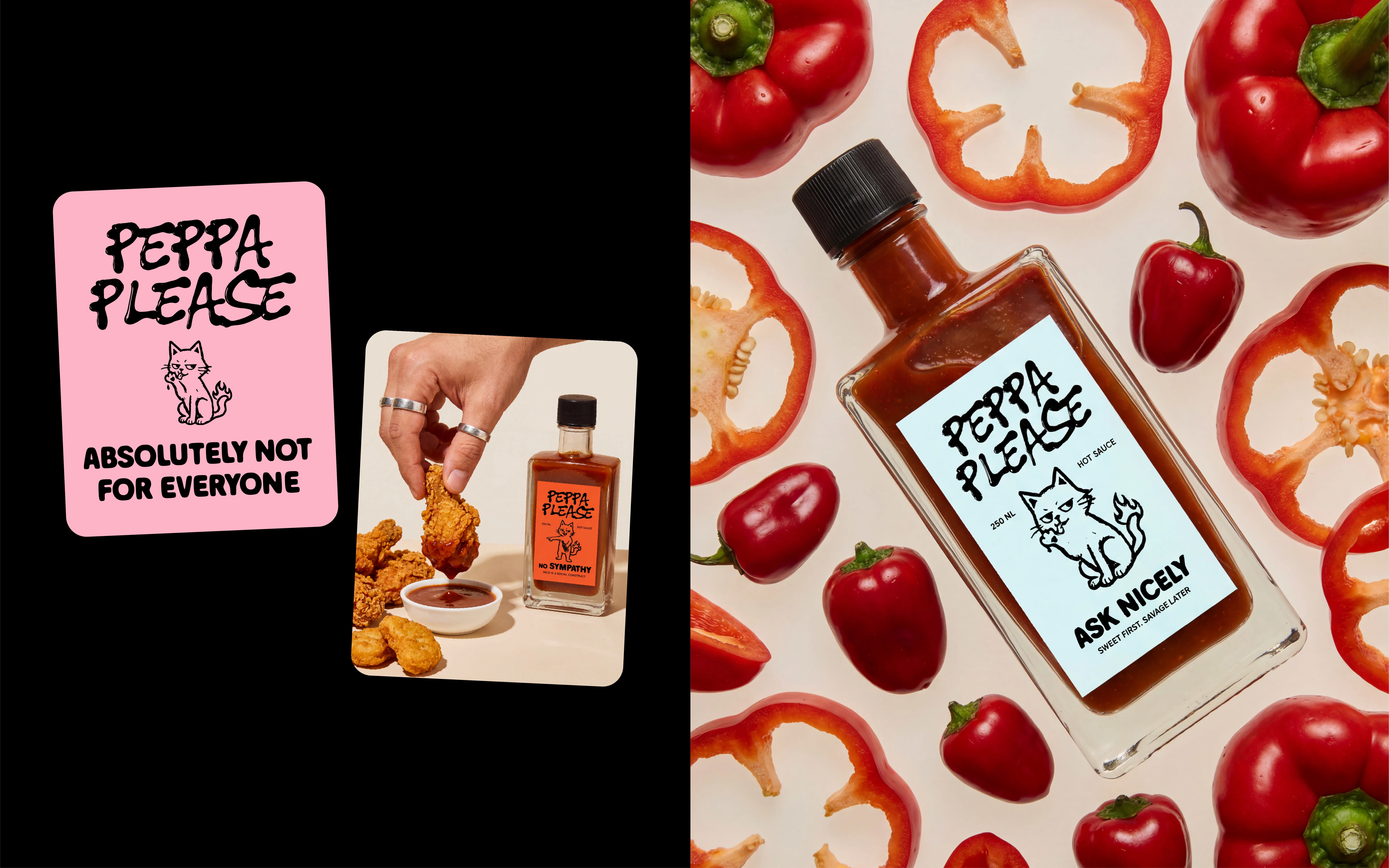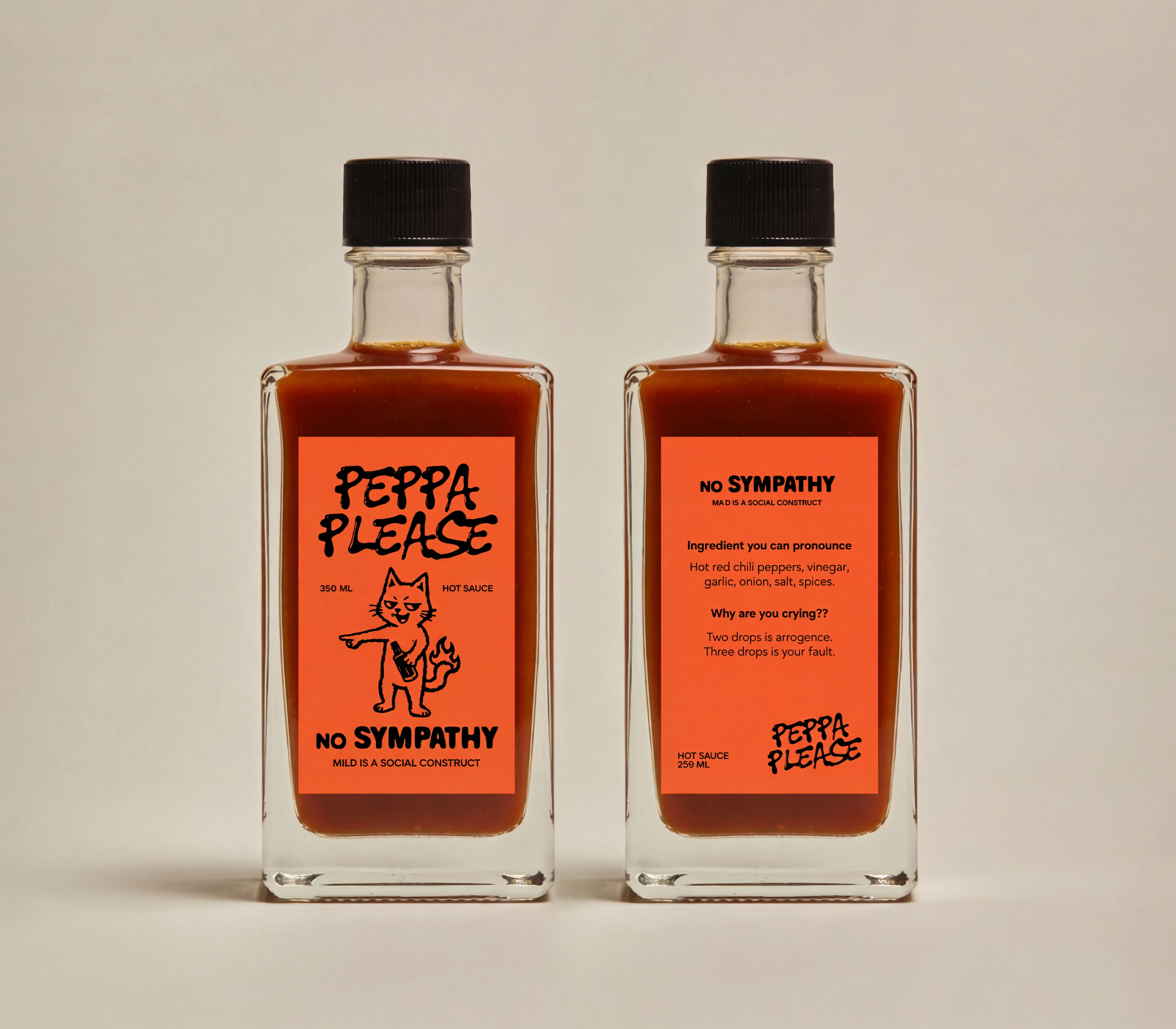 Peppa Please is a hot sauce brand that treats heat as personality, not just flavor. Irreverent, playful, and intentionally unhinged, the brand moves away from macho-spicy tropes and overly serious gourmet cues. Instead, it embraces humor, attitude, and emotional contrast. Peppa Please knows it is hot and chooses to have fun with it.