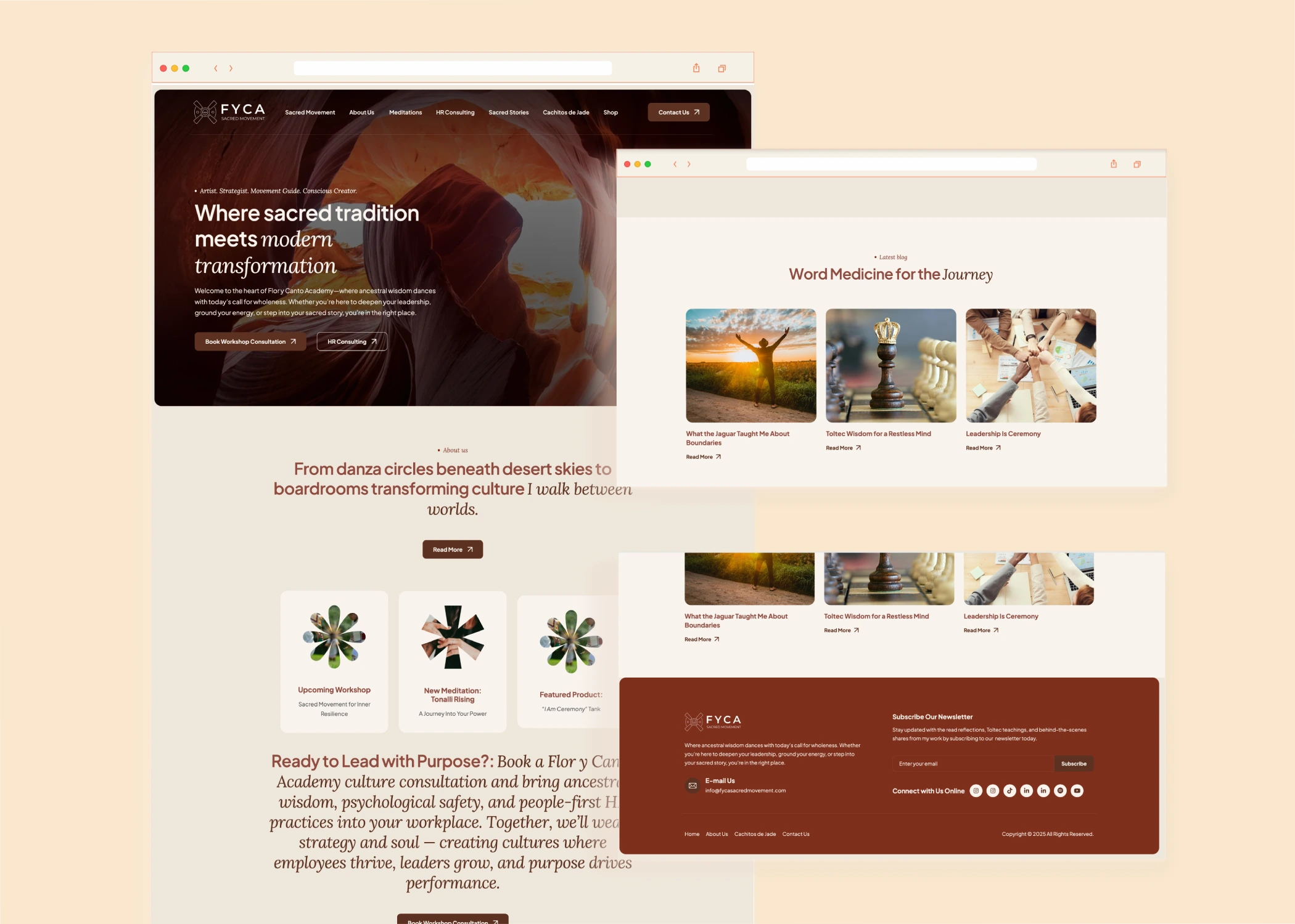 I created a compelling, spiritually driven website for FYCA Sacred Movement that seamlessly blends the power of movement, meditation, and ancestral wisdom into a digital experience. The website was built on WordPress, designed using Elementor, and optimized with Yoast SEO. With a rich visual language, intuitive user flow for podcast episodes and program sign-ups, and full responsiveness, the site now acts as a transformative platform connecting users with movement-based spiritual practices and deep engagement.