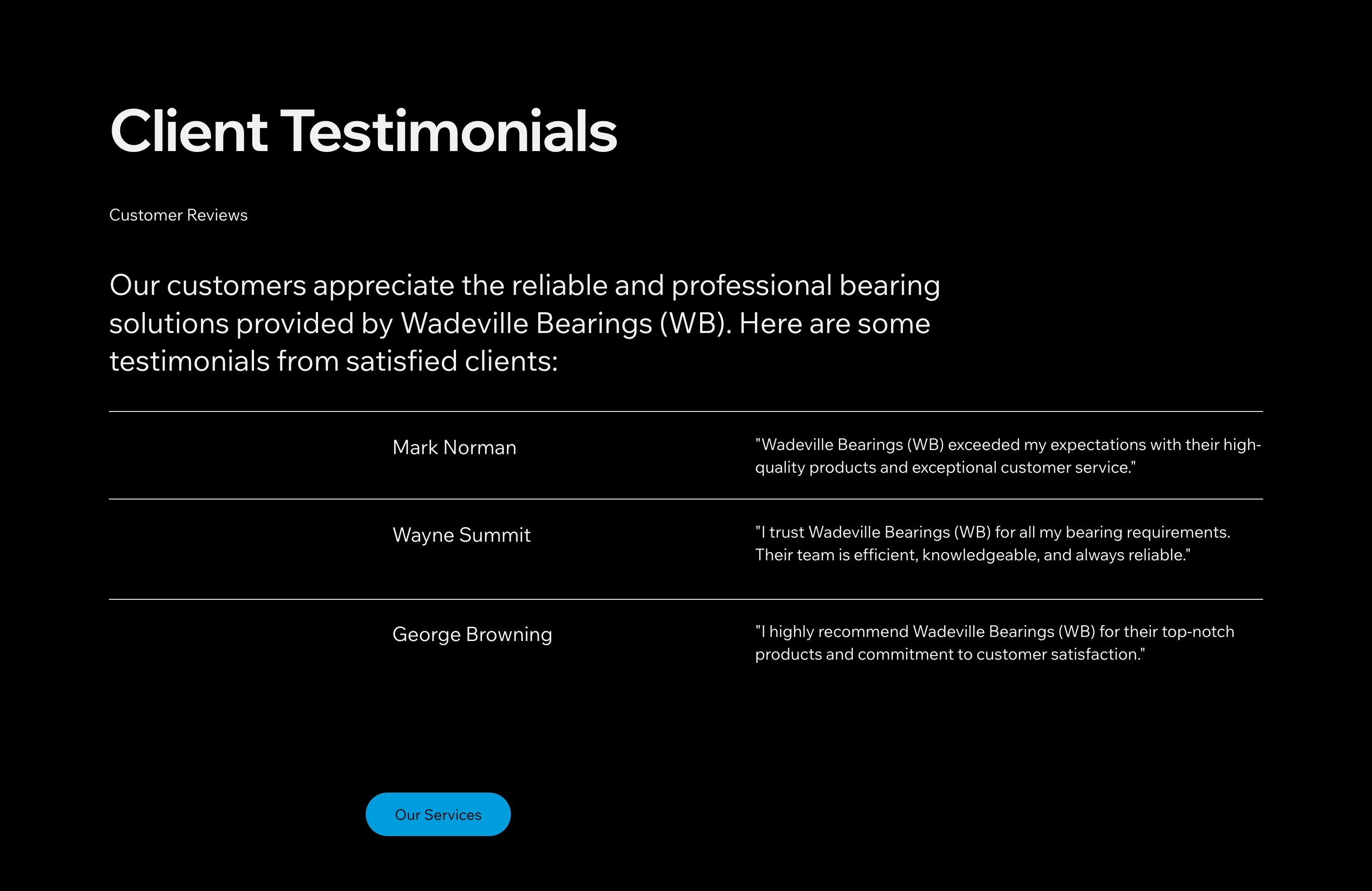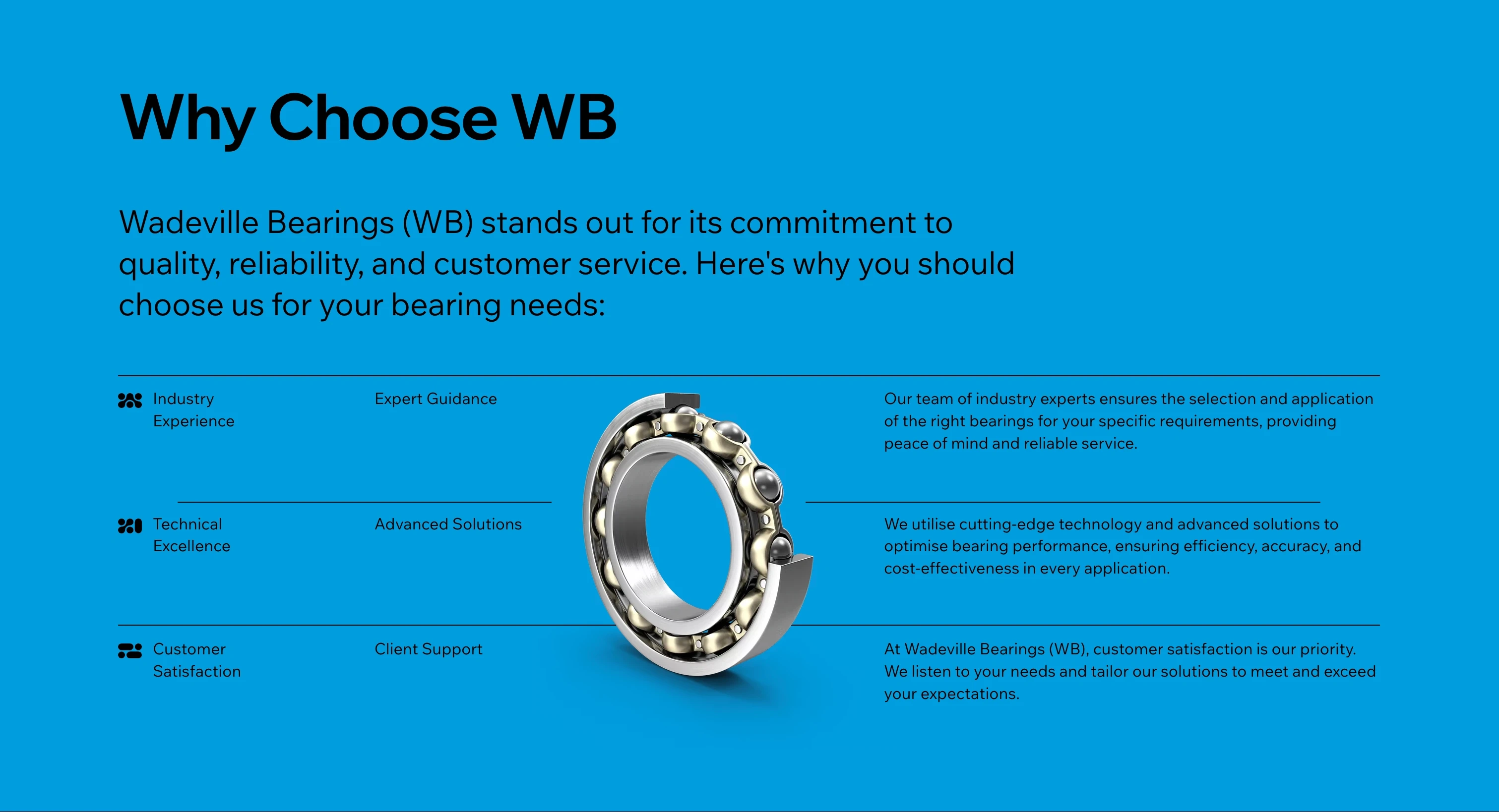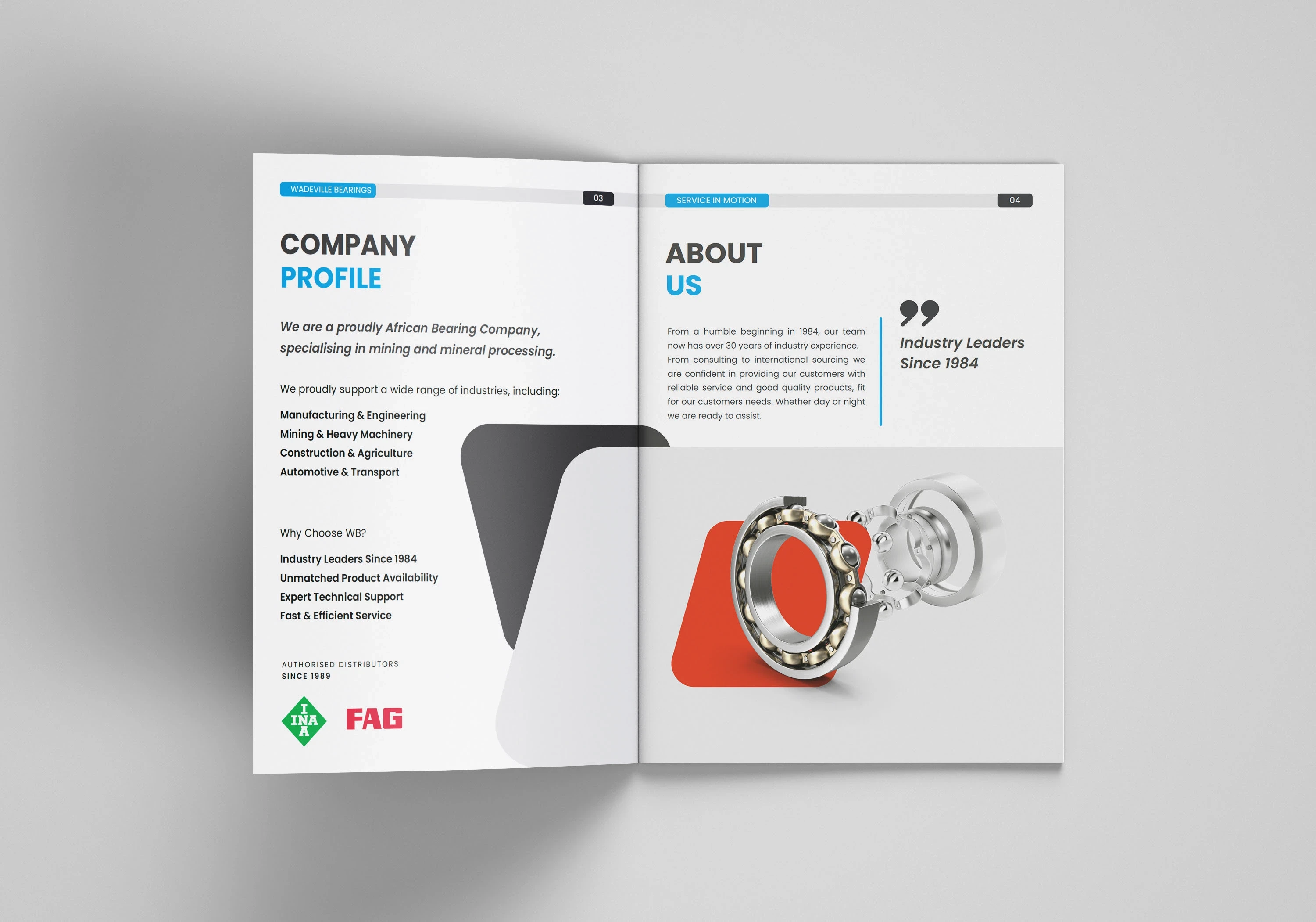 Wadeville Bearings, a trusted South African ball-bearing distributor, underwent a website redesign with a bold industrial aesthetic and a new A5 brochure.