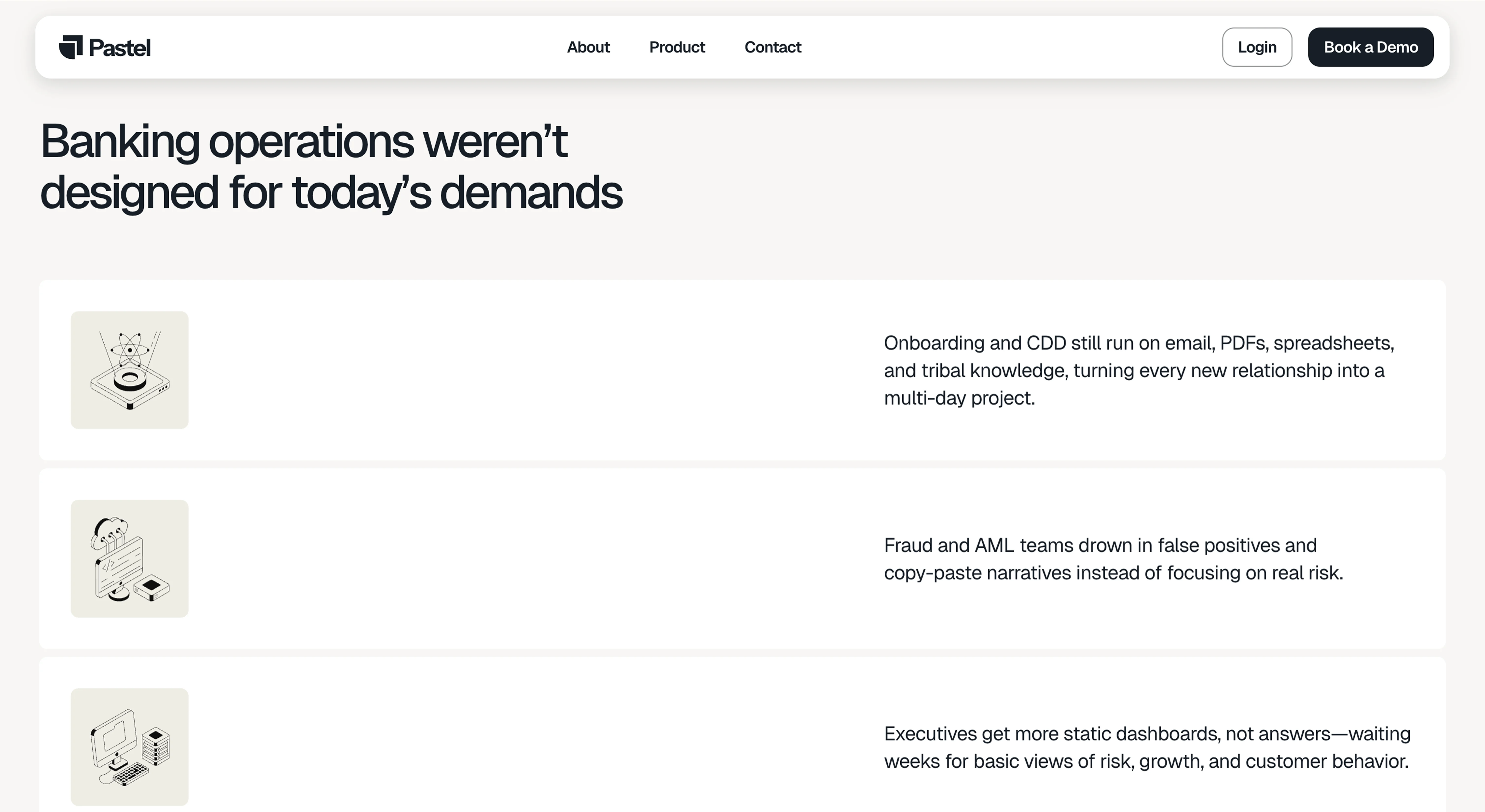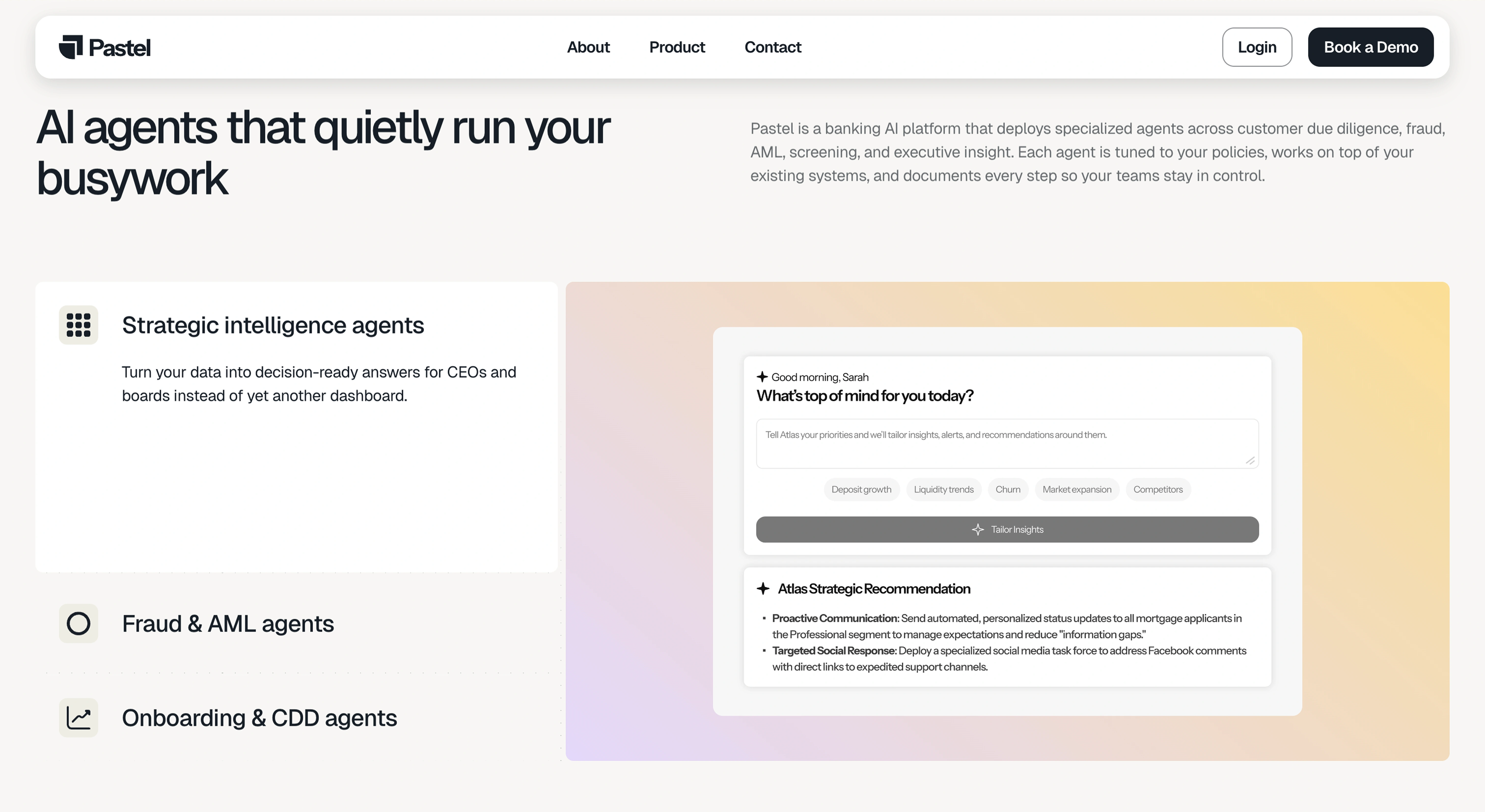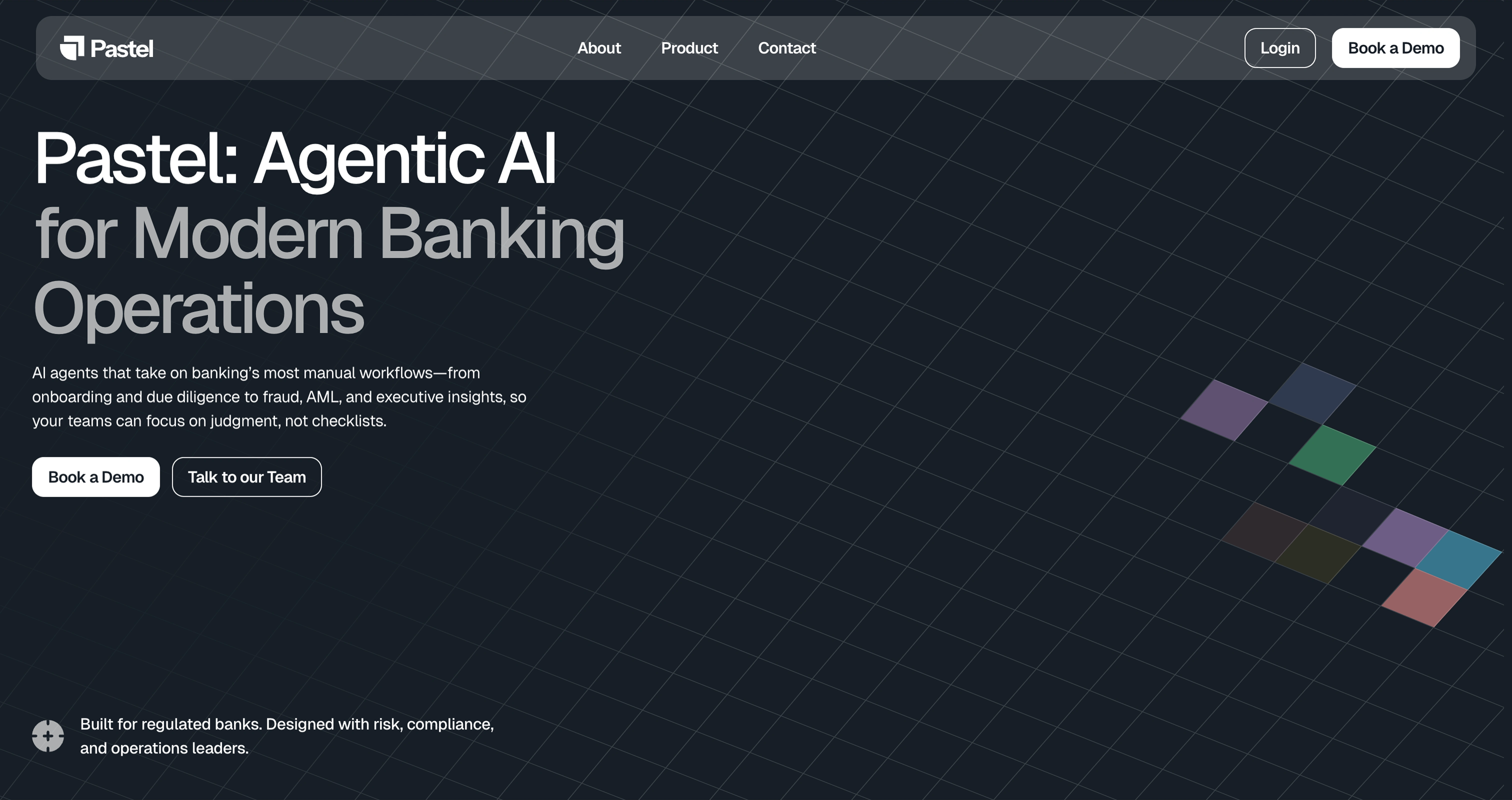 Overview: Pastel is an agentic AI platform that automates core banking operations, including onboarding, fraud detection, and compliance. By handling repetitive, manual tasks within human-defined rules, Pastel ensures every action is fully explained and transparent.