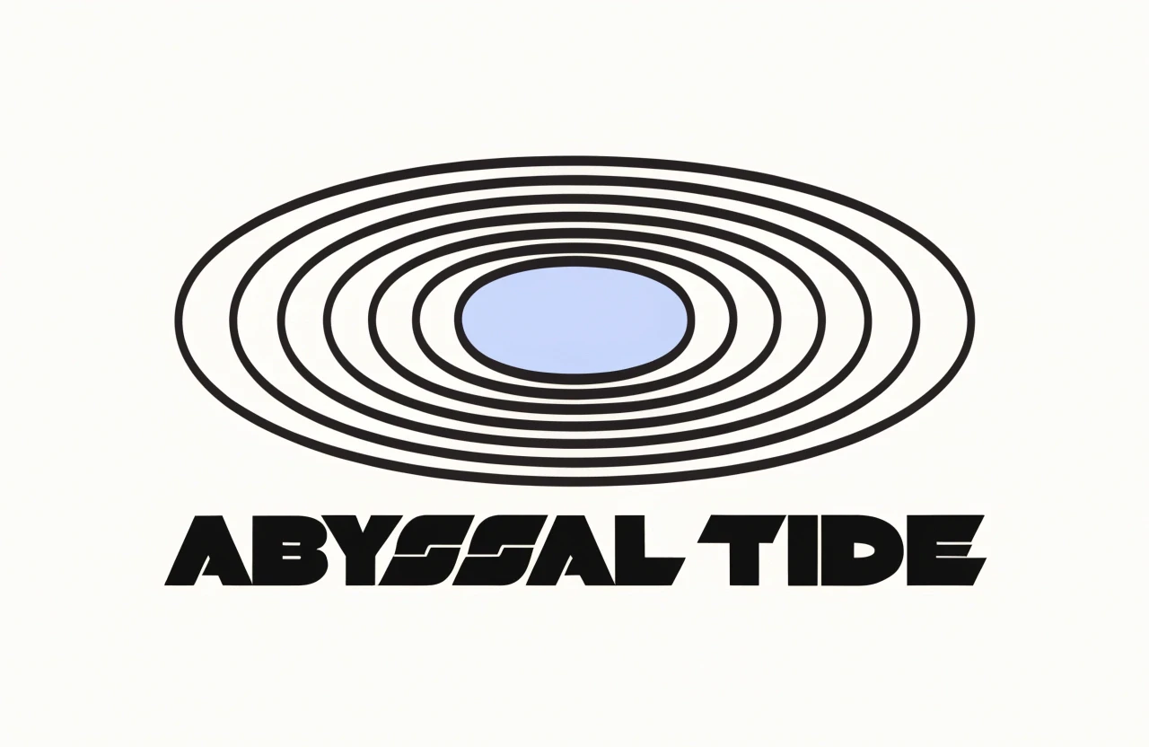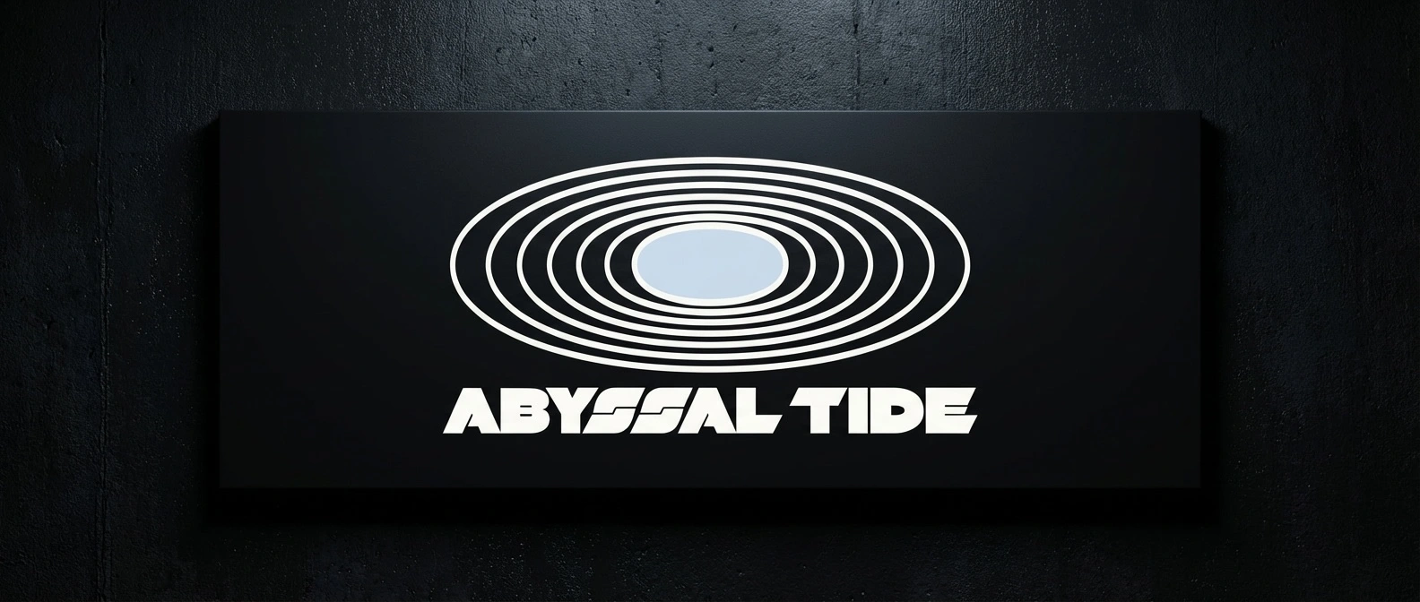 ABYSSAL TIDE set in a heavy mono grotesque beneath — wide, low, pressured. All caps. The wordmark is as horizontal as the mark. Everything in this logo has been pushed as wide as it can go and as short as it can be without losing legibility.