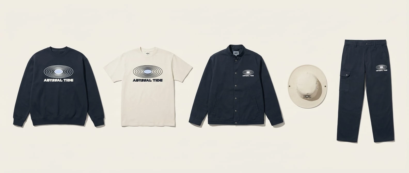 The halocline. The invisible boundary layer in the ocean where fresh water meets salt water — where two systems occupy the same space without fully mixing, where visibility distorts and the boundary shimmers but never resolves. Every major design decision in this project — the split retail environment, the two-register layout system, the compression of the mark, the seasonal color contained within Ink rings — is a restatement of the halocline. Surface above. Depth below. The meeting point is where ABYSSAL TIDE operates.