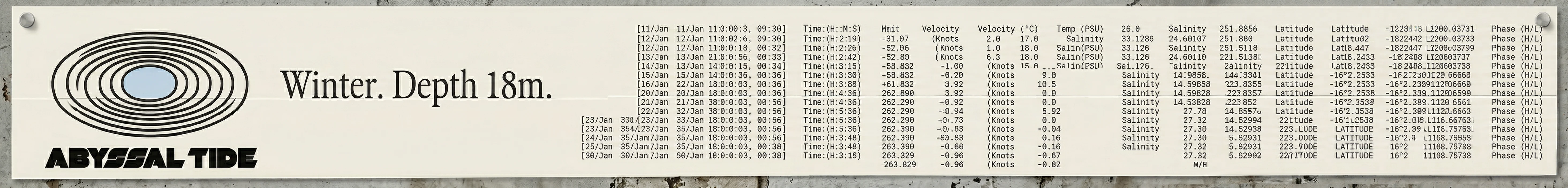 Seasonal Campaign Poster — 3:1 horizontal. The mark top left, small, with Ice center. The data band below the horizon rule fills the lower register completely — forty lines of tide tables, coordinates, salinity readings, moon phases — dense enough that the individual numbers stop mattering and the density itself becomes the message. The ocean does not simplify for legibility.