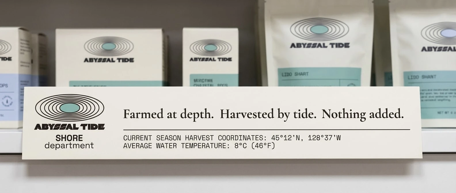ABYSSAL TIDE is a precision aquaculture and sea farming brand built around a single conceptual tension: the ocean is calm on the surface and operating under forces so immense at depth that they are almost impossible to perceive until they are irreversible. The brand lives in that space — between the measurable rhythm of the tide and the absolute pressure of the abyss. Ancient knowledge and precise data. Cycles older than agriculture and monitoring systems running in real time.