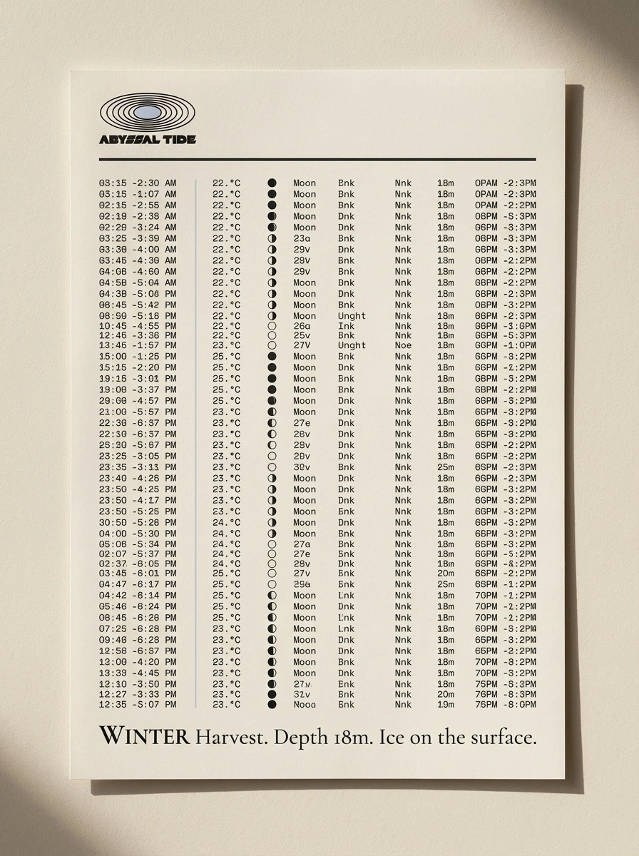 Almanac Page — A seasonal harvest document formatted as a cross between a tide table and a laboratory report. Dense mono data filling the lower half. A single Cormorant Garamond headline at the bottom: "WINTER Harvest. Depth 18m. Ice on the surface." The data tells you what happened. The headline tells you what it meant.