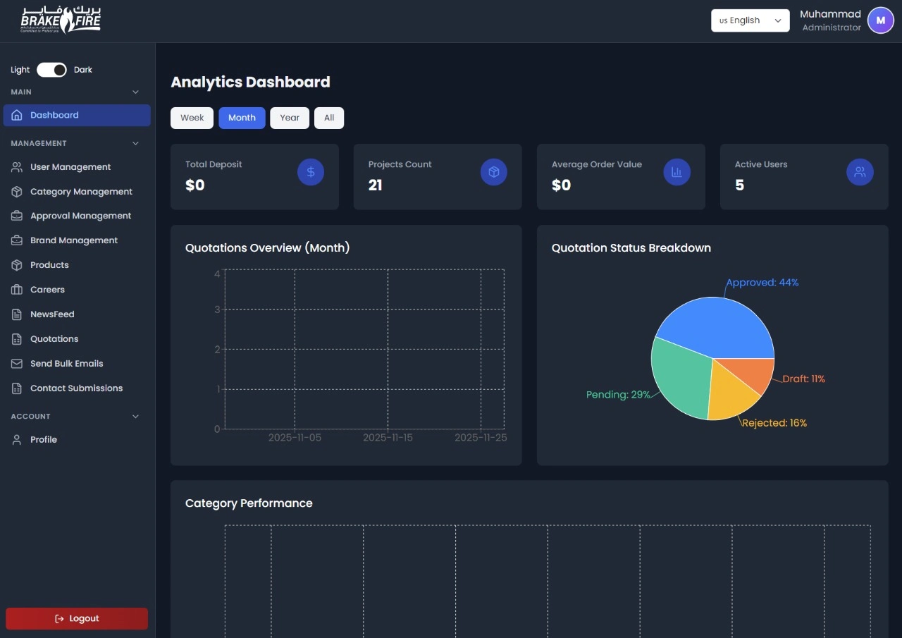 I designed and developed Brakefire, a full fire-safety service platform featuring a multilingual Next.js website, advanced product catalog, and admin dashboard.