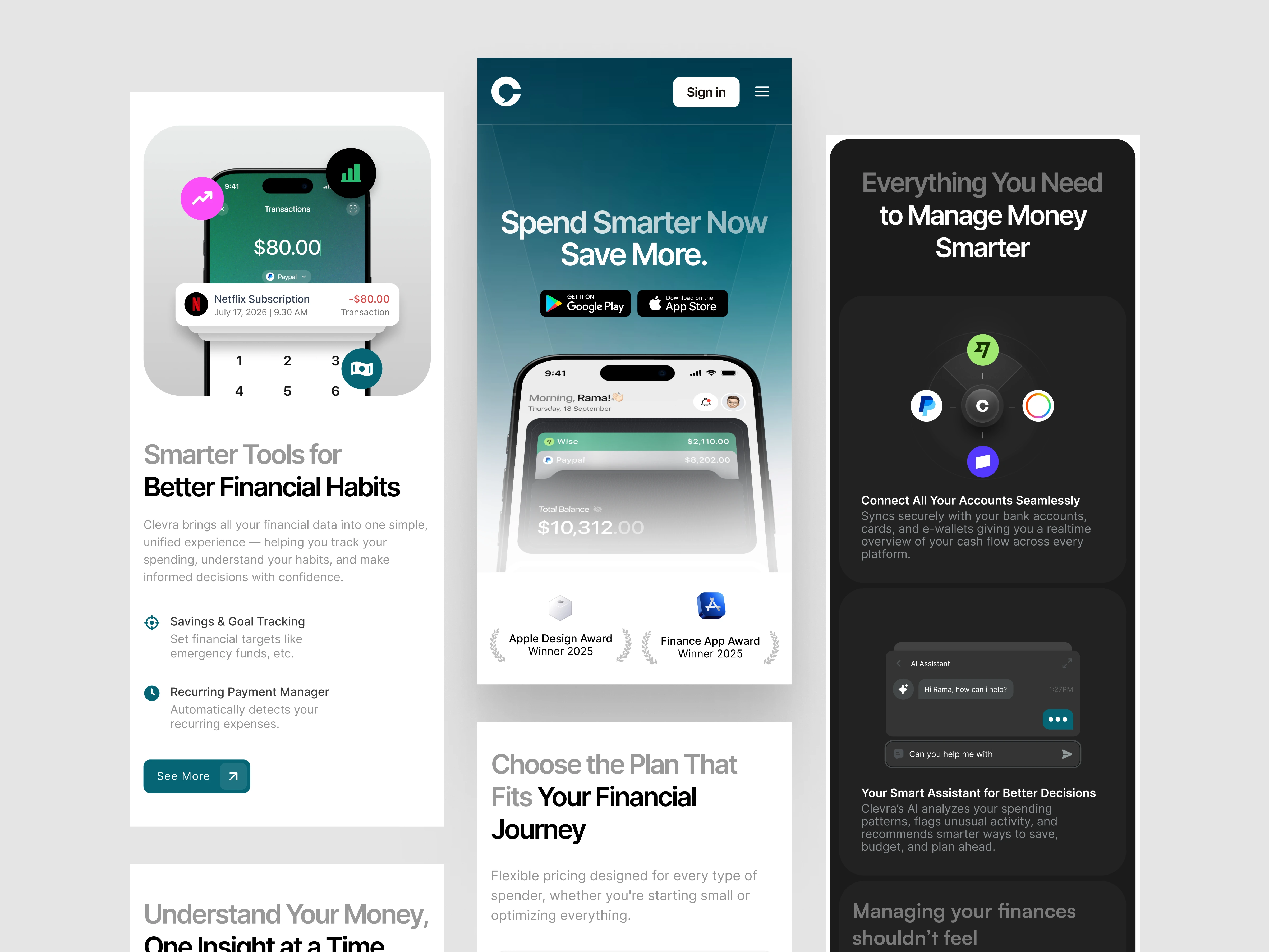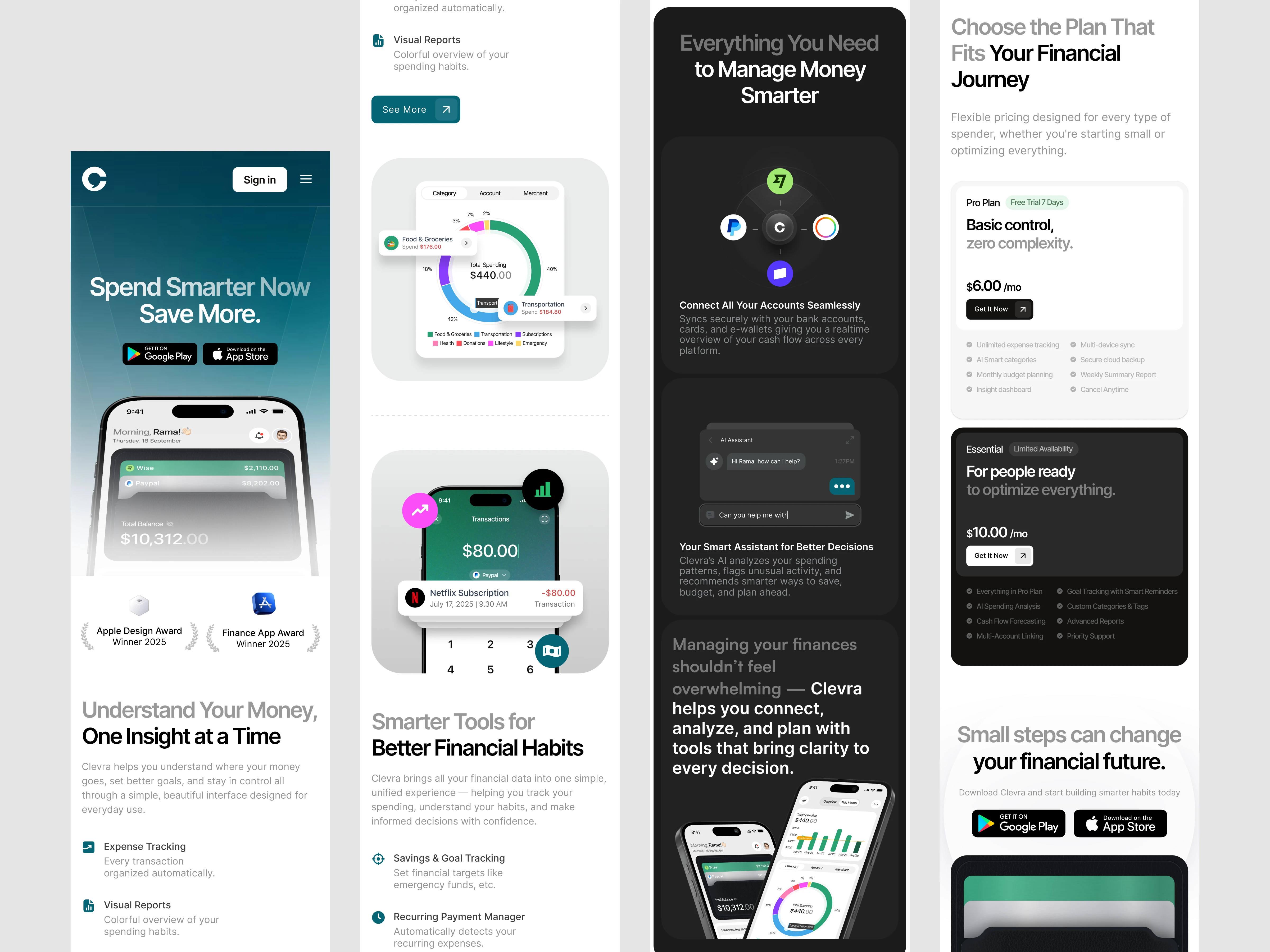 By transforming Clevra into a mobile responsive layout, the landing page now supports smoother cross device experiences. Users can explore insights, compare plans, and understand their finances easily while on the go. The result is a consistent and thoughtful mobile version that maintains clarity across all screen sizes.